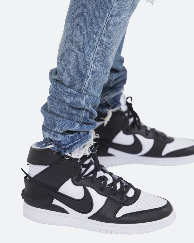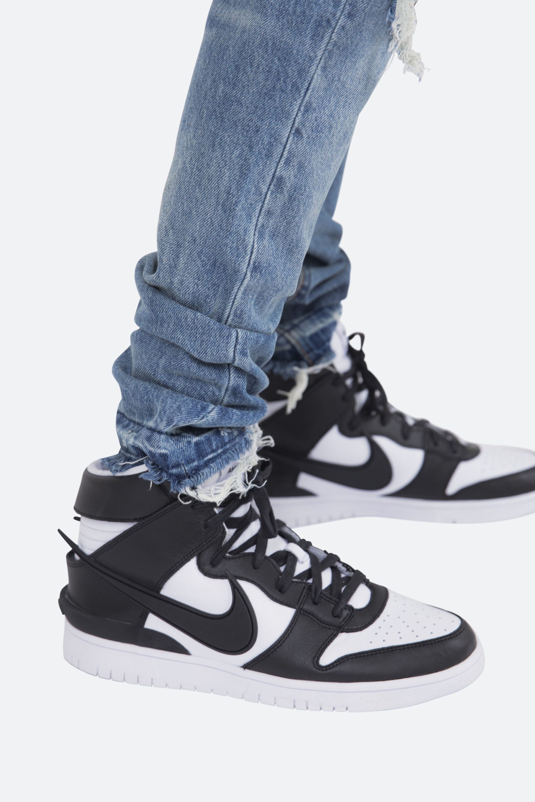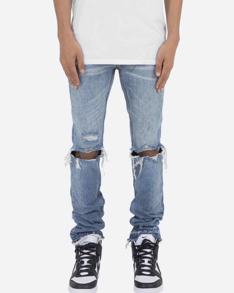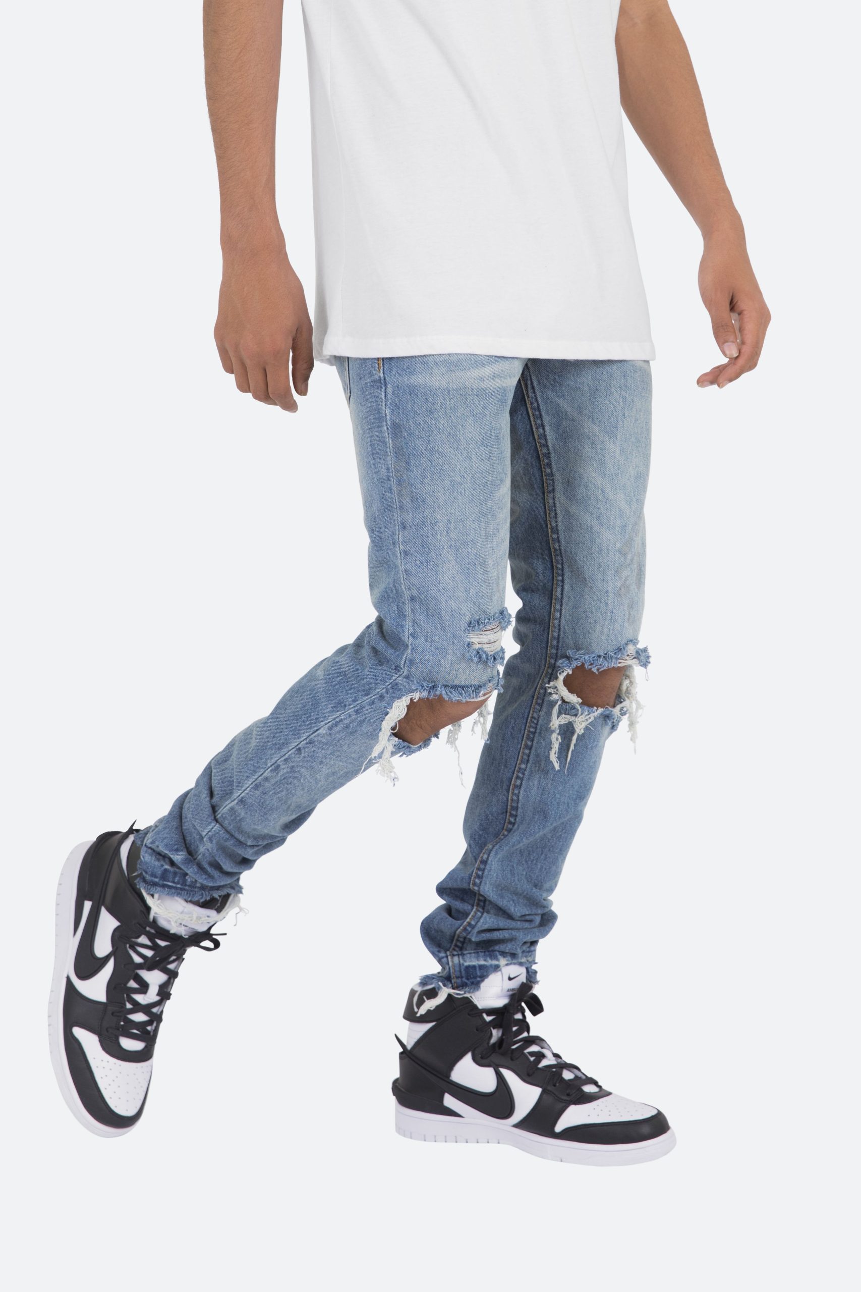 the M345 Denim is part of our new M300 line of zipperless M Denim. The M345 Denim features a relaxed fit through the thigh that tapers from the knee to the ankle. distressed details at the knees and finishes off with a traditional zipperless inseam.