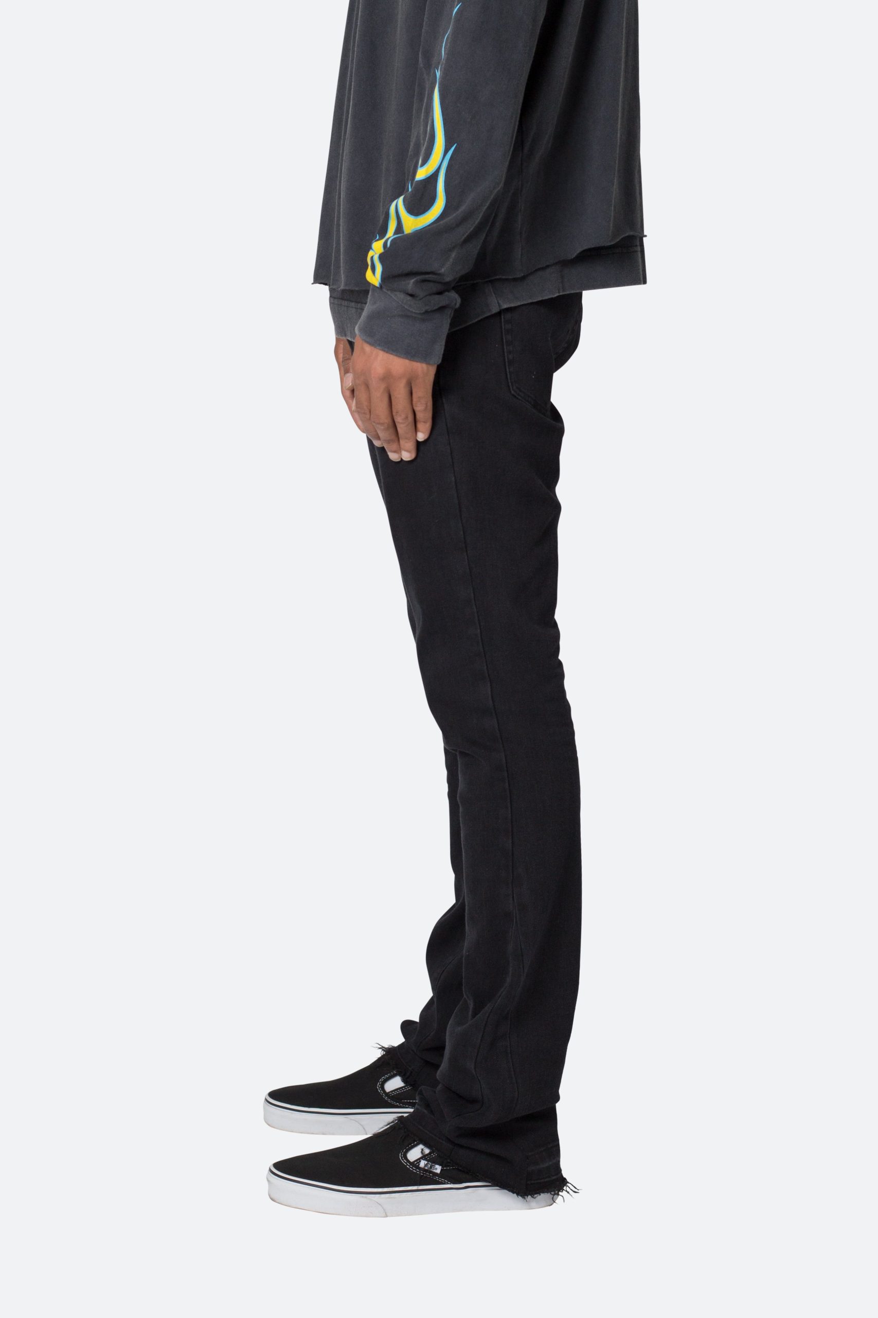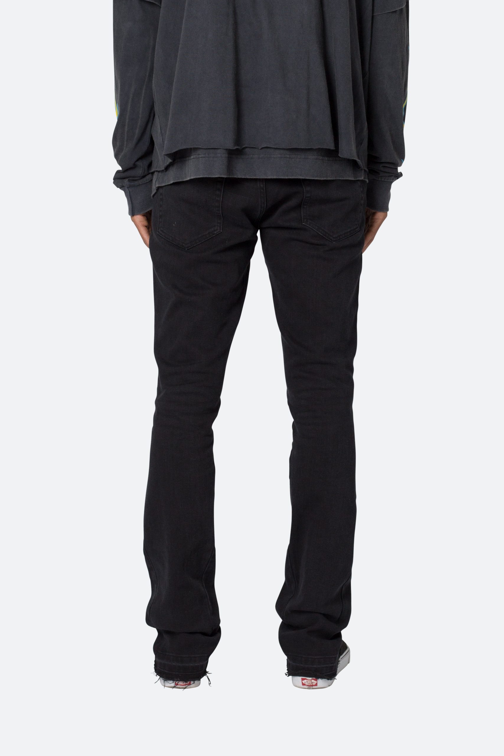 the M524 Slim Stacked Denim is designed with our M fit which is slim throughout with an extended inseam for stacking and a flare at the leg opening. constructed from stretch denim. and finished with a light garment wash for improved hand feel.