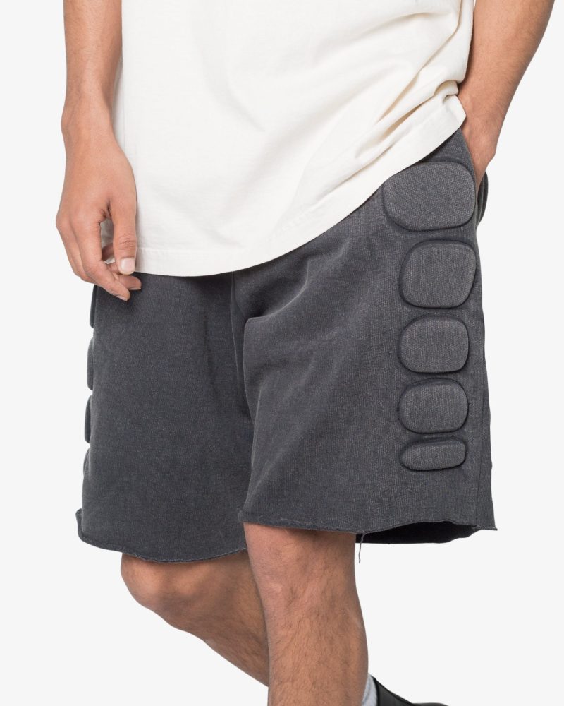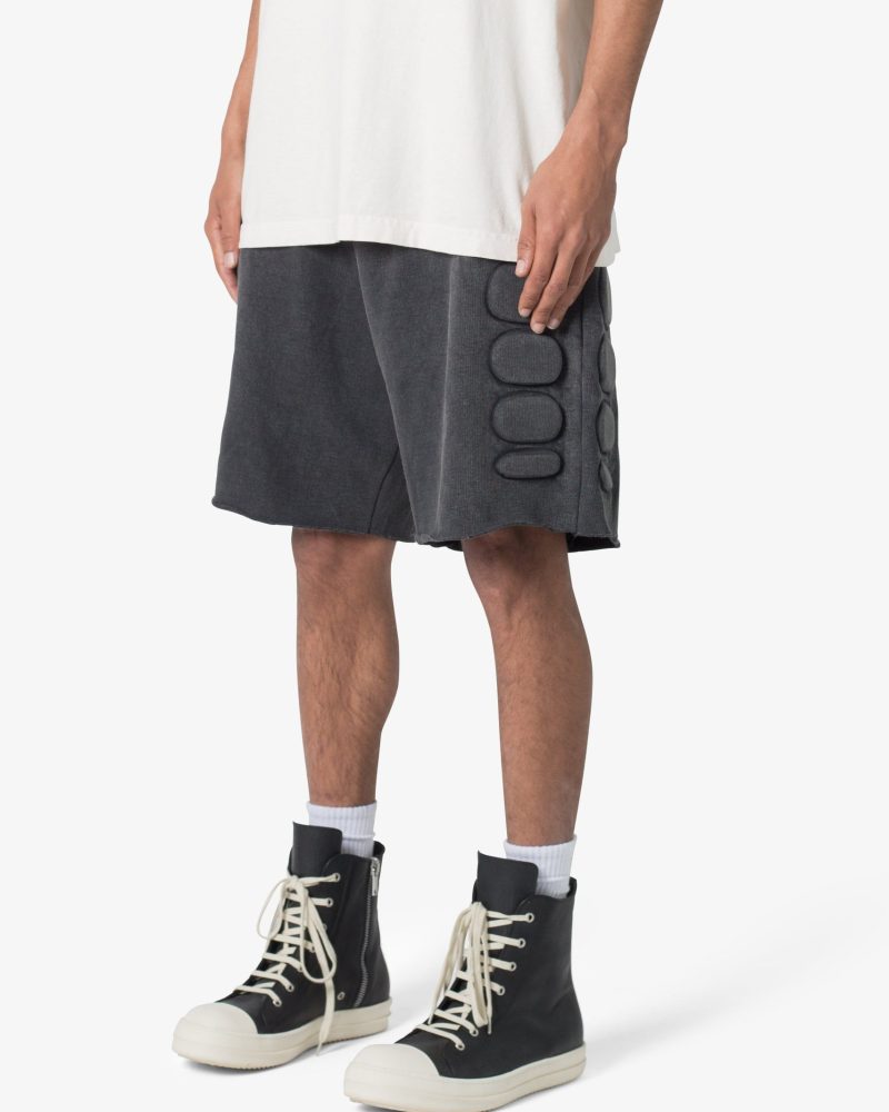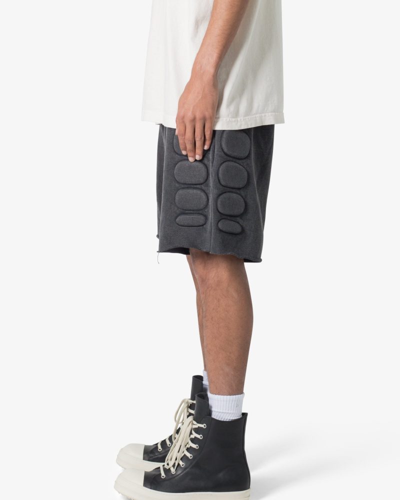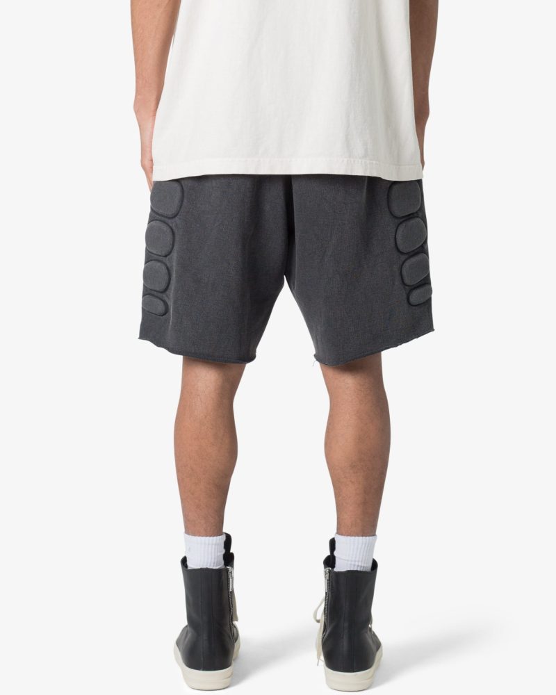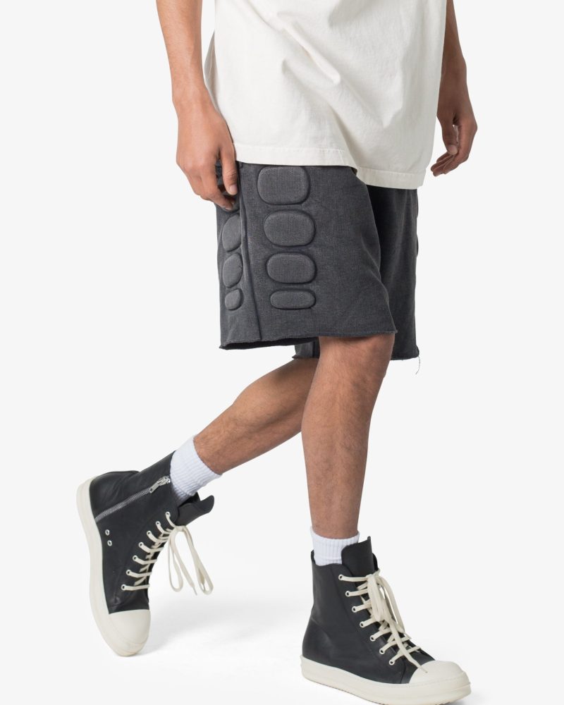 the Moto Padded Sweatshorts are constructed with a custom-knit cotton fleece fabric in a relaxed fit. The shorts feature an elasticized waist in self fabric. welt pockets at the outseam. and a cotton drawstring on the inside of the shorts. padded moto inspired details at the outseam. and finished with a raw edge leg opening.