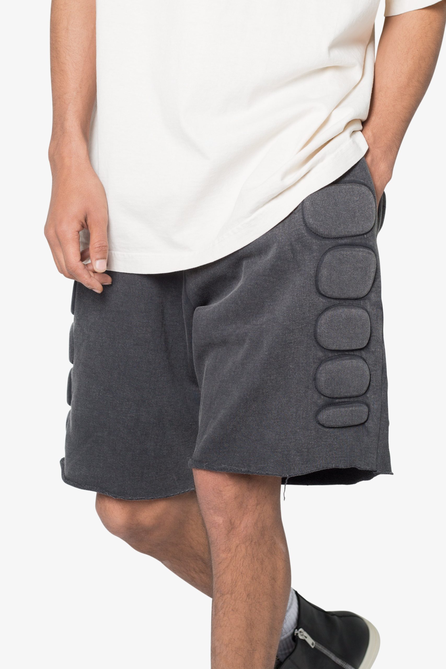 the Moto Padded Sweatshorts are constructed with a custom-knit cotton fleece fabric in a relaxed fit. The shorts feature an elasticized waist in self fabric. welt pockets at the outseam. and a cotton drawstring on the inside of the shorts. padded moto inspired details at the outseam. and finished with a raw edge leg opening.