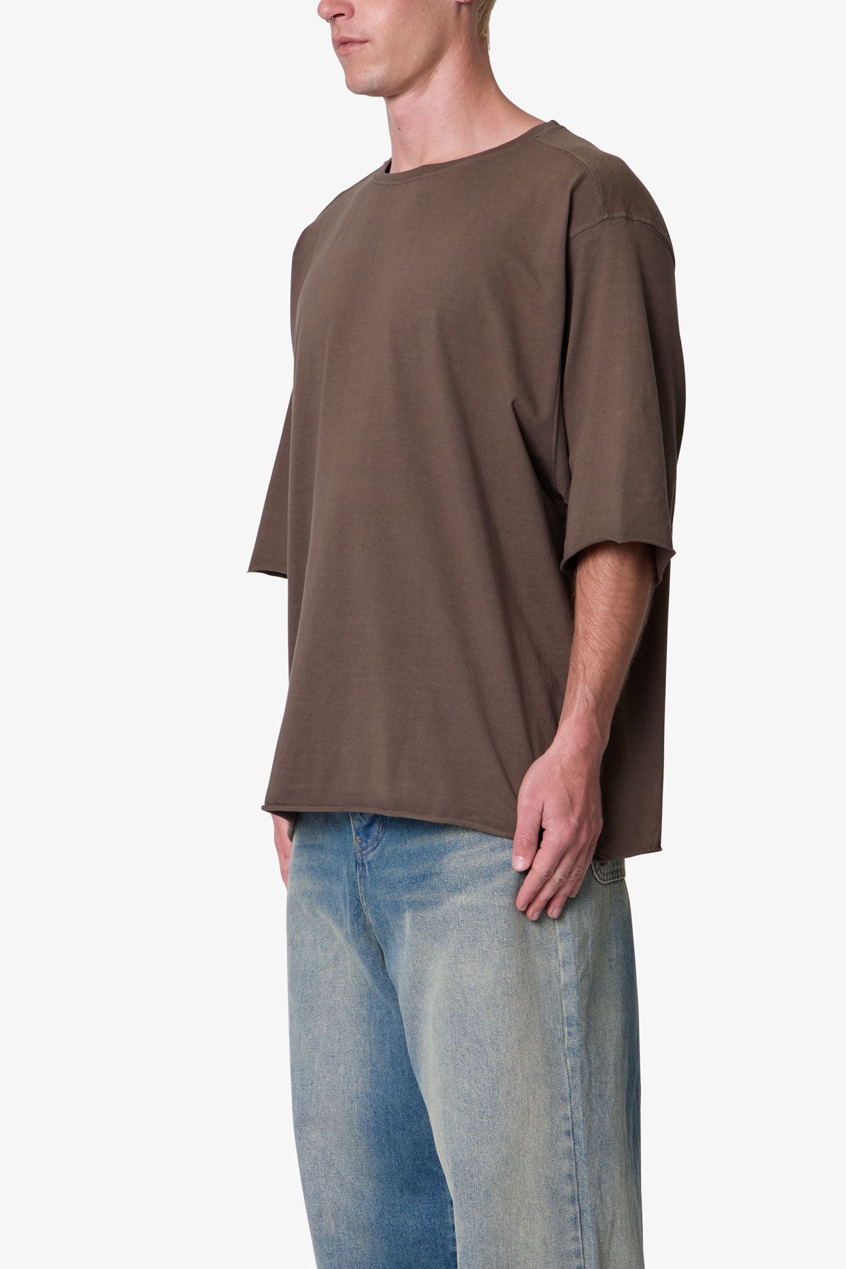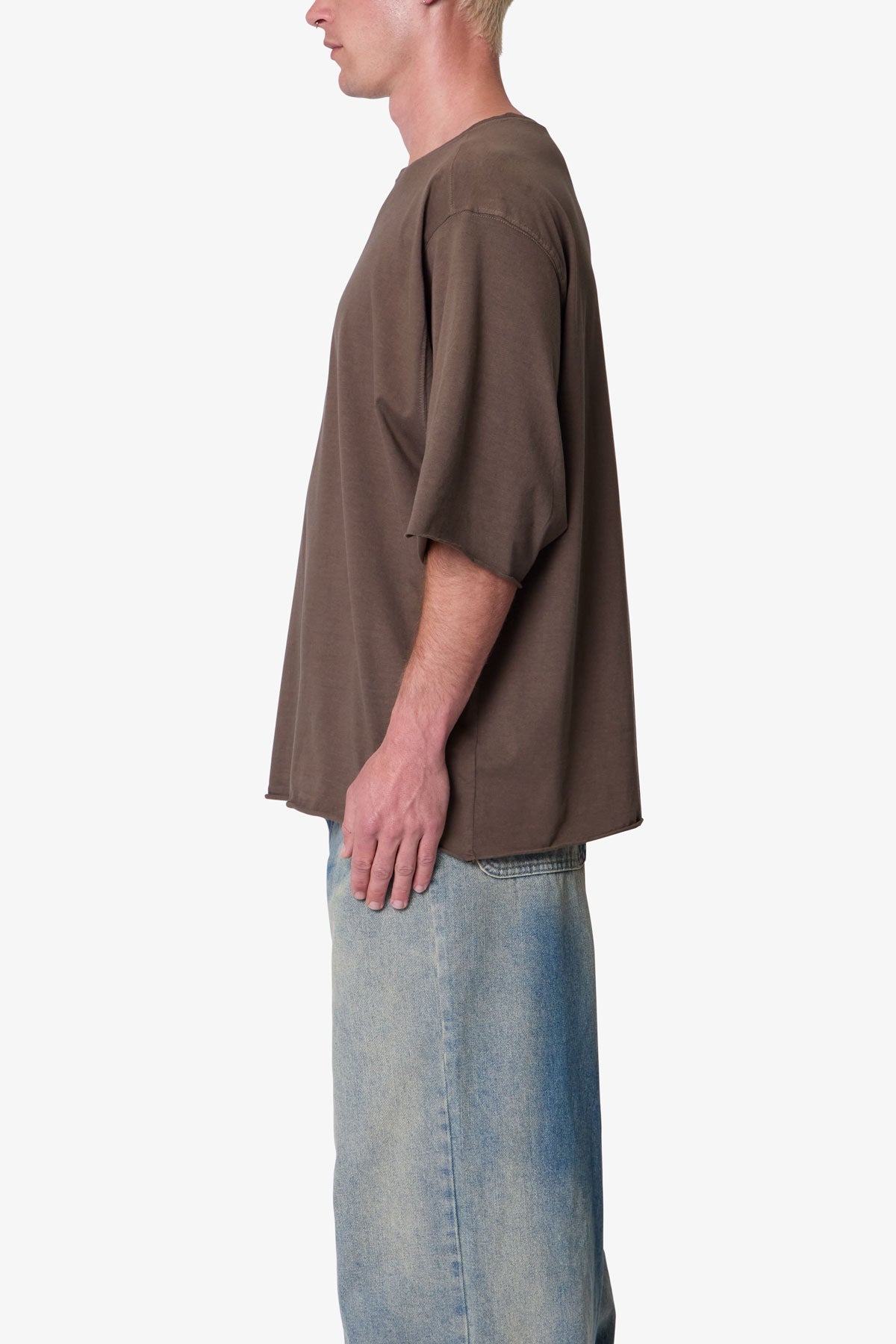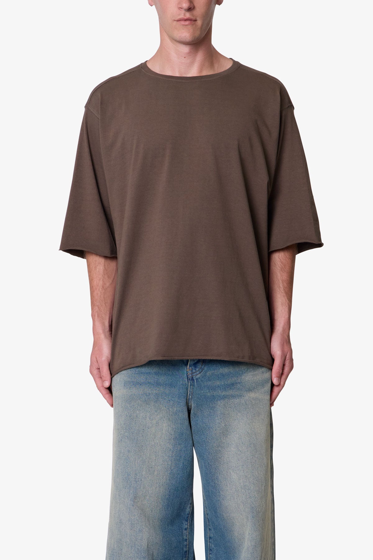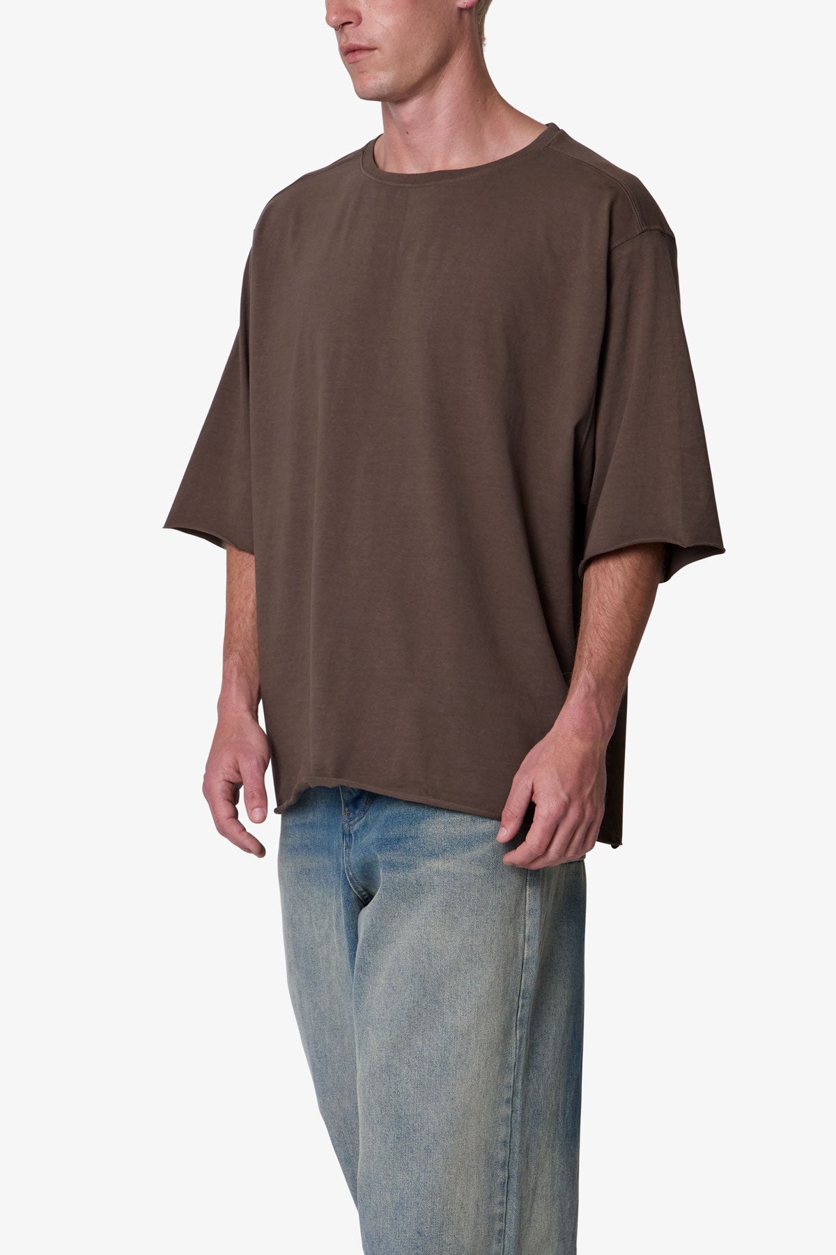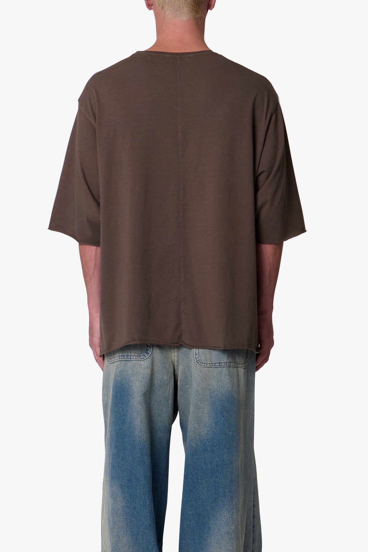 the OG Oversized Tee features a flat. raw. hem line and an extended sleeve length for a cropped. oversized fit. a center seam down the wearers back. and is finished in a garment washed cotton fabric.
