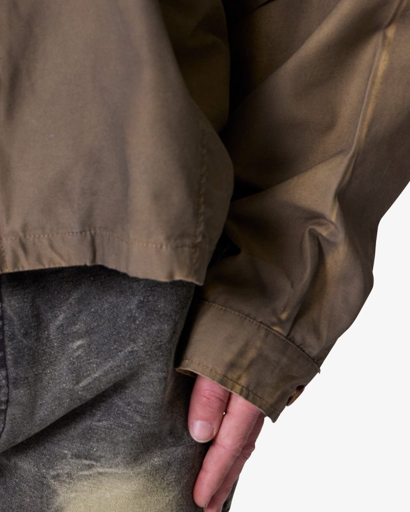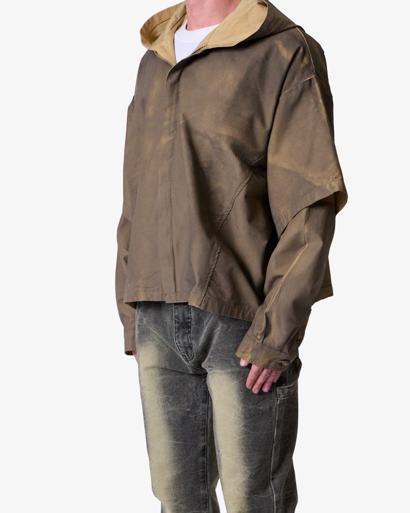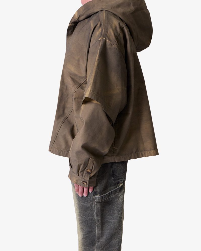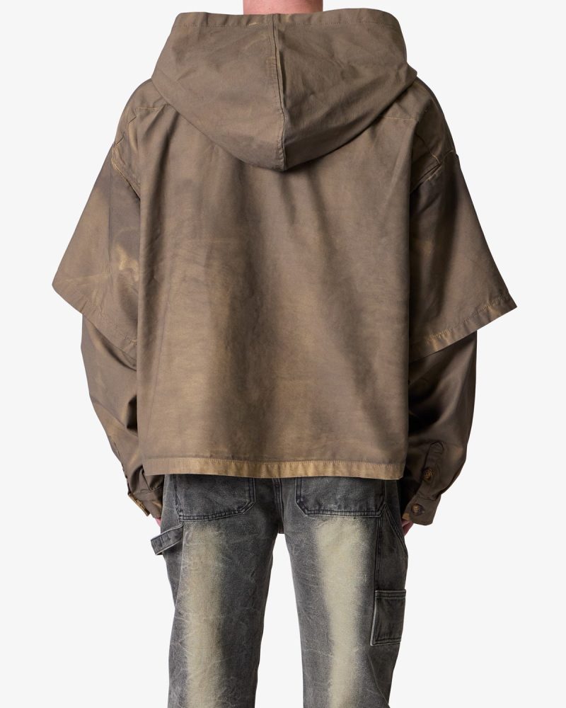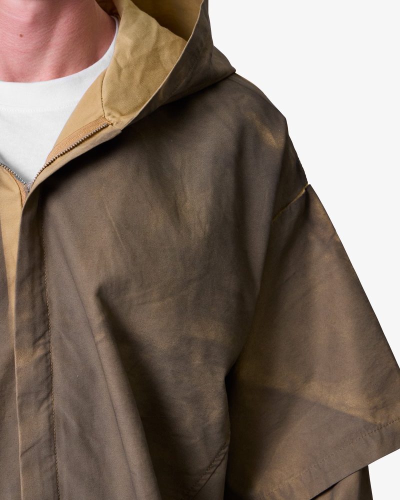 the Oiled Hunting Poncho Jacket is designed in a relaxed fit from a 100% cotton twill fabric. button closure at the wrists on the base layer. short sleeves on top of the base long sleeves for a layered appearance. and finished with an oil wash.