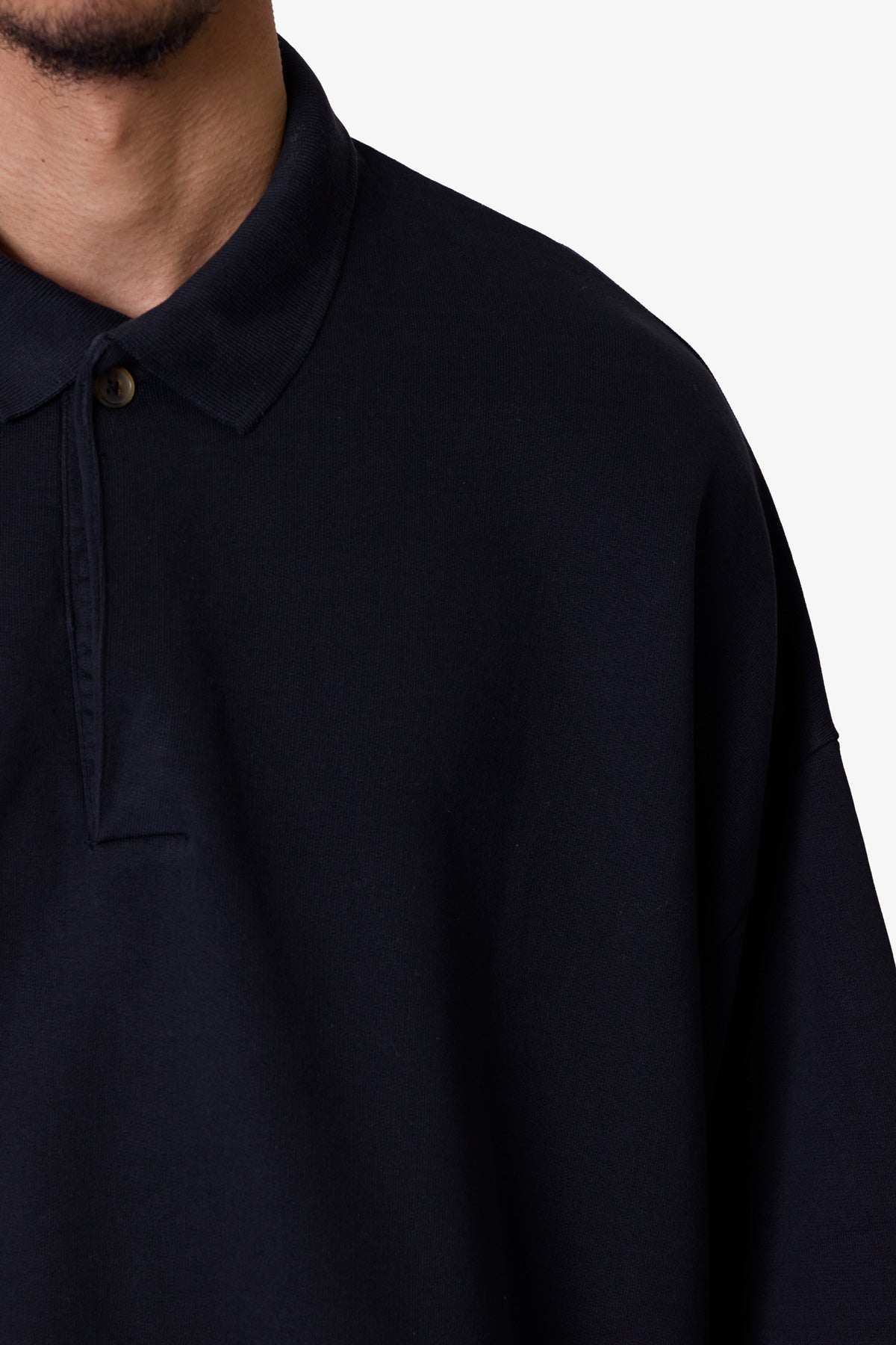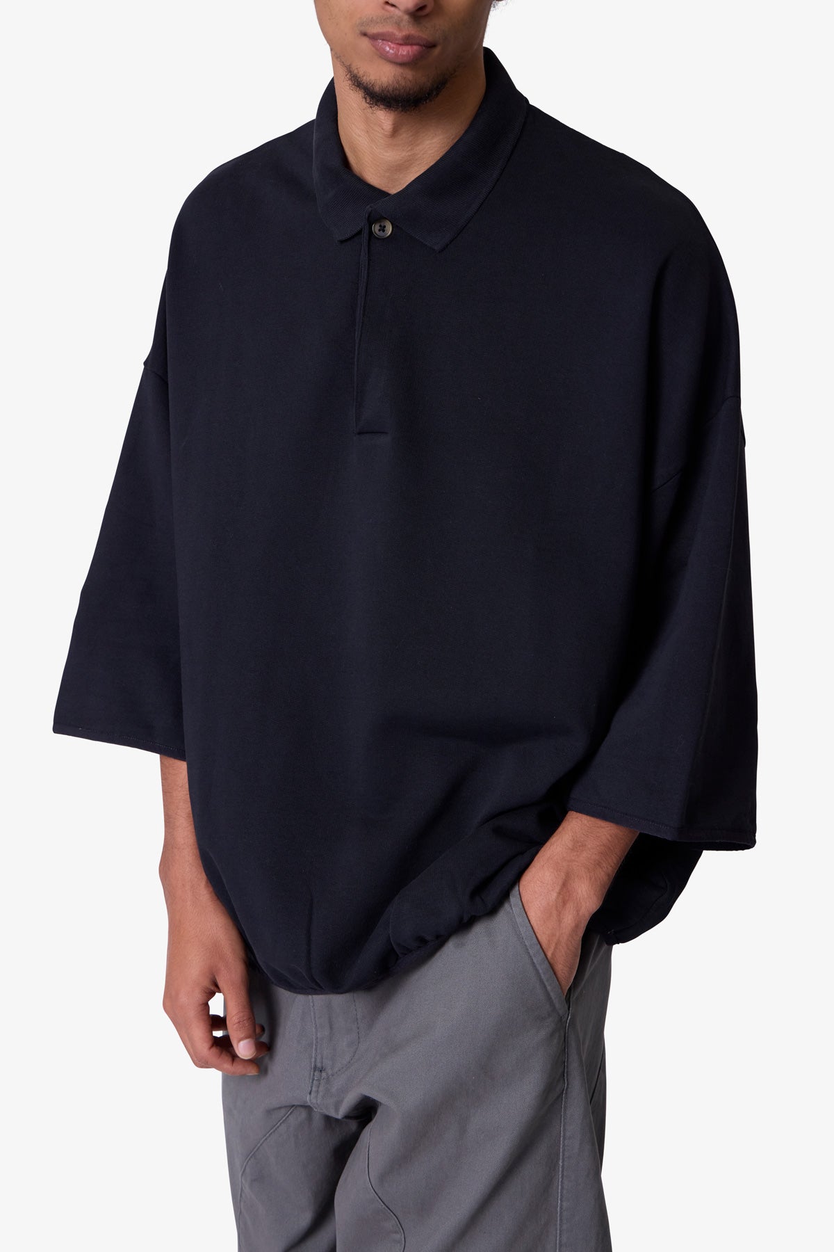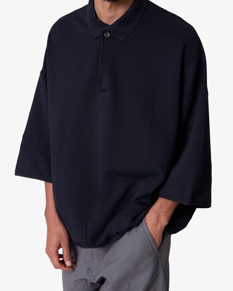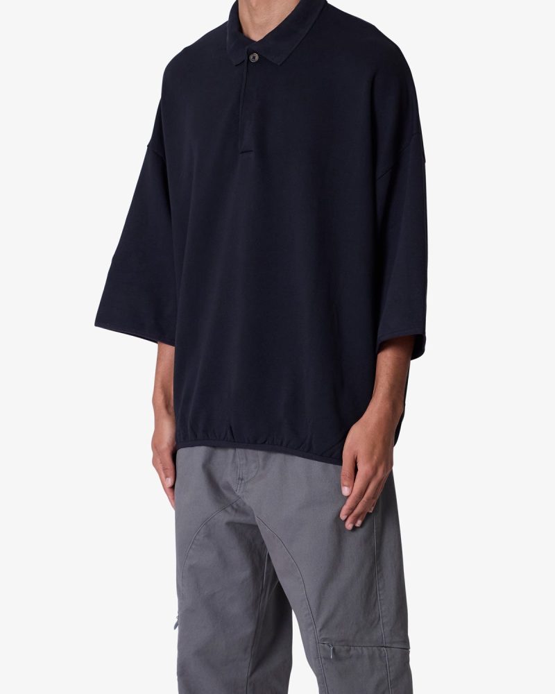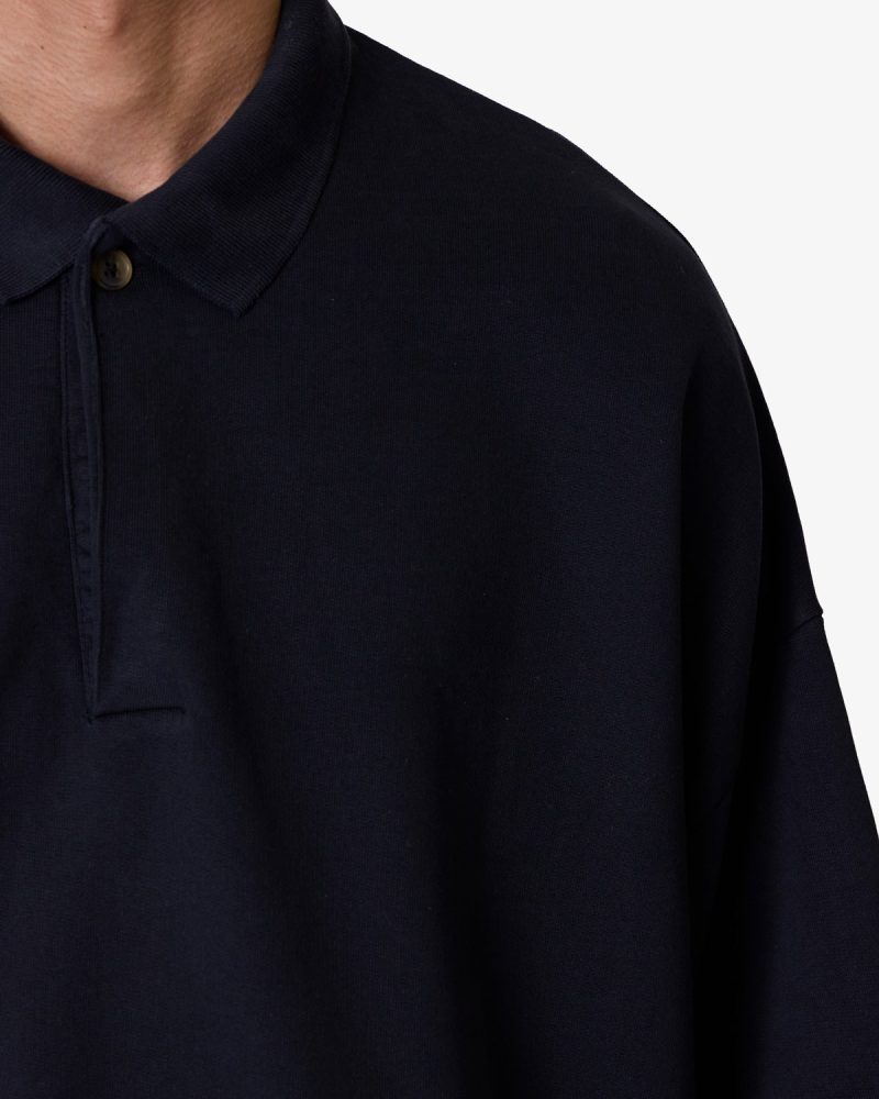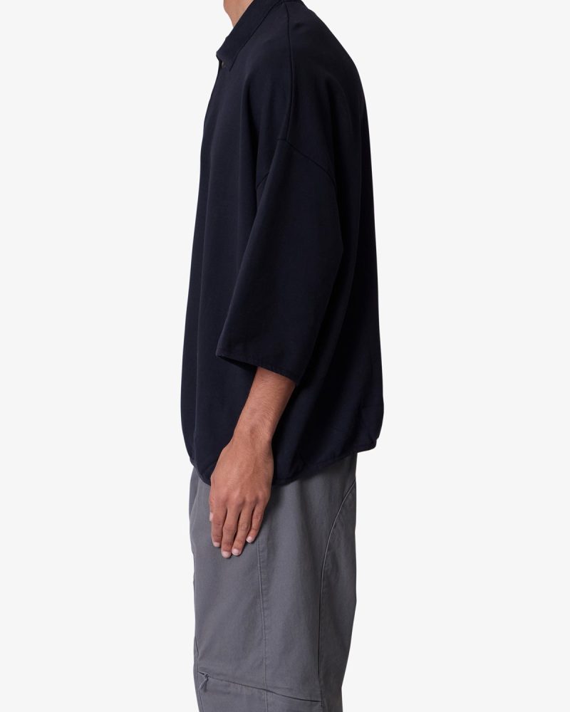 the Oversized Knit Polo S/S Shirt is a 100% cotton shirt that is constructed from jersey knit with a vintage wash. With a tonal collar and placket. and finished with a flat hem with tonal taping at the waist and sleeves.