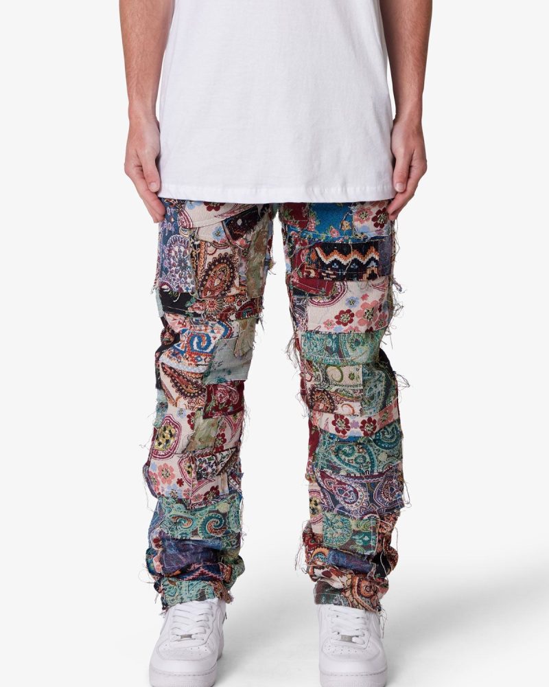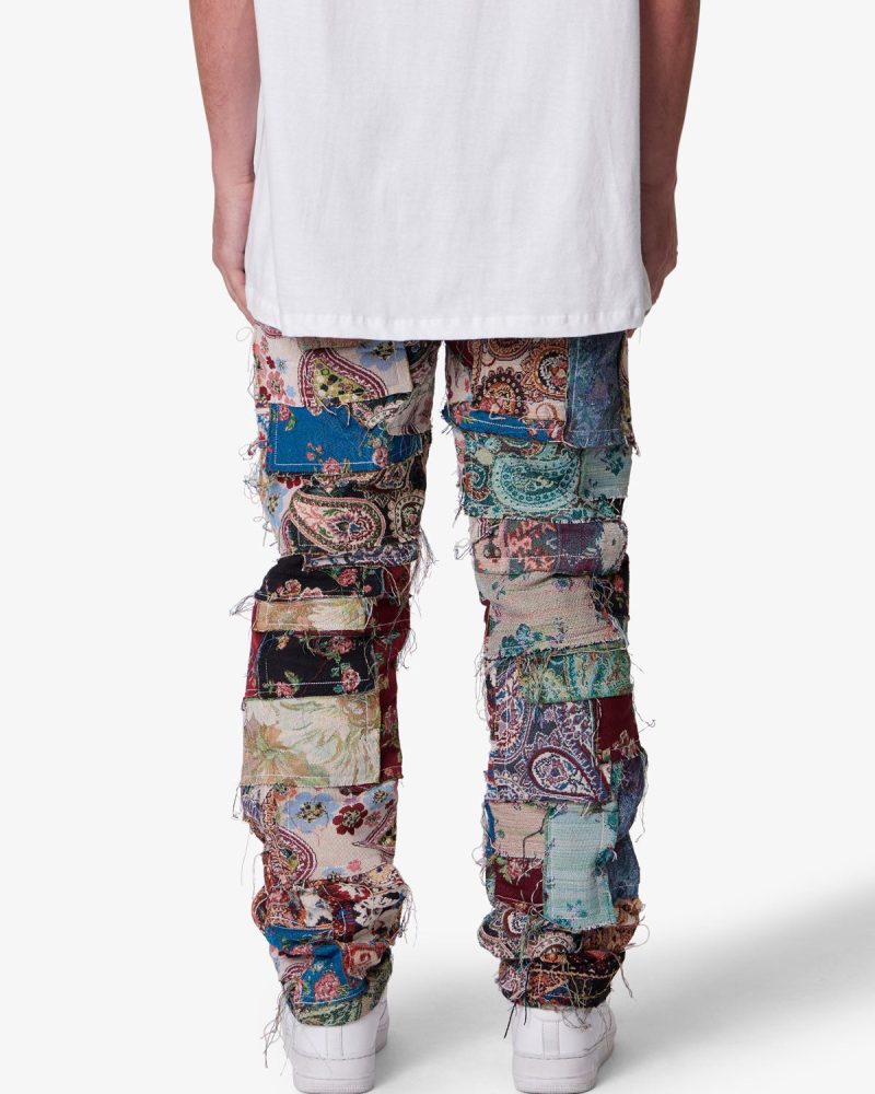 the Paneled Blanket Pants are designed with a relaxed fit throughout. five pocket pant details. constructed from patchwork panels of custom jacquard woven blanket pieces. and finished with a rinse wash..