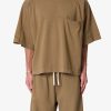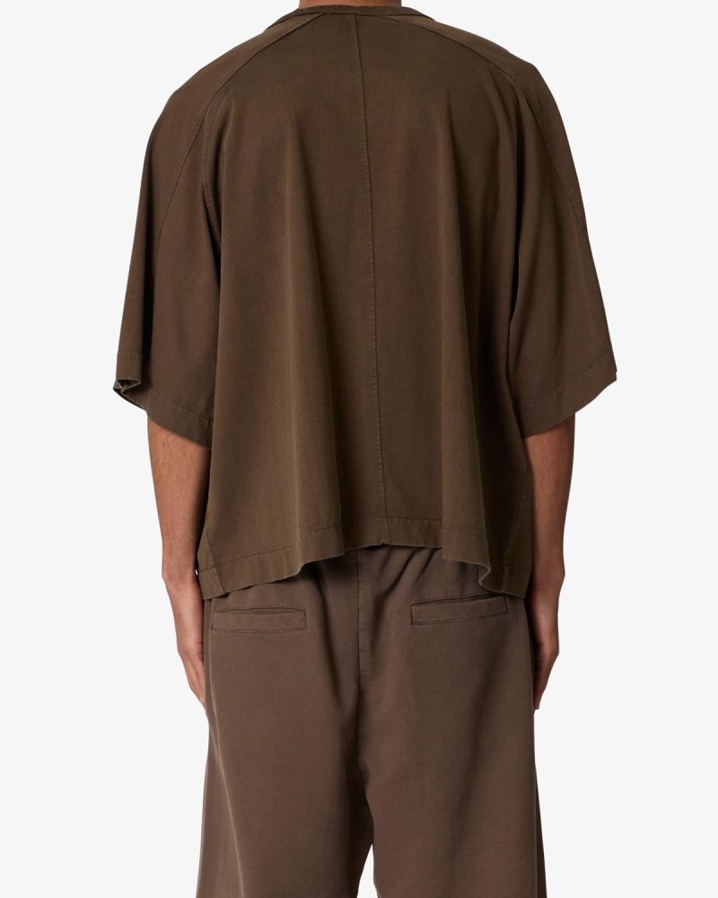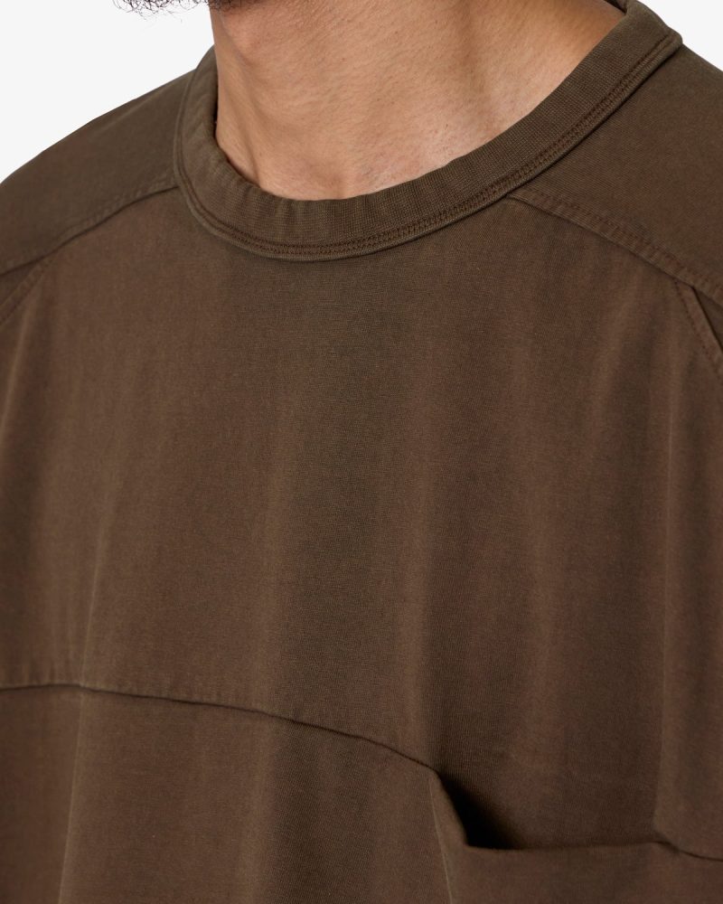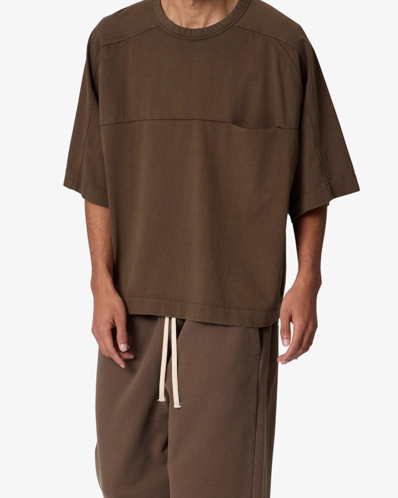 the Paneled Hidden Pocket Tee features a flat hem line and an extended shoulder seam for a relaxed. dropped shoulder fit. constructed from a washed cotton fabric. panel across the chest with an integrated pocket. and finished with an exaggerated oversized fit.