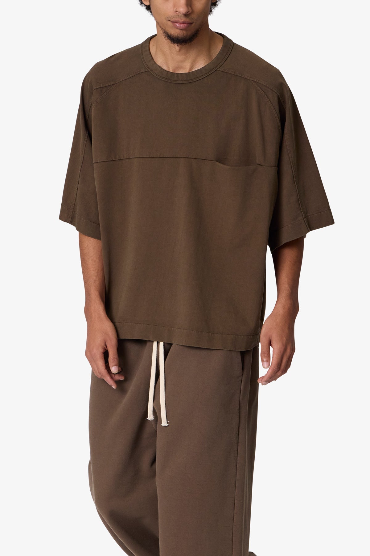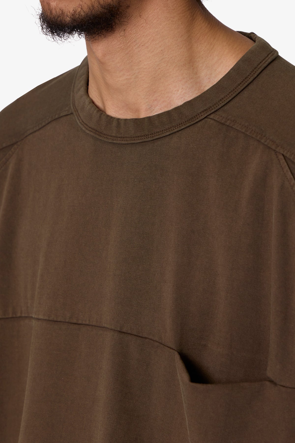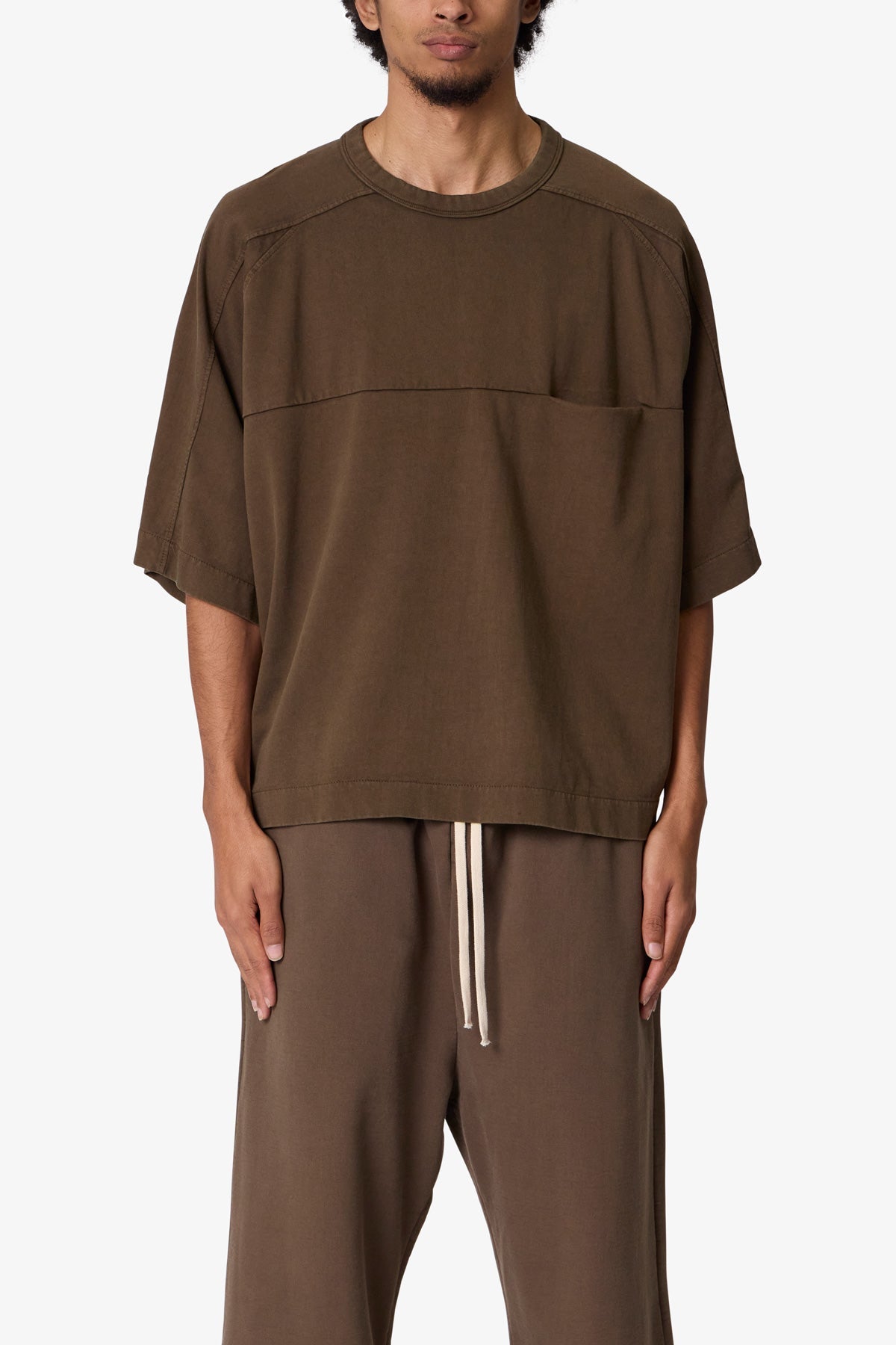 the Paneled Hidden Pocket Tee features a flat hem line and an extended shoulder seam for a relaxed. dropped shoulder fit. constructed from a washed cotton fabric. panel across the chest with an integrated pocket. and finished with an exaggerated oversized fit.