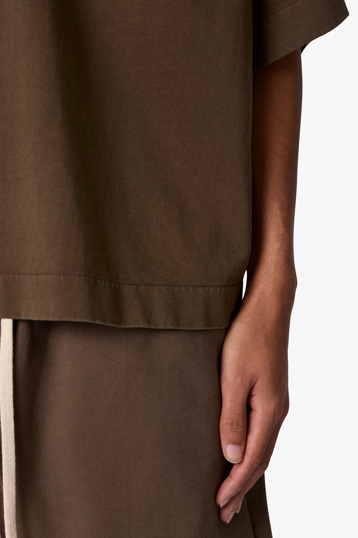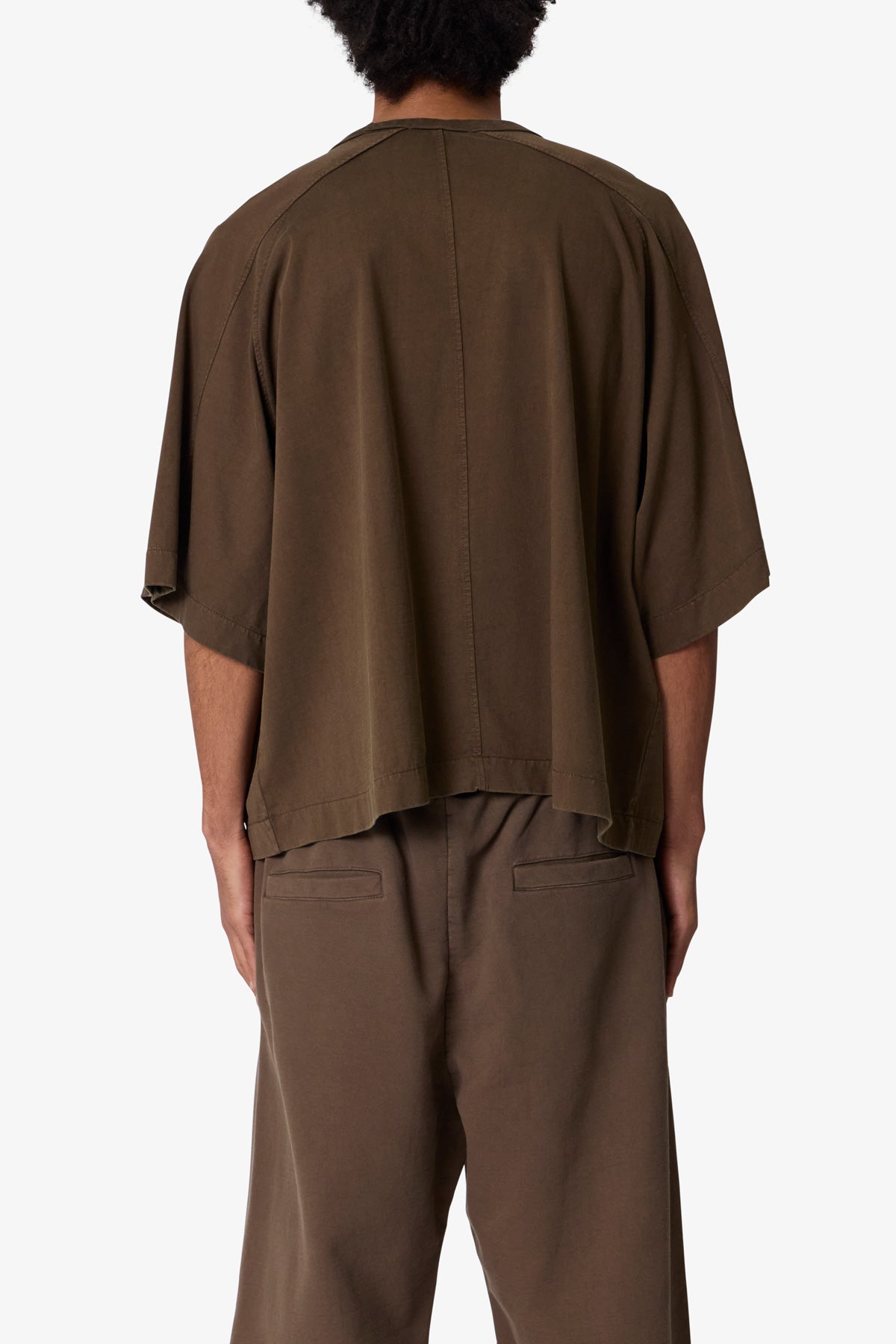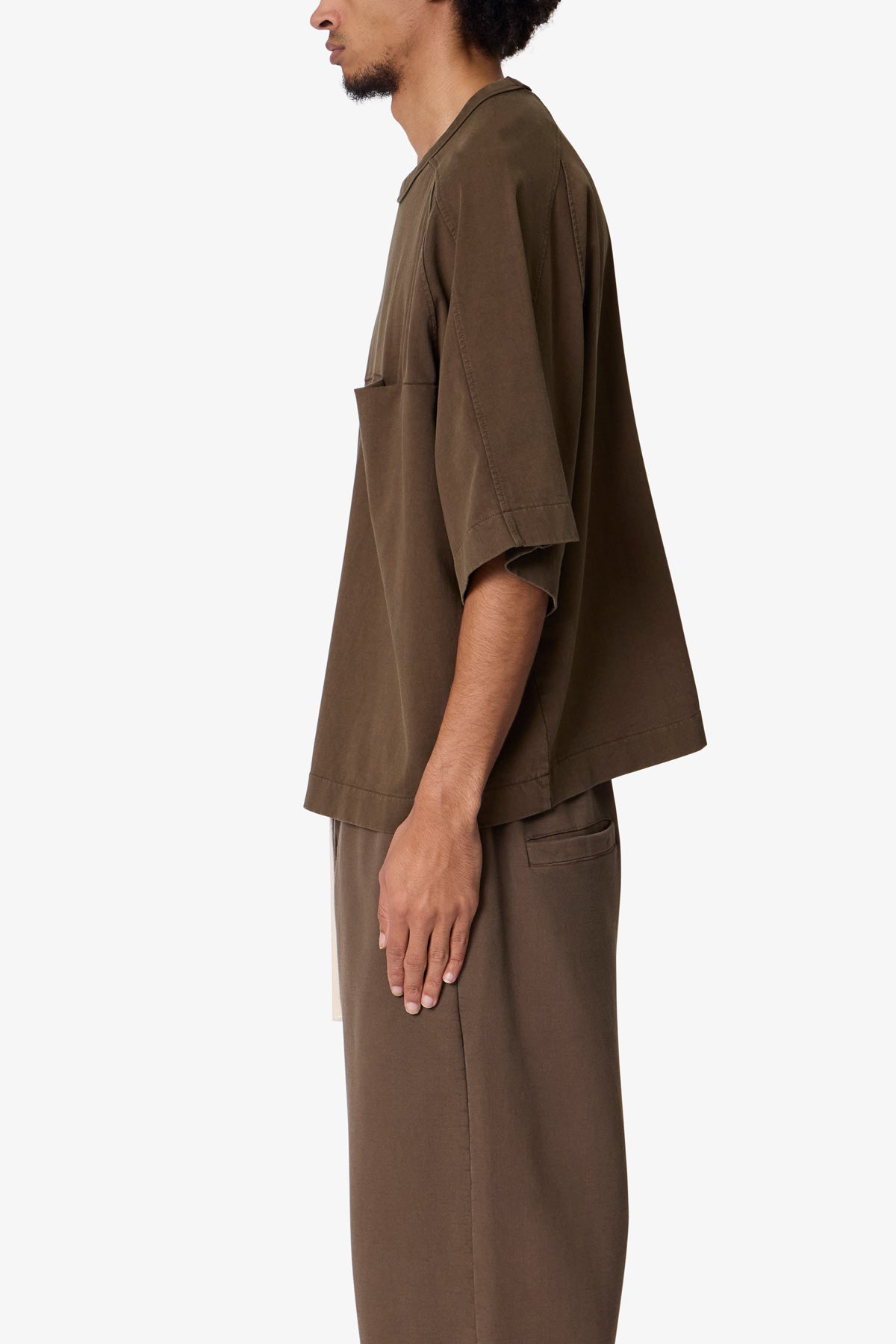 the Paneled Hidden Pocket Tee features a flat hem line and an extended shoulder seam for a relaxed. dropped shoulder fit. constructed from a washed cotton fabric. panel across the chest with an integrated pocket. and finished with an exaggerated oversized fit.