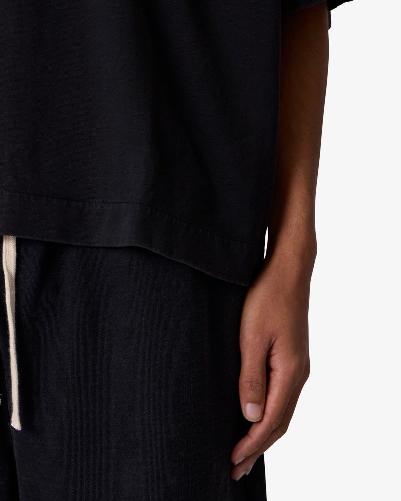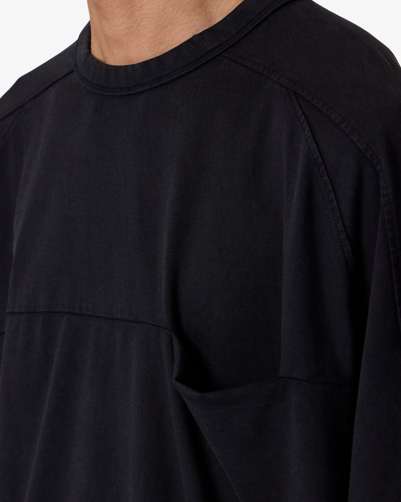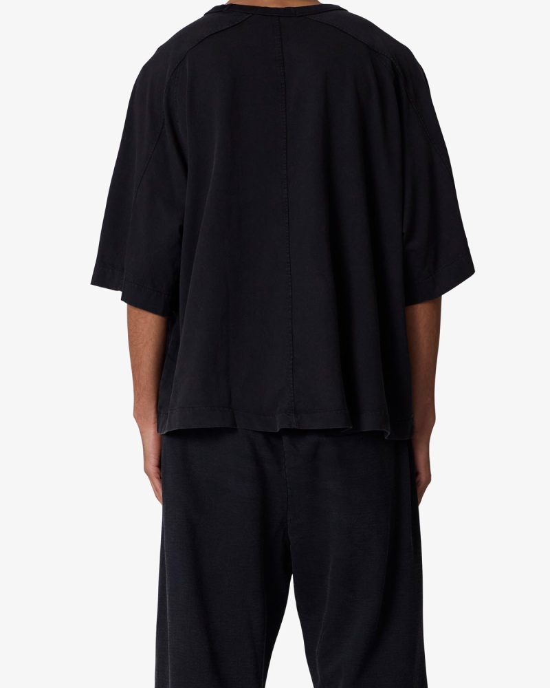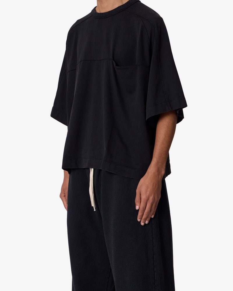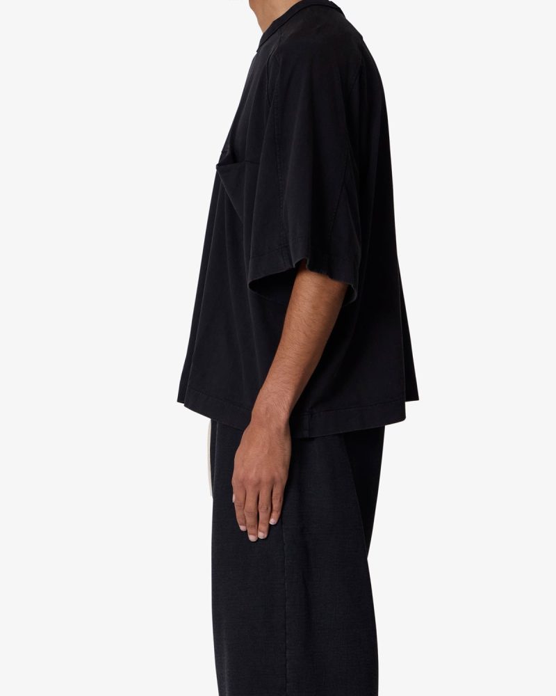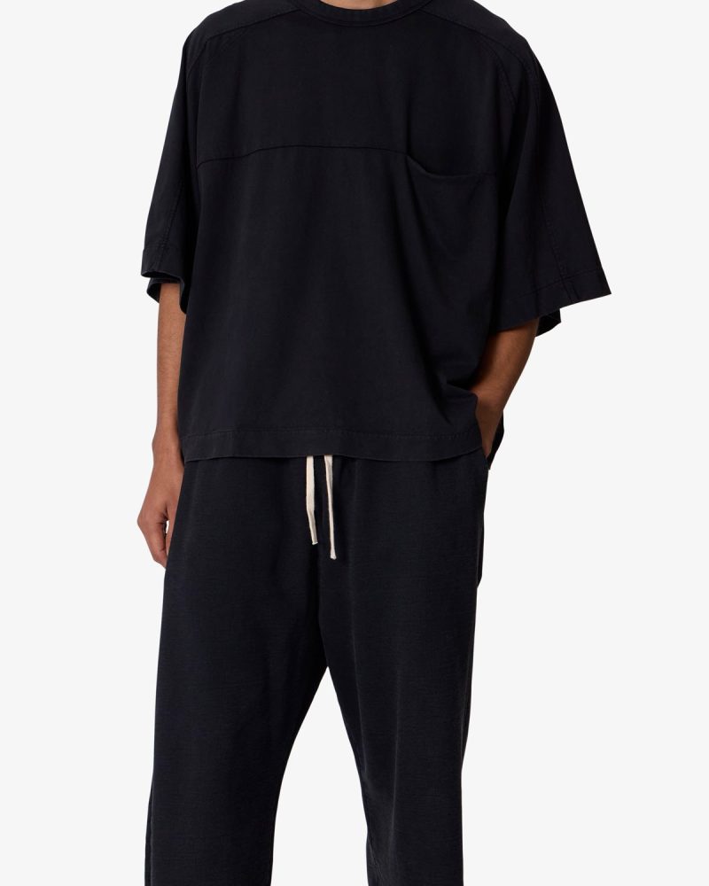 the Paneled Hidden Pocket Tee features a flat hem line and an extended shoulder seam for a relaxed. dropped shoulder fit. constructed from a washed cotton fabric. panel across the chest with an integrated pocket. and finished with an exaggerated oversized fit.