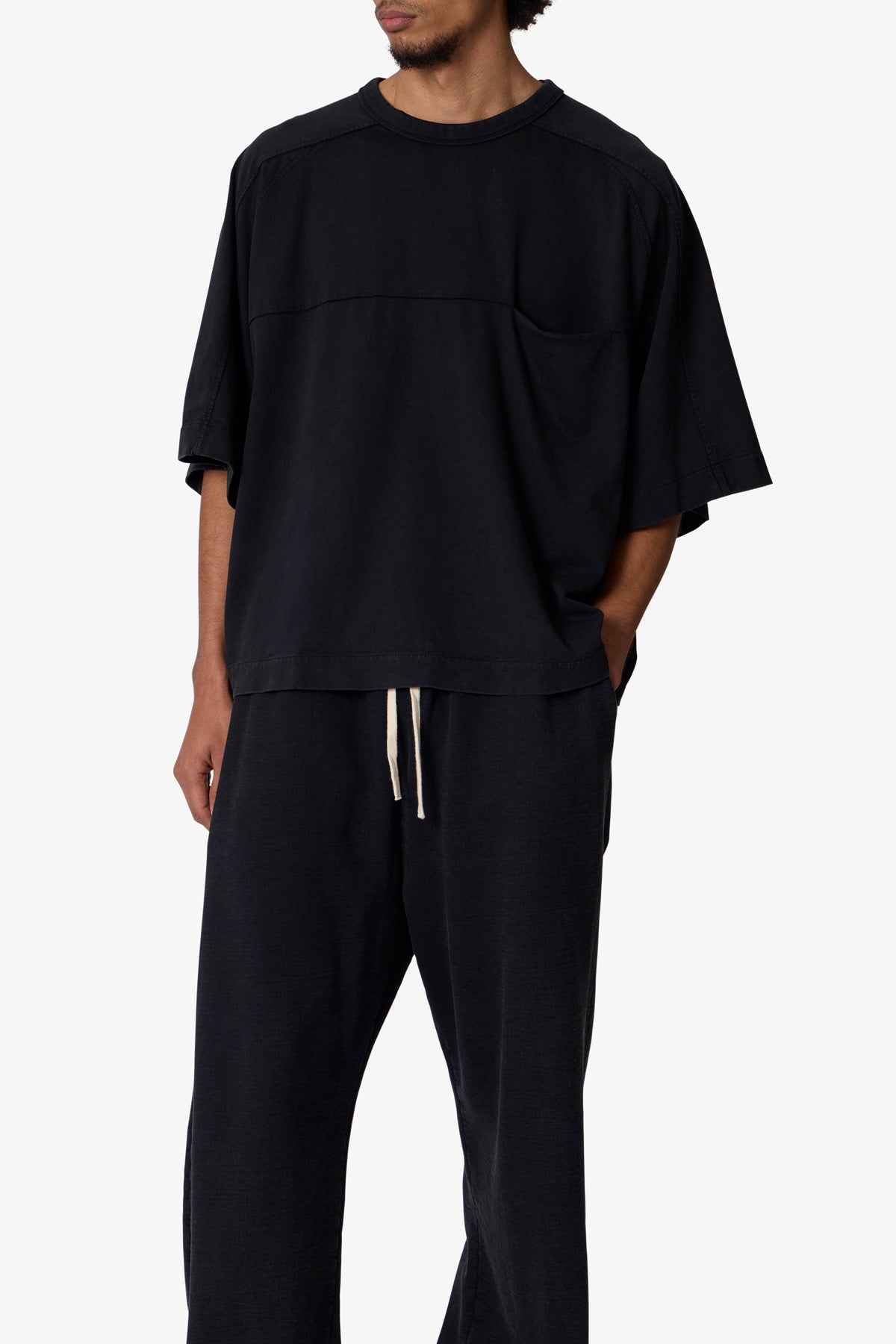 the Paneled Hidden Pocket Tee features a flat hem line and an extended shoulder seam for a relaxed. dropped shoulder fit. constructed from a washed cotton fabric. panel across the chest with an integrated pocket. and finished with an exaggerated oversized fit.