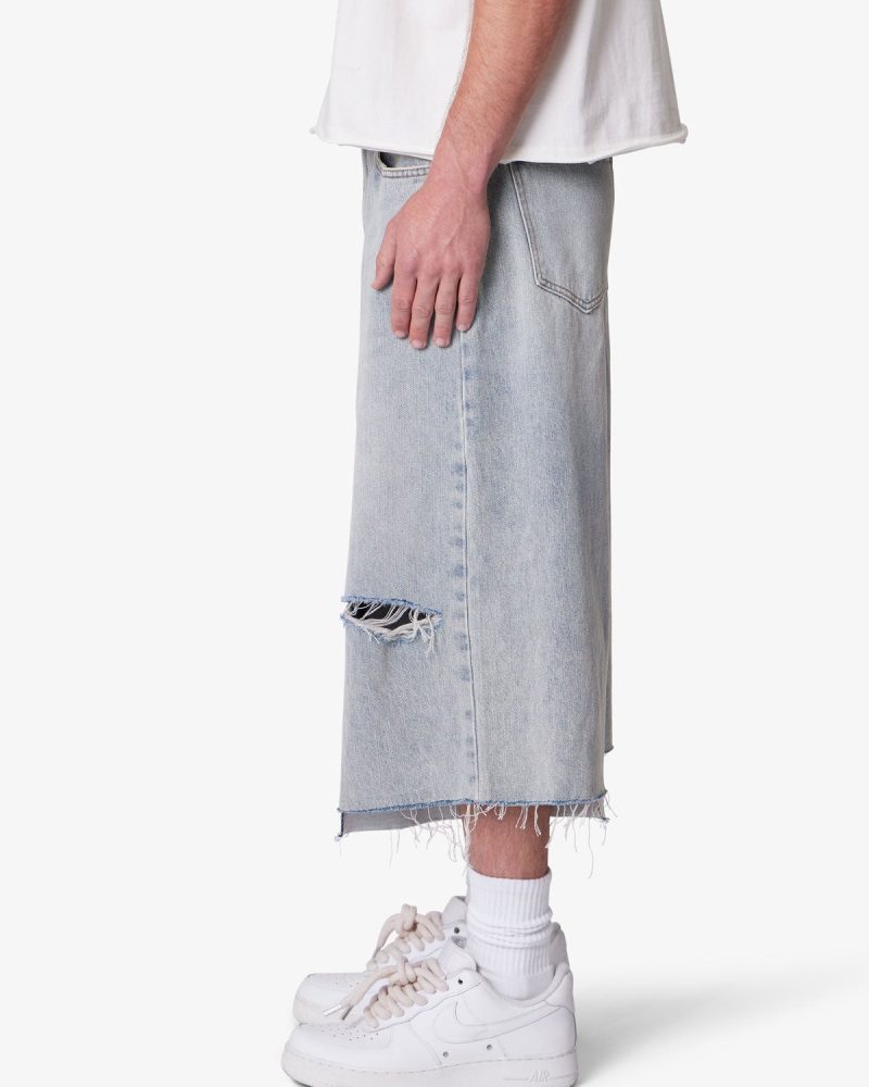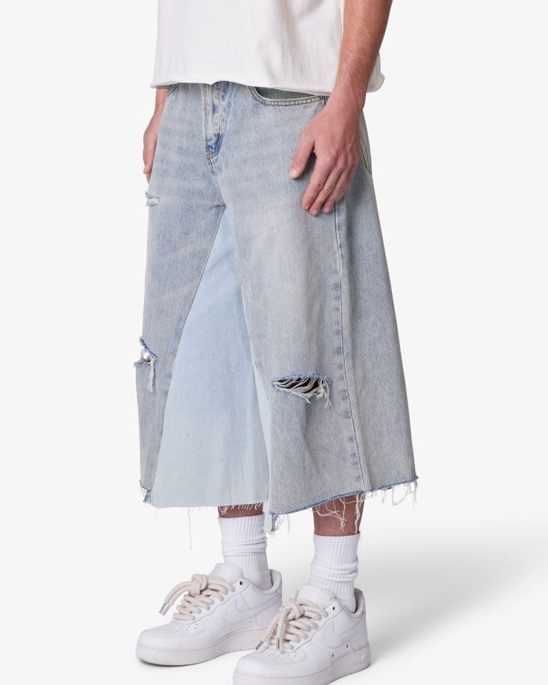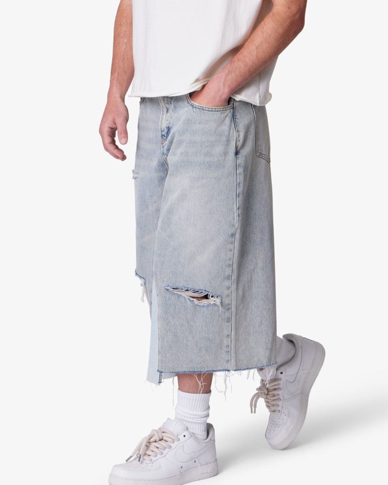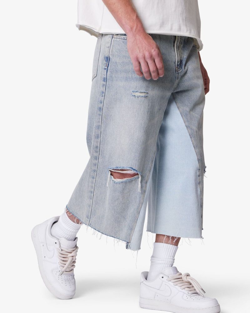 Constructed from an cotton-polye blend denim. the Panelled Denim Shorts features a washed light blue denim with a vintage. slightly faded look. Designed in a baggy. loose A-line fit. the shorts include contrast inseam panels. raw hem edges. distressing. and two hole blowouts. The Panelled Denim Shorts are finished with classic five-pocket styling. a metal button. and zipper fly closure.