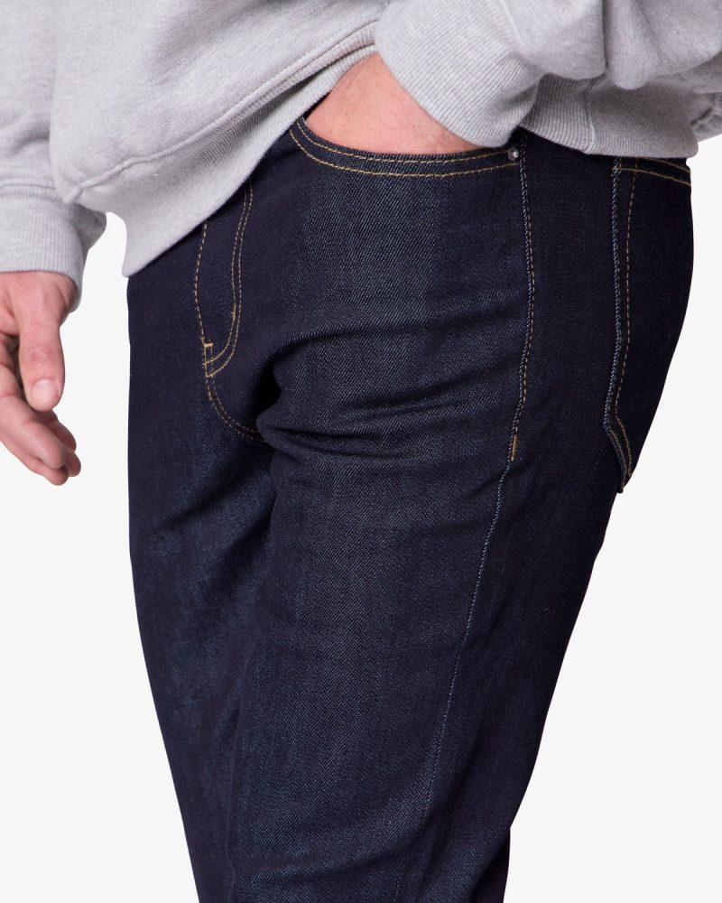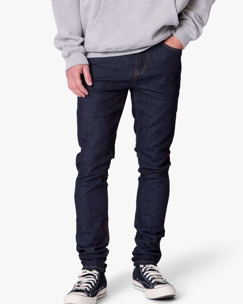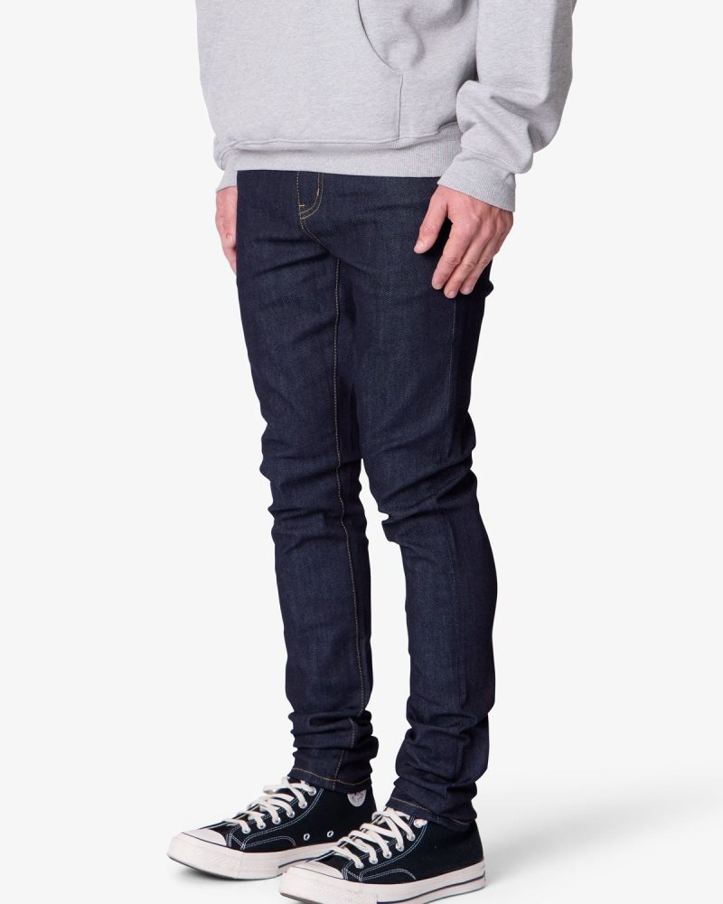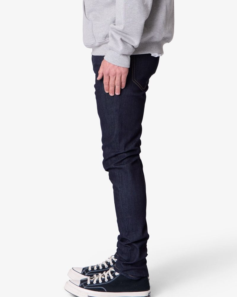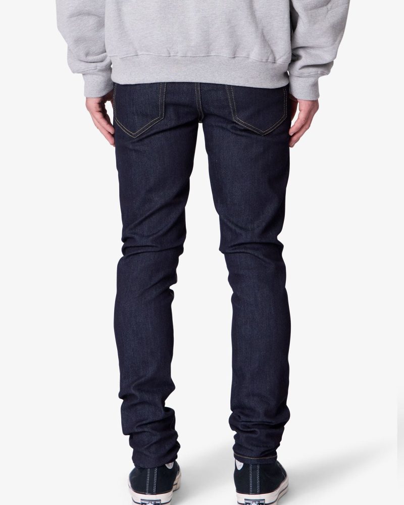 The Raw Skinny Denim is constructed from a rinse-washed indigo denim with a slight stretch for comfort. Cut in a skinny fit. it features contrast gold thread detailing throughout. Designed with a traditional five-pocket layout. belt loops. and a button fly closure.