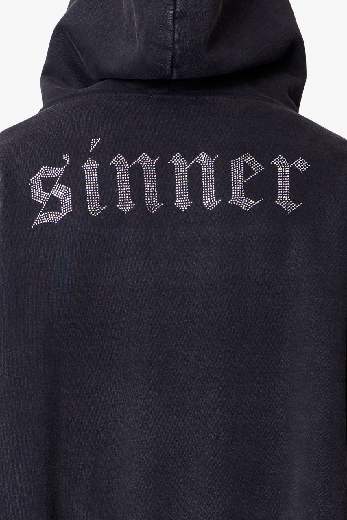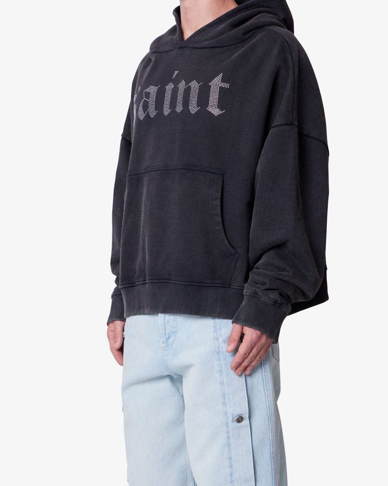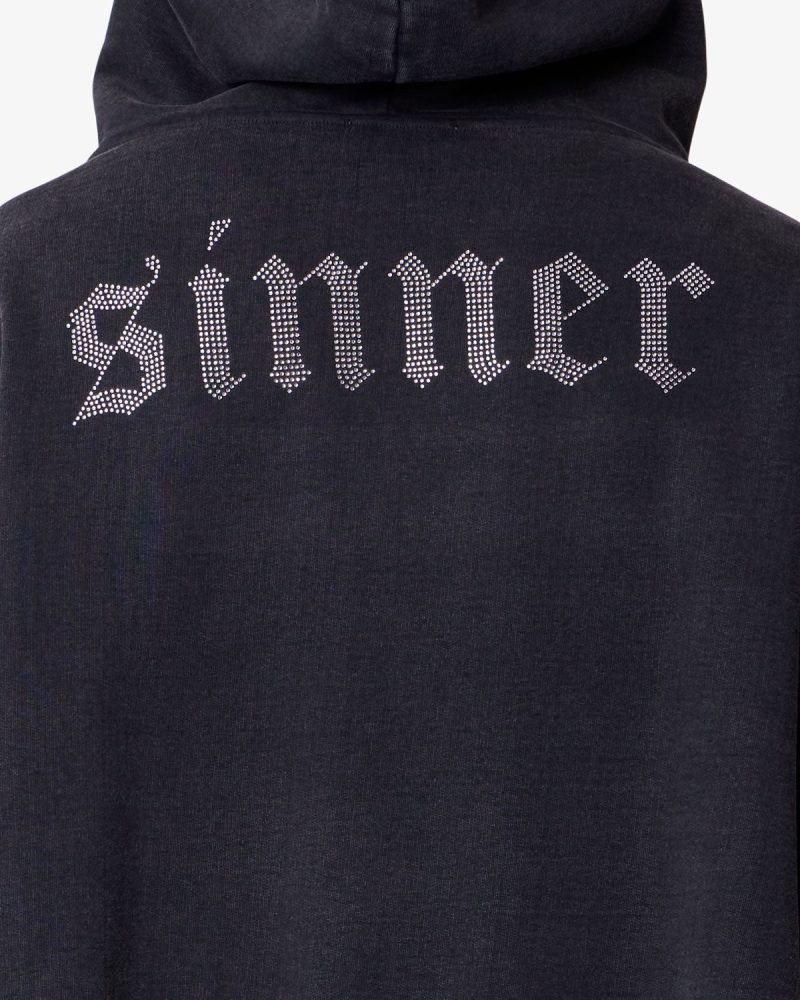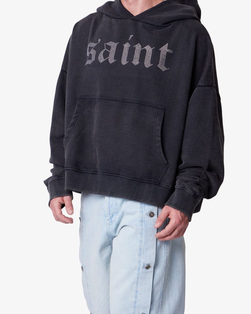 Constructed from 100% cotton with a heavy acid wash. the Saints and Sinners Hoodie features an oversized. boxy fit. Designed with a kangaroo pocket. ribbed cuffs and hem. and tonal stitching. it includes rhinestone appliqué text across the front reading saint and across the back reading sinner.