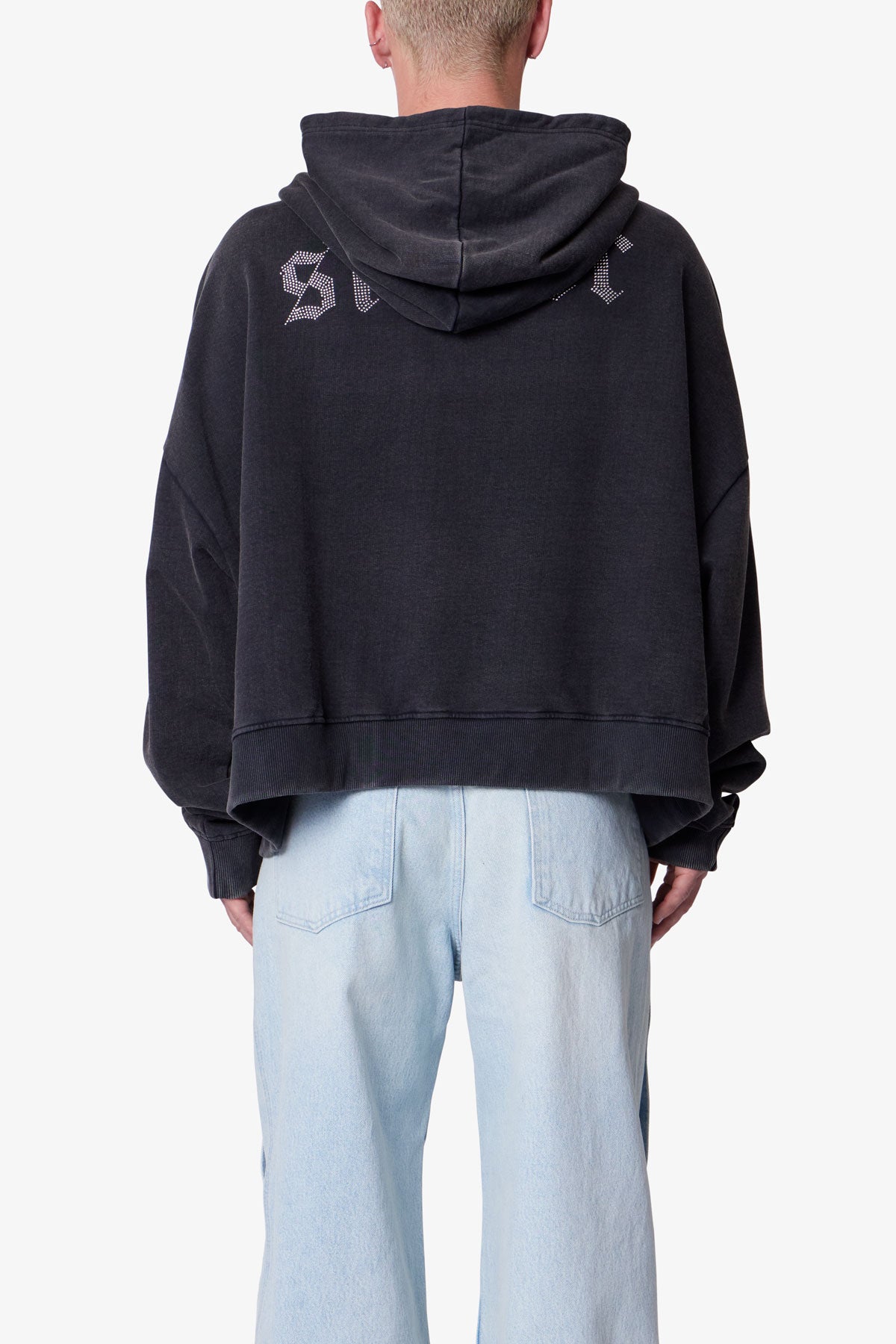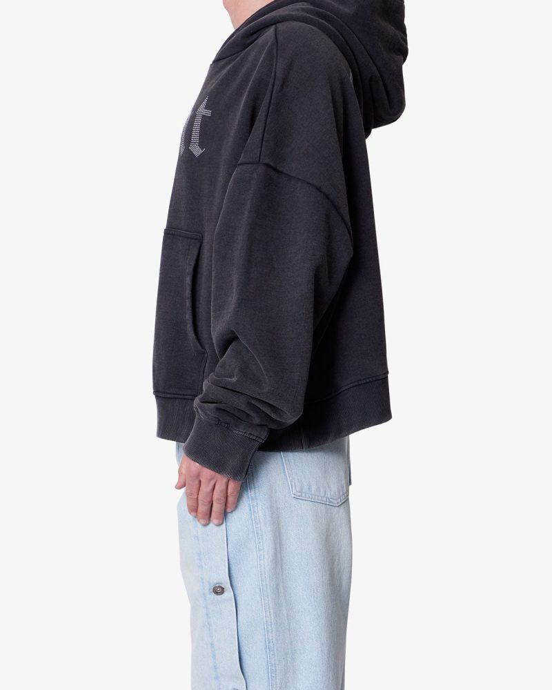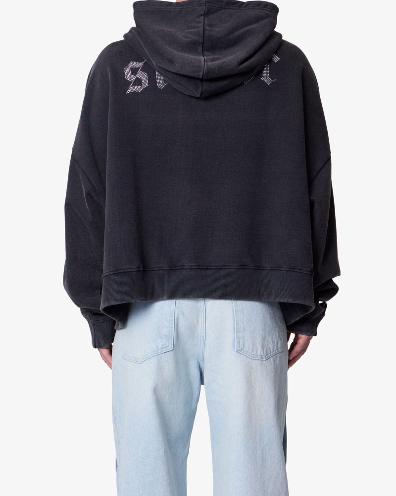 Constructed from 100% cotton with a heavy acid wash. the Saints and Sinners Hoodie features an oversized. boxy fit. Designed with a kangaroo pocket. ribbed cuffs and hem. and tonal stitching. it includes rhinestone appliqué text across the front reading saint and across the back reading sinner.