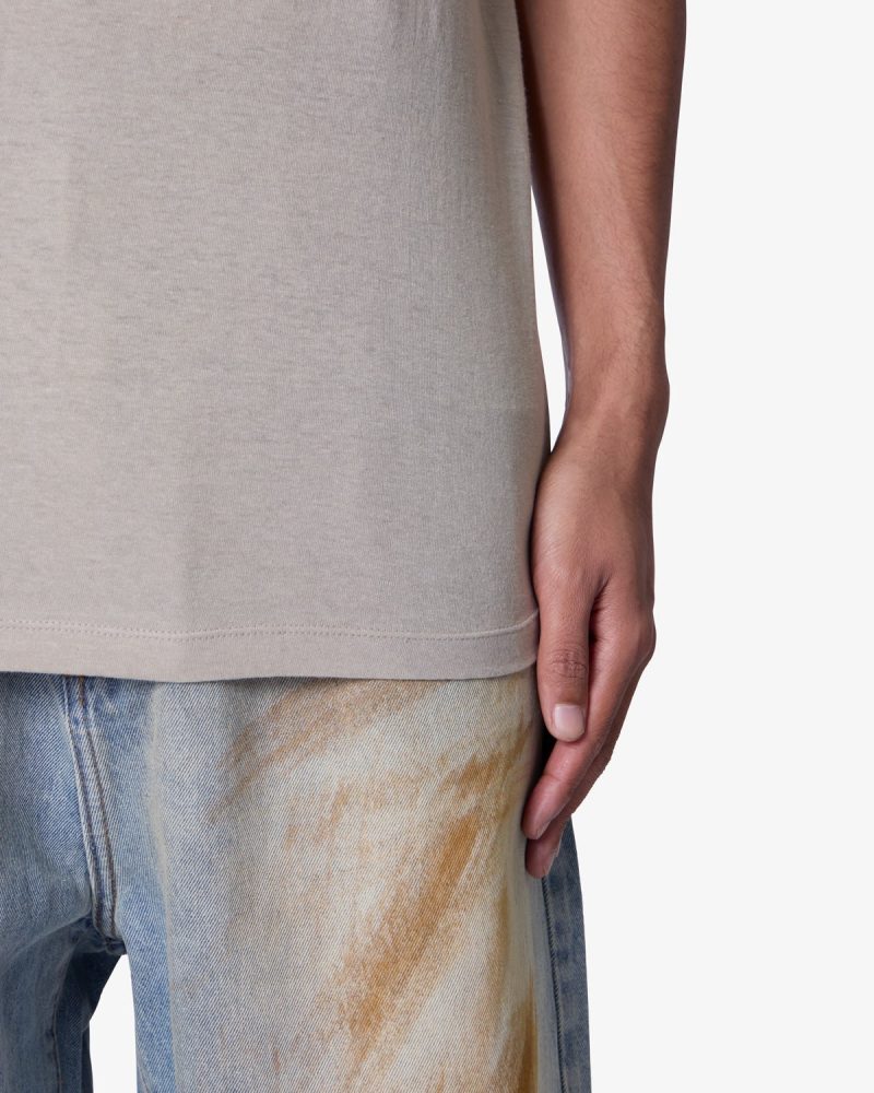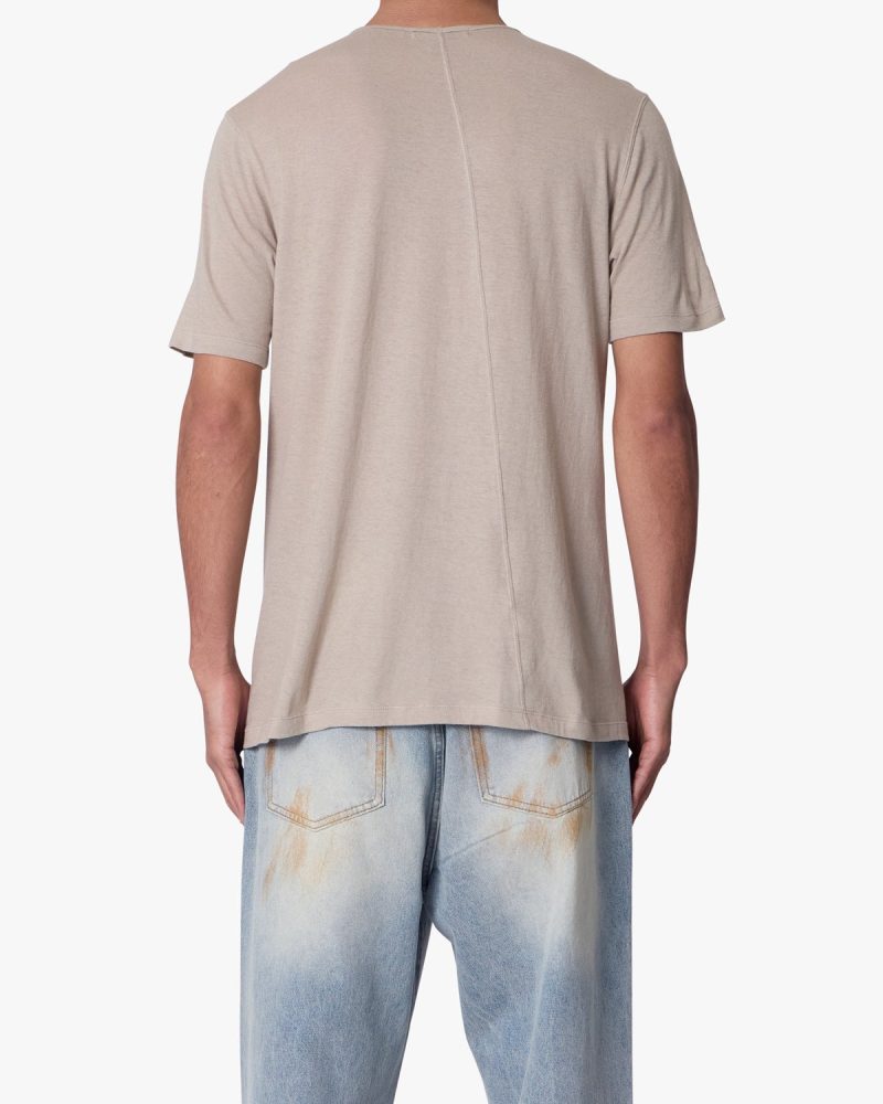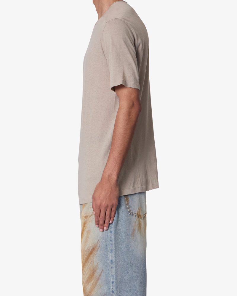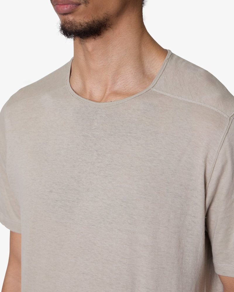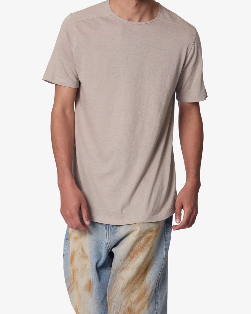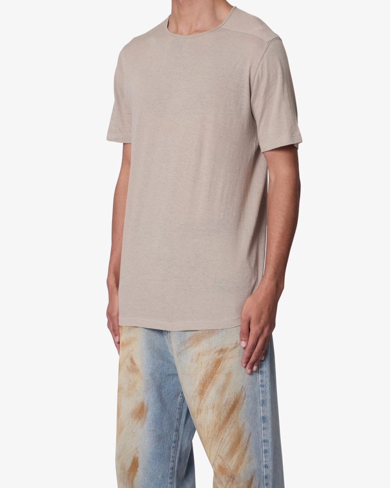 the Sheer Crewneck Tee features a flat hem line and a standard shoulder seam for a more streamlined fit. constructed from a washed sheer cotton fabric. and finished with an traditional fit.
