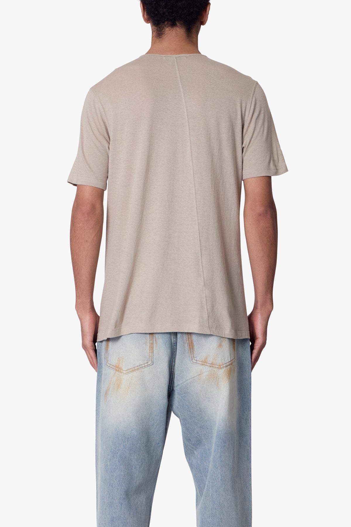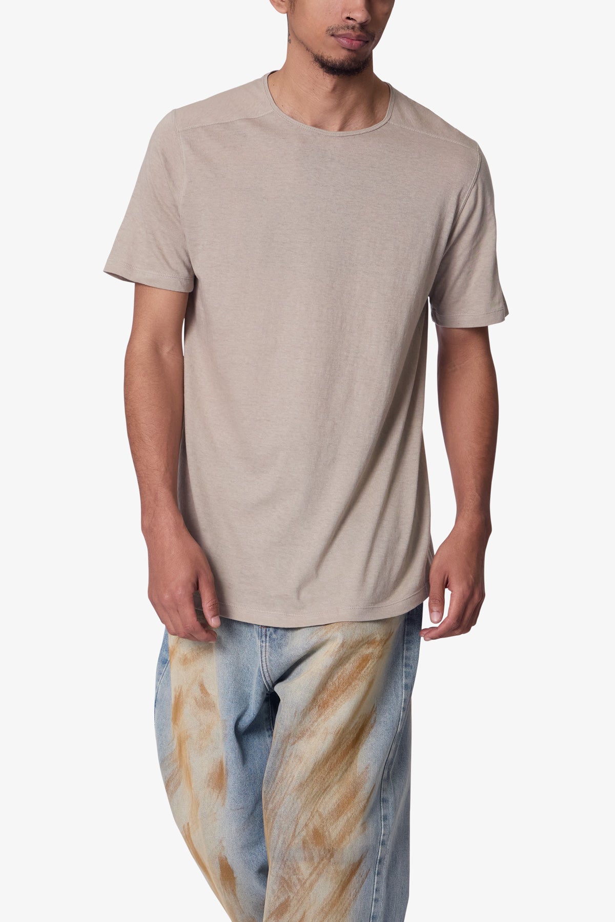the Sheer Crewneck Tee features a flat hem line and a standard shoulder seam for a more streamlined fit. constructed from a washed sheer cotton fabric. and finished with an traditional fit.