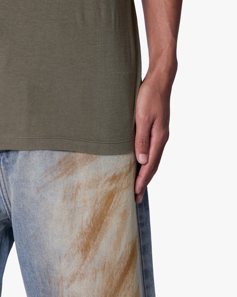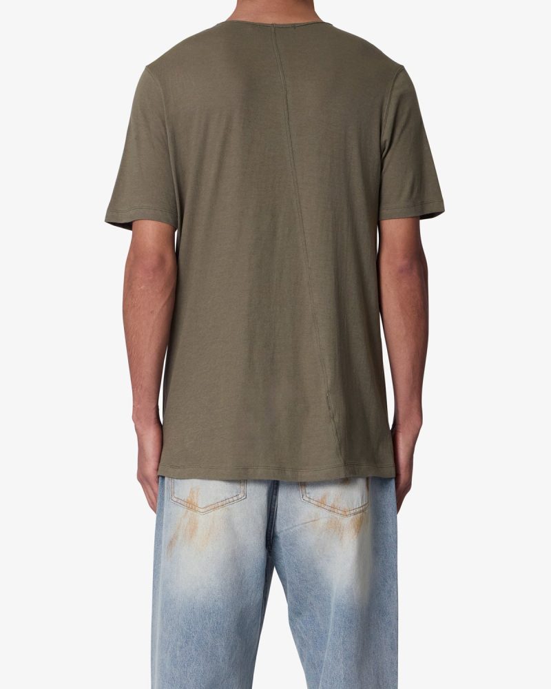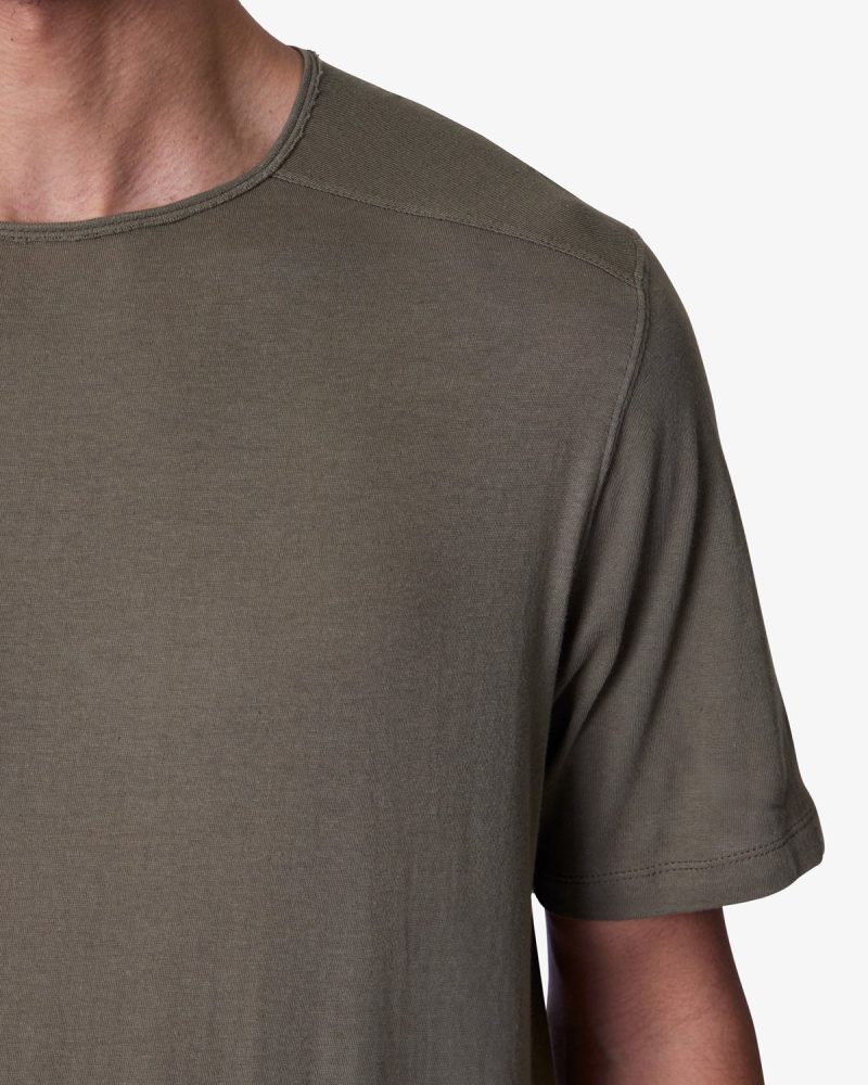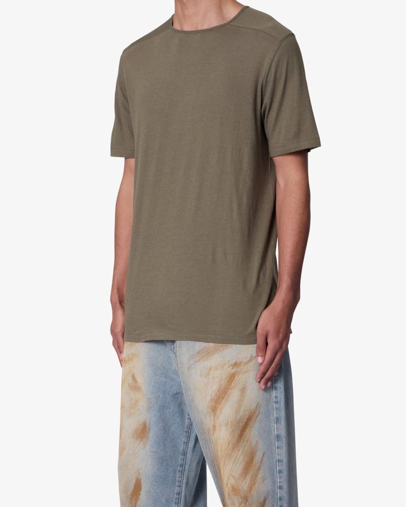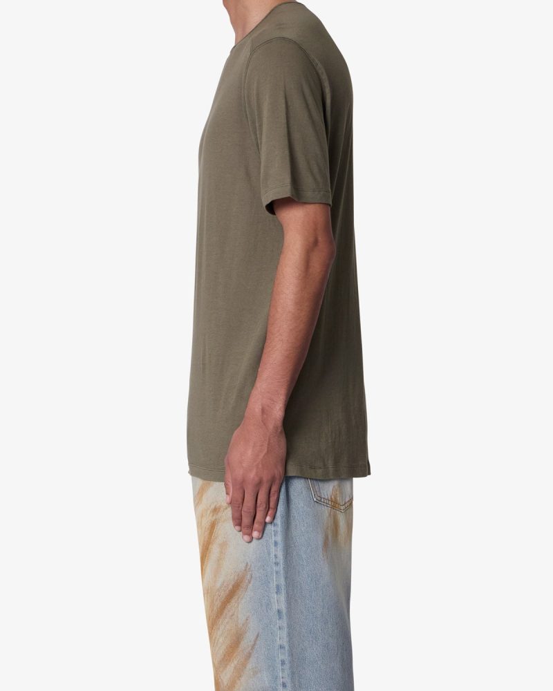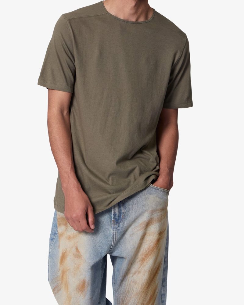 the Sheer Crewneck Tee features a flat hem line and a standard shoulder seam for a more streamlined fit. constructed from a washed sheer cotton fabric. and finished with an traditional fit.