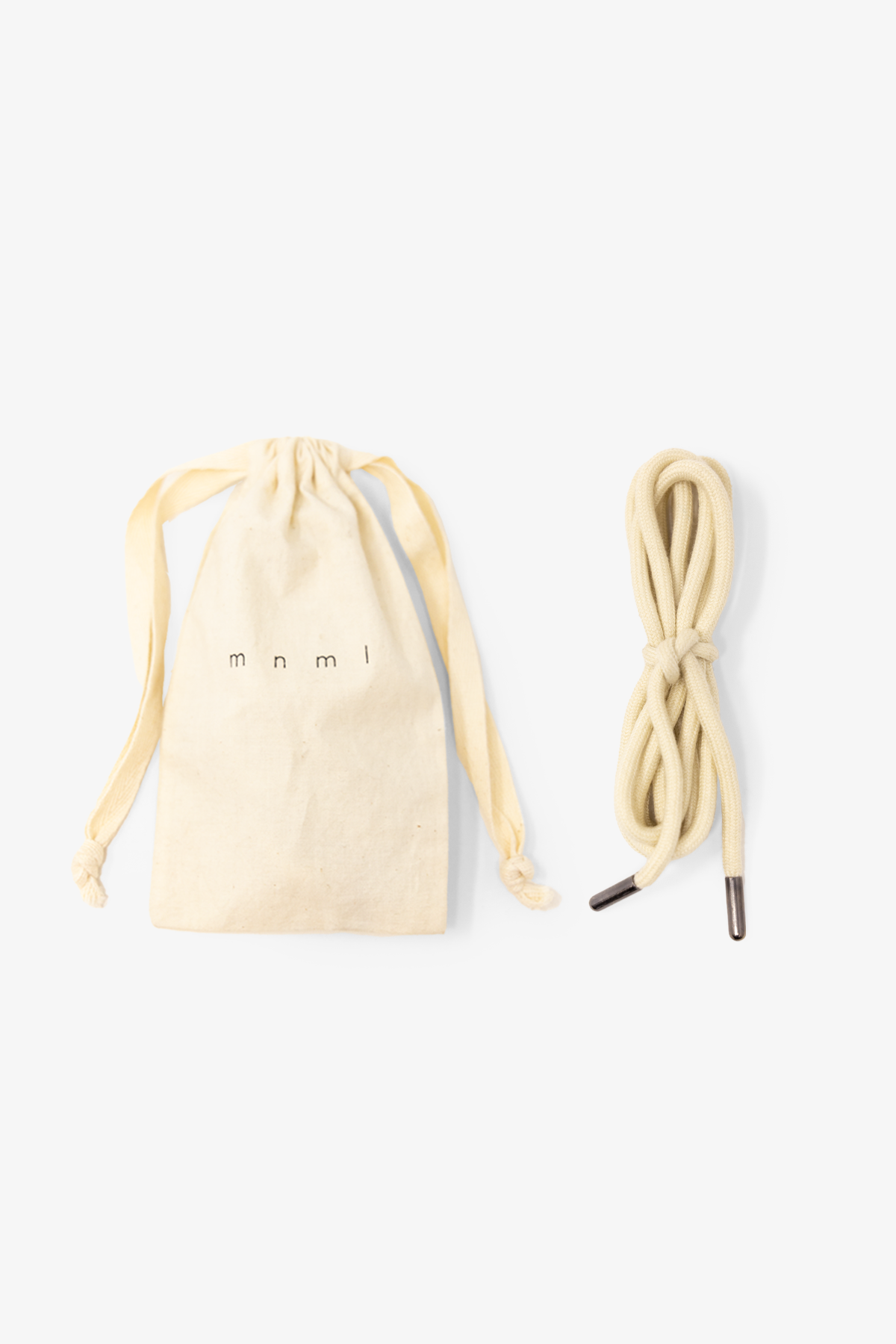 the Shoe Lace Belt is constructed of cotton round cordage with metal aglets and a screen printed cotton drawcord bag from denim pocket bag material.