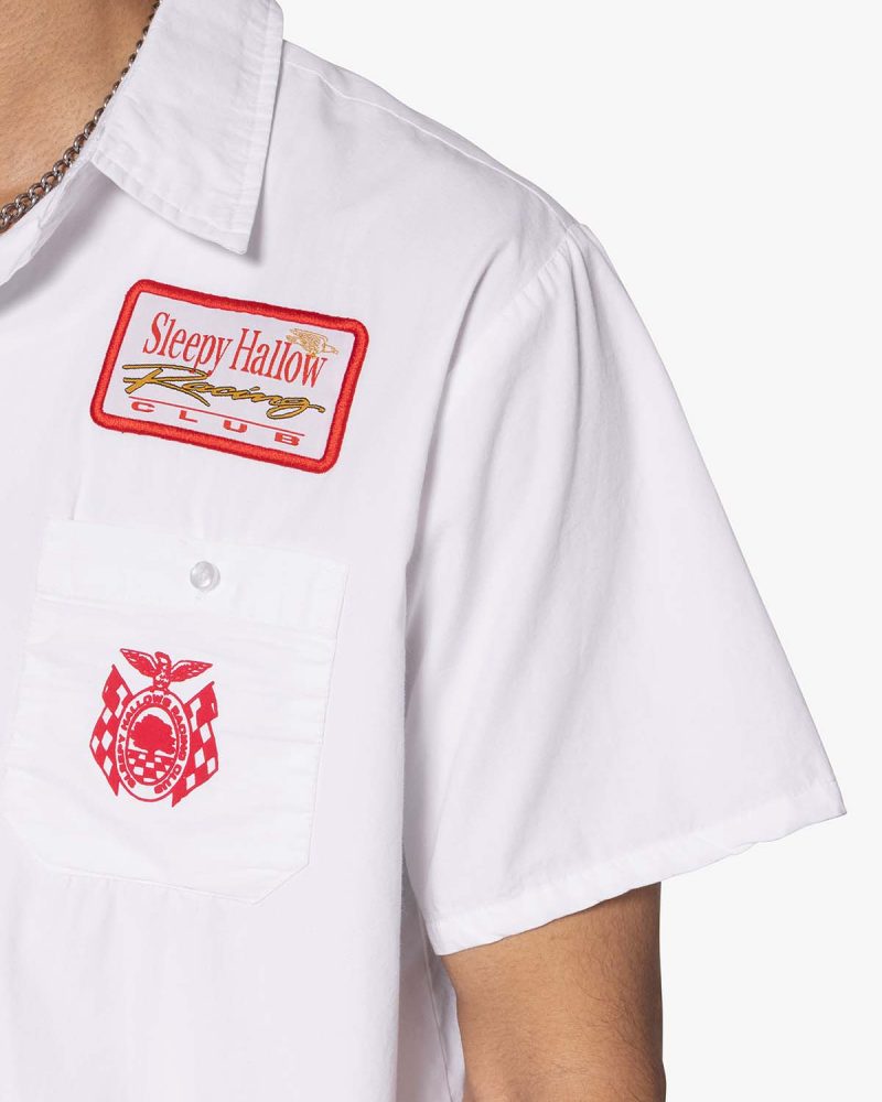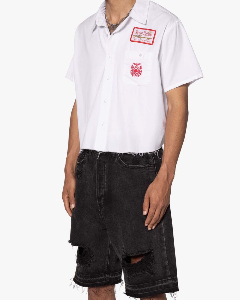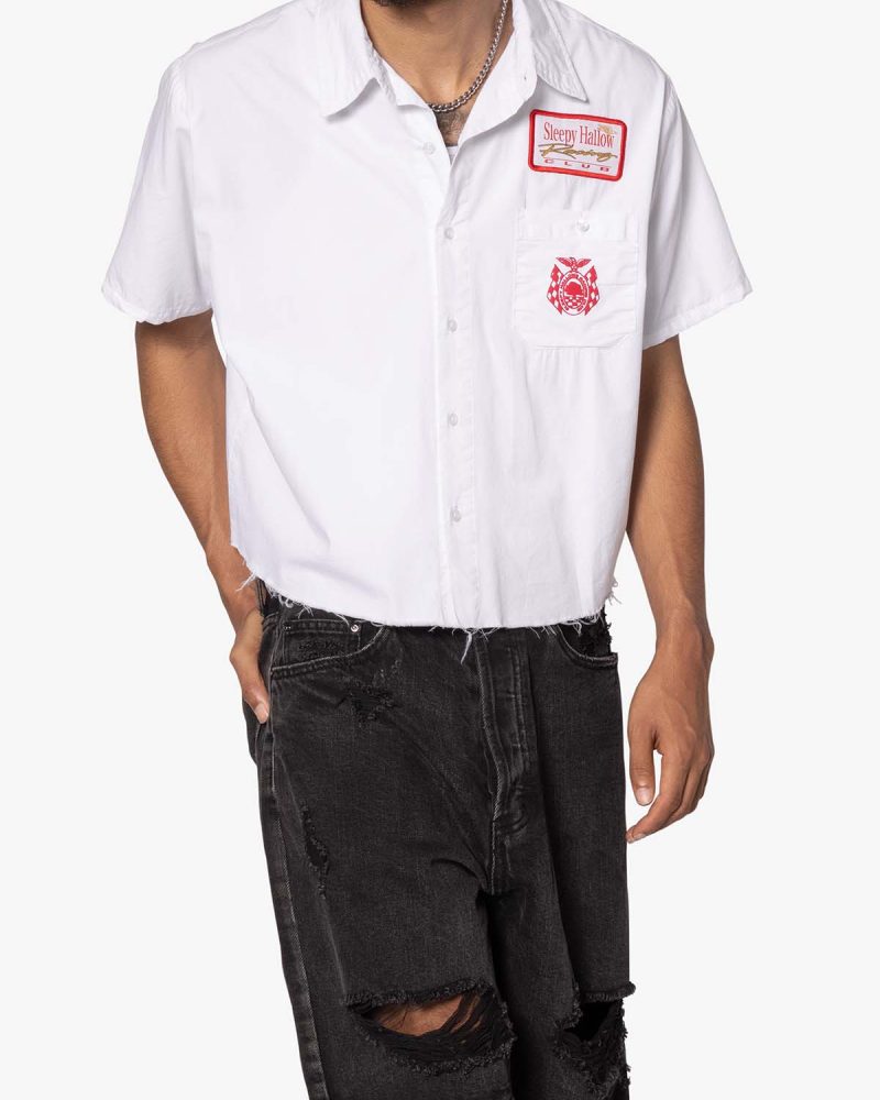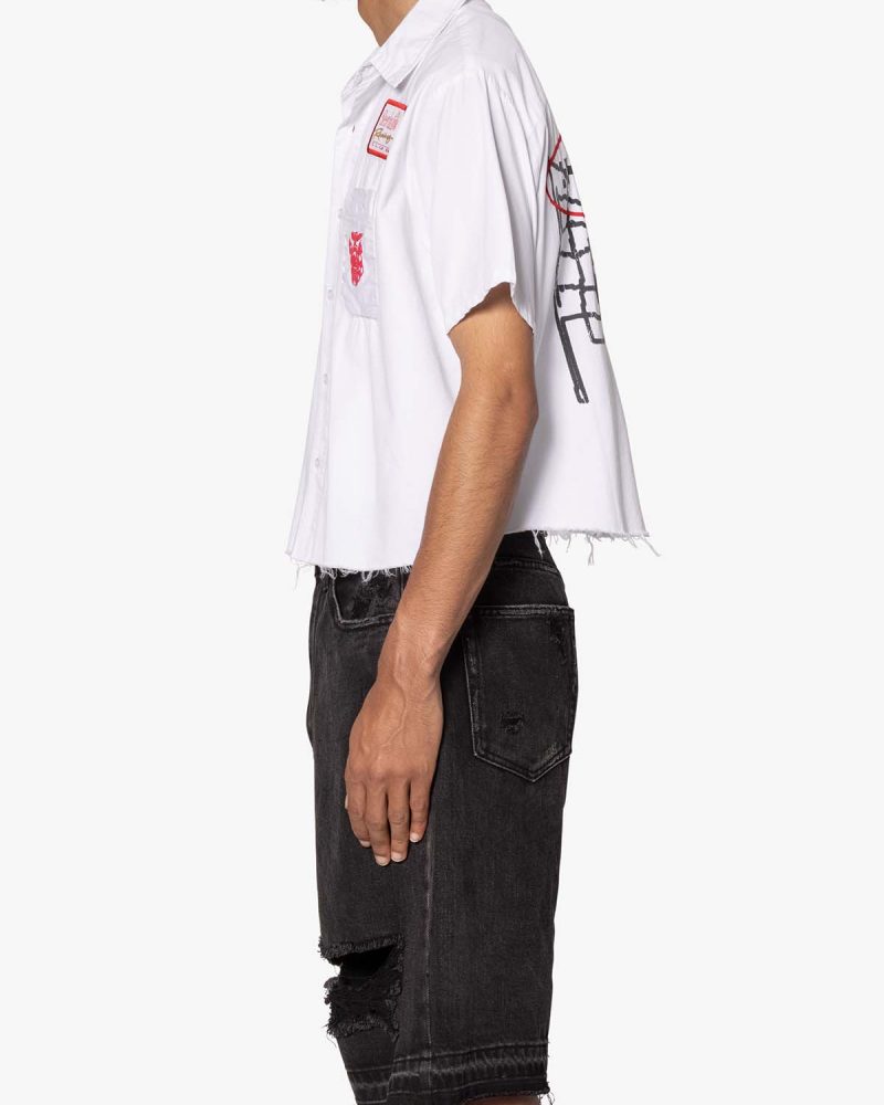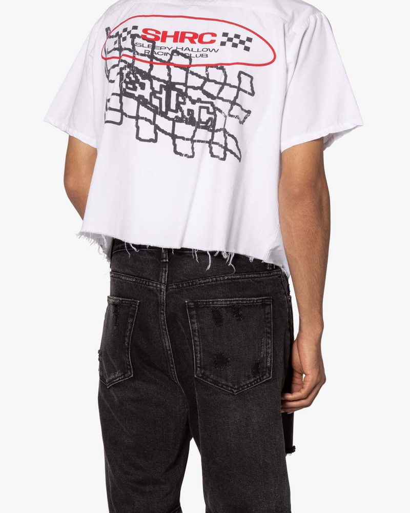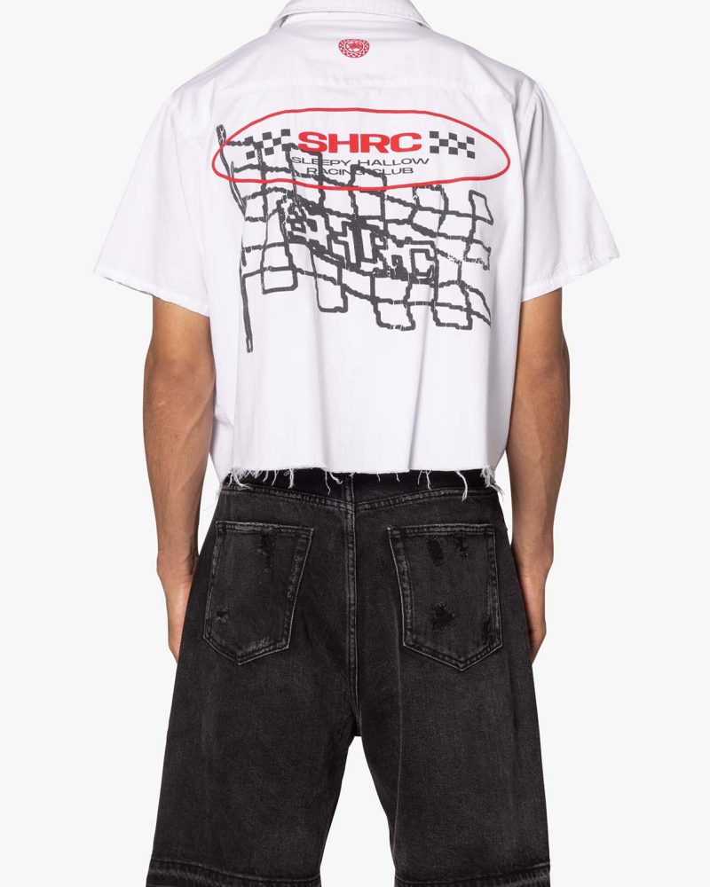 the SHRC Checkered Flag Cropped Shirt is made from a lightweight cotton fabric. The relaxed-fit shirt features a button placket. screen prints. embroidery. and patch details throughout. and is finished with a pocket on the chest.