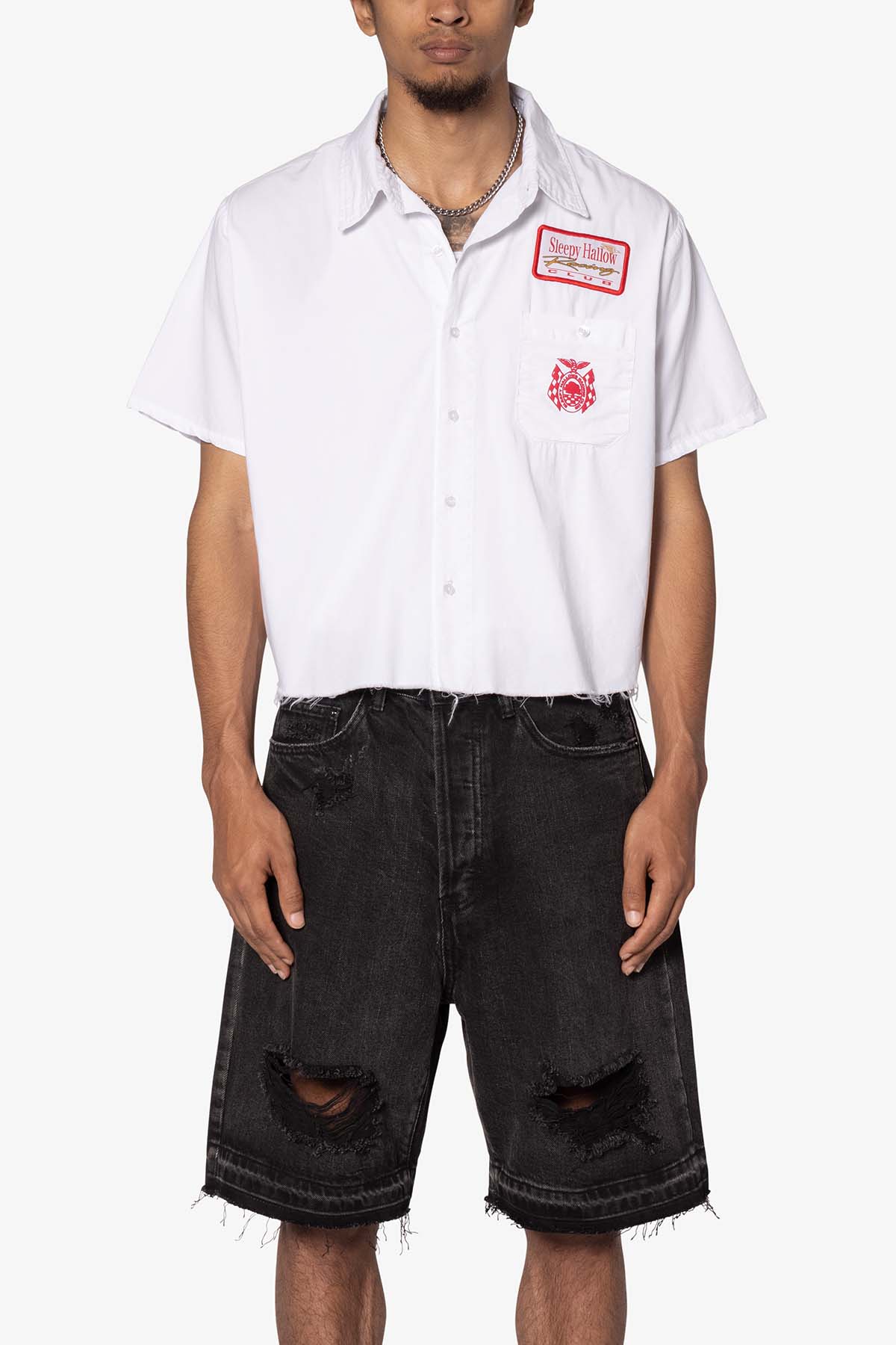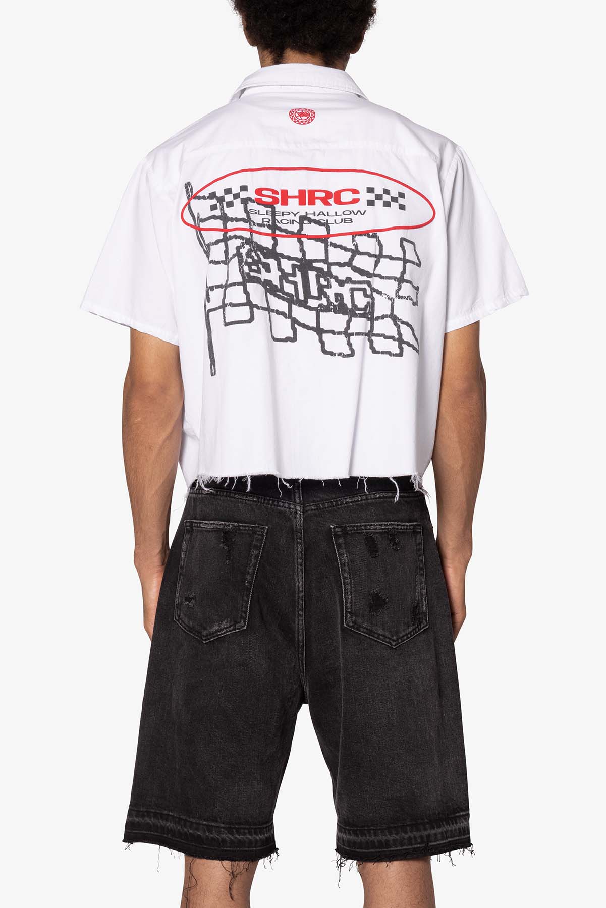 the SHRC Checkered Flag Cropped Shirt is made from a lightweight cotton fabric. The relaxed-fit shirt features a button placket. screen prints. embroidery. and patch details throughout. and is finished with a pocket on the chest.