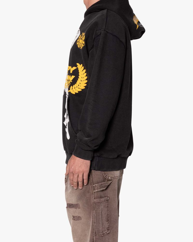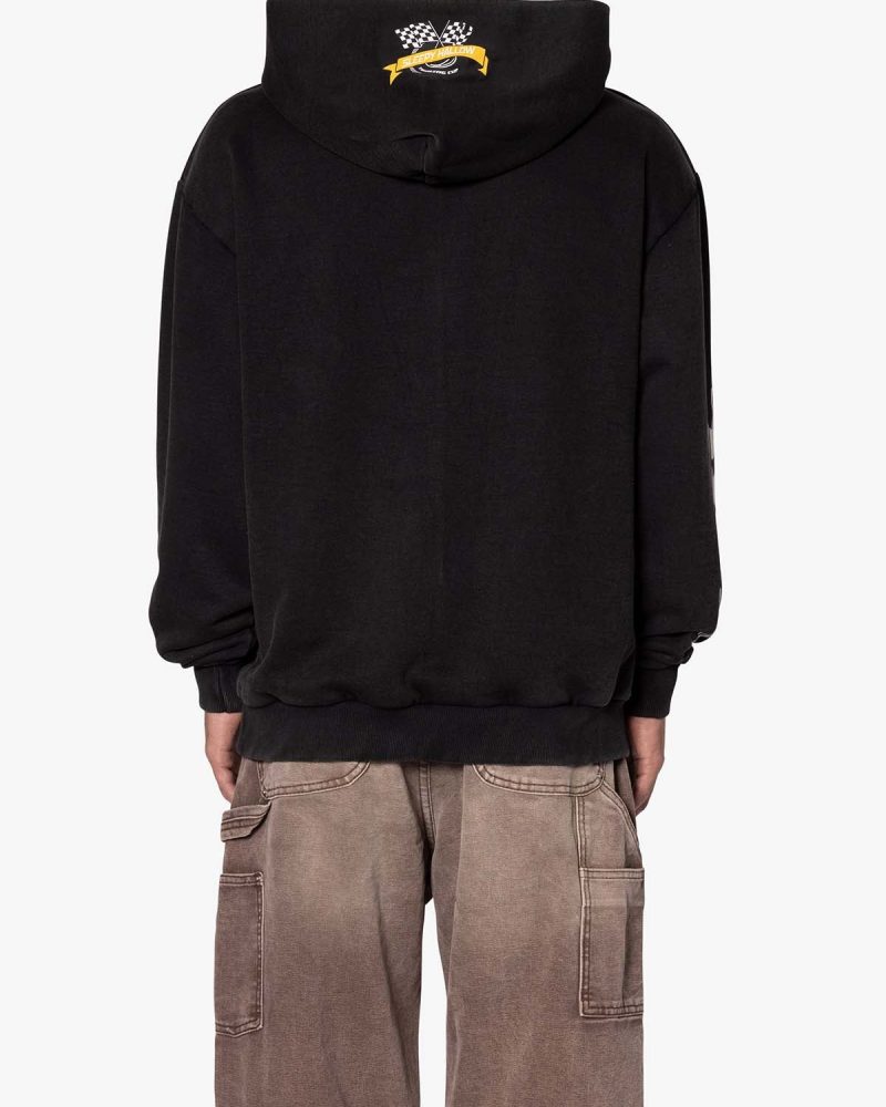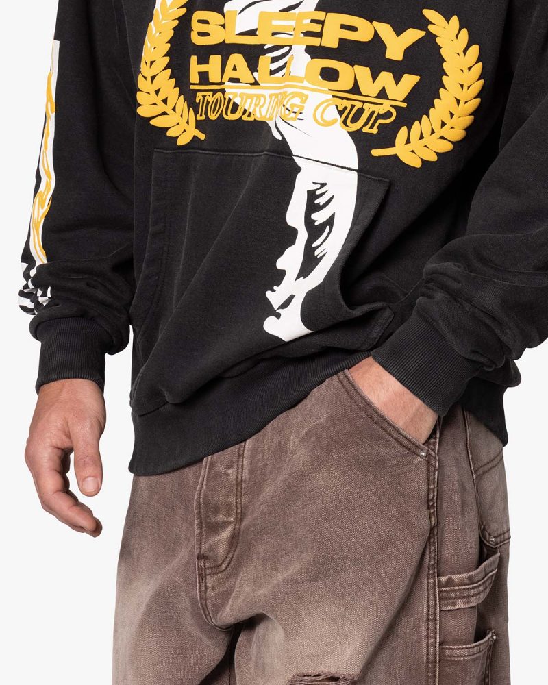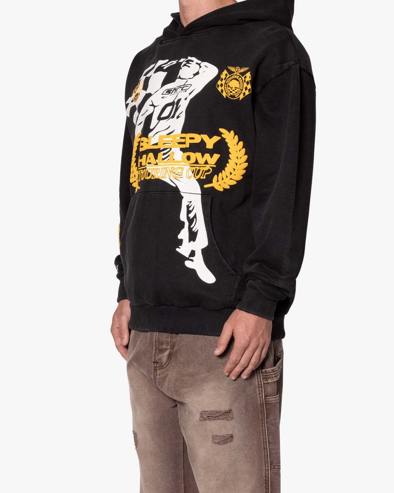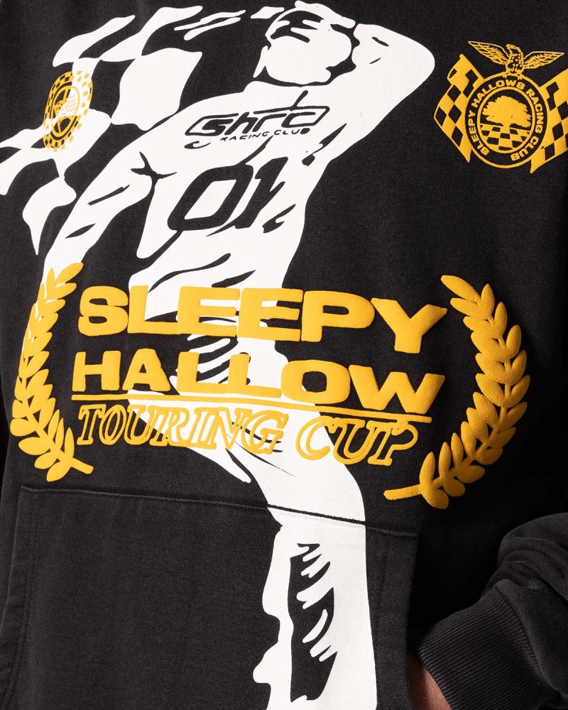 the SHRC Touring Cup Hoodie features a relaxed fit. a front pouch pocket. and body matched ribbing at the waist. side seam. and wrists. finished with a multi color print on the chest. sleeves. and hood. and finished in a vintage wash for an improved hand feel.