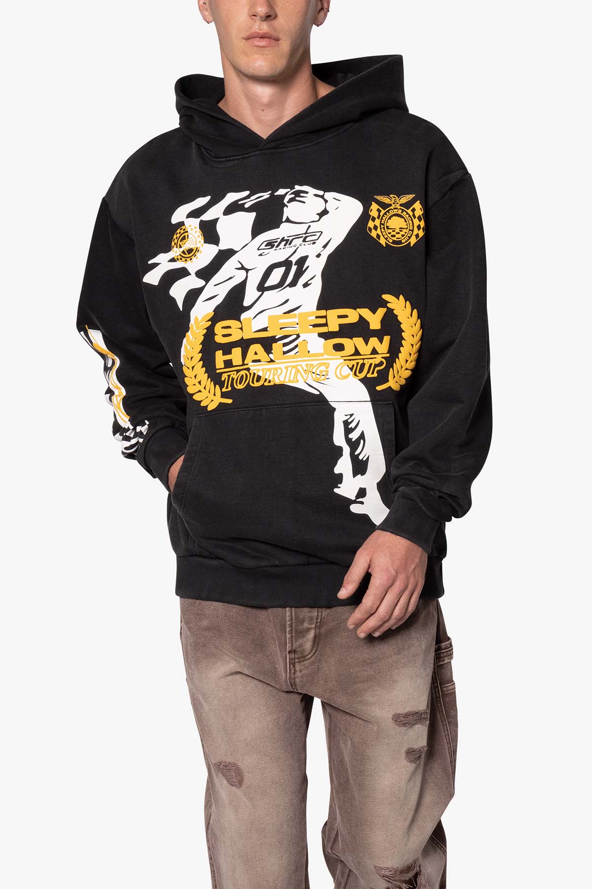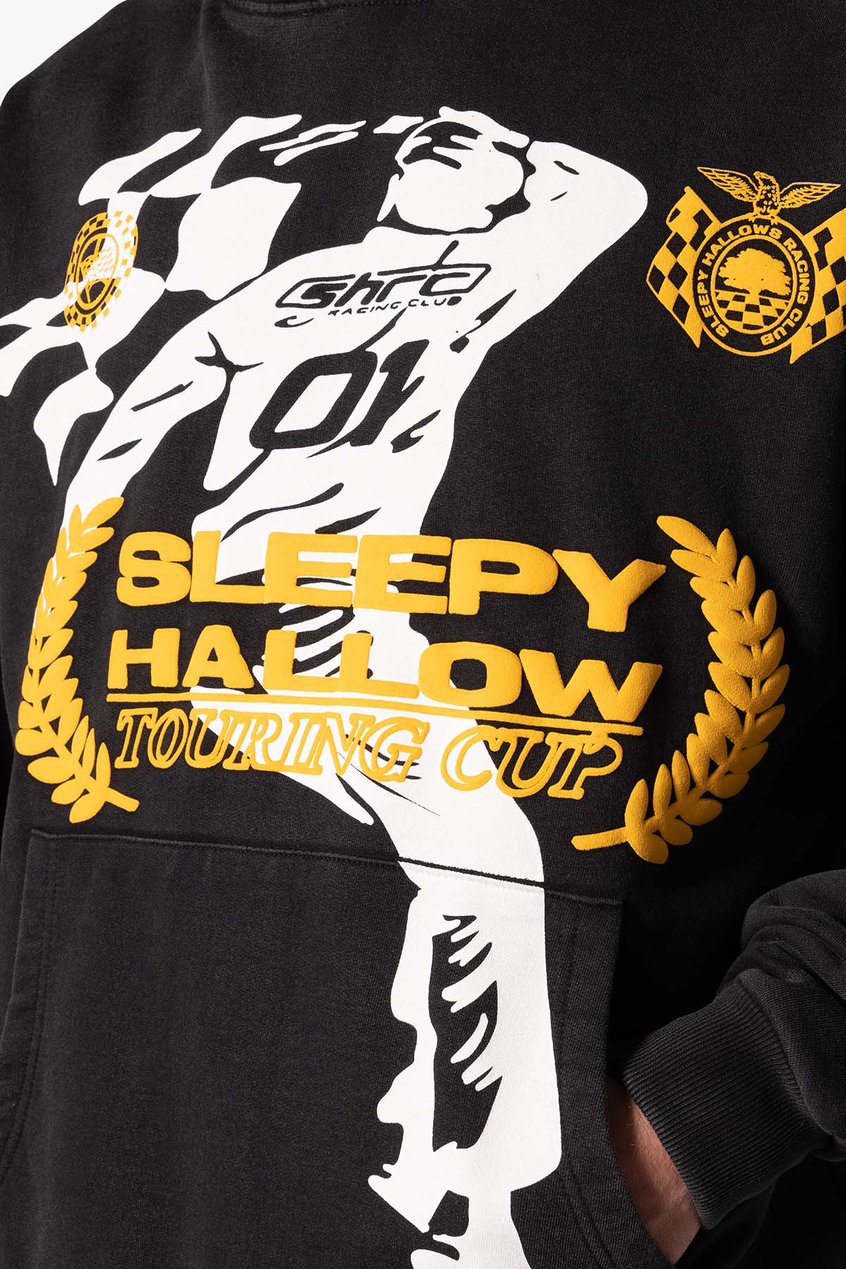 the SHRC Touring Cup Hoodie features a relaxed fit. a front pouch pocket. and body matched ribbing at the waist. side seam. and wrists. finished with a multi color print on the chest. sleeves. and hood. and finished in a vintage wash for an improved hand feel.