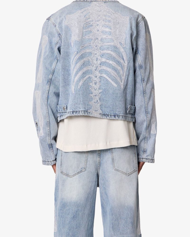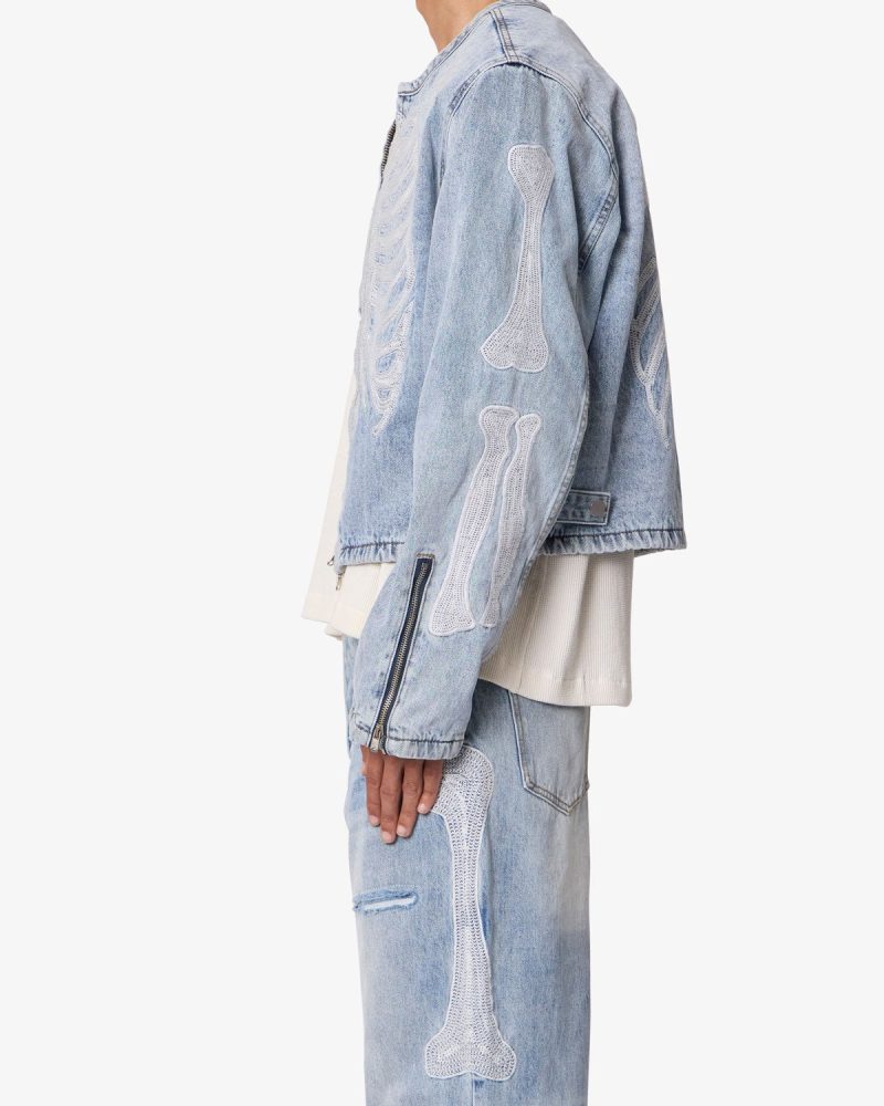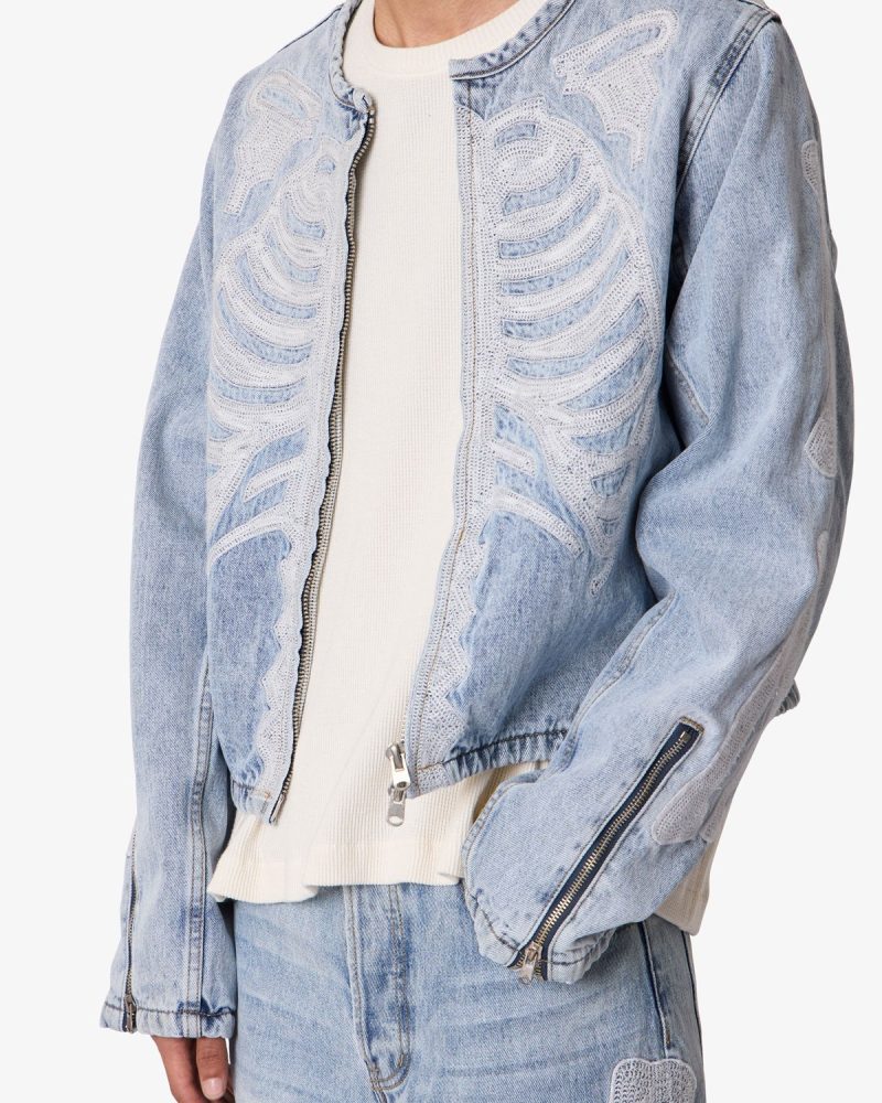 Constructed from a mid-weight cotton-poly blend with a rinse wash. the Skeleton Moto Jacket features a cropped. boxy silhouette with dropped shoulders and tapered sleeves. Designed with a collarless neckline and zippered front closure. the jacket is detailed with chain stitch skeleton appliqués across the chest. back. and sleeves. Finished with adjustable zip openings at the cuffs.