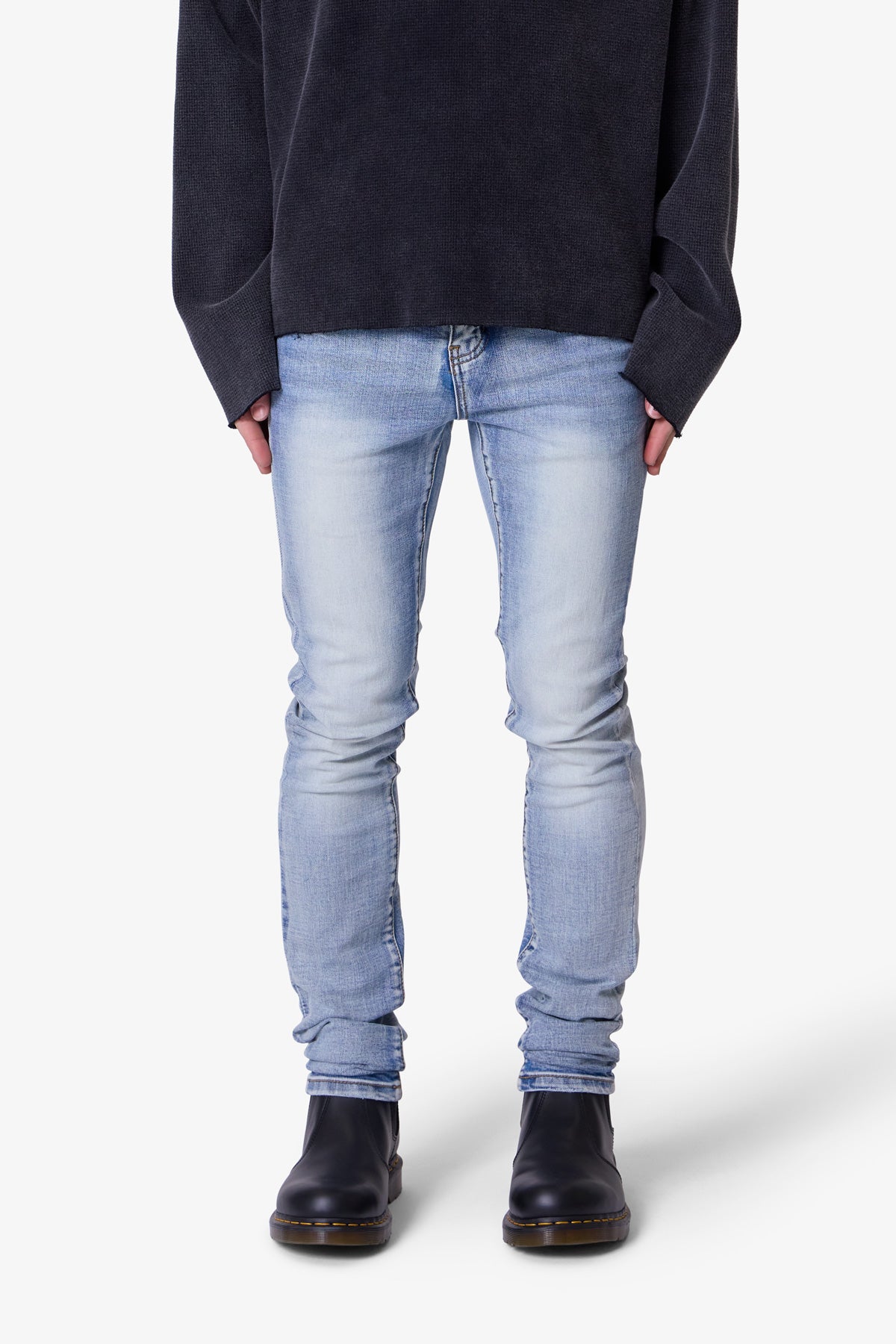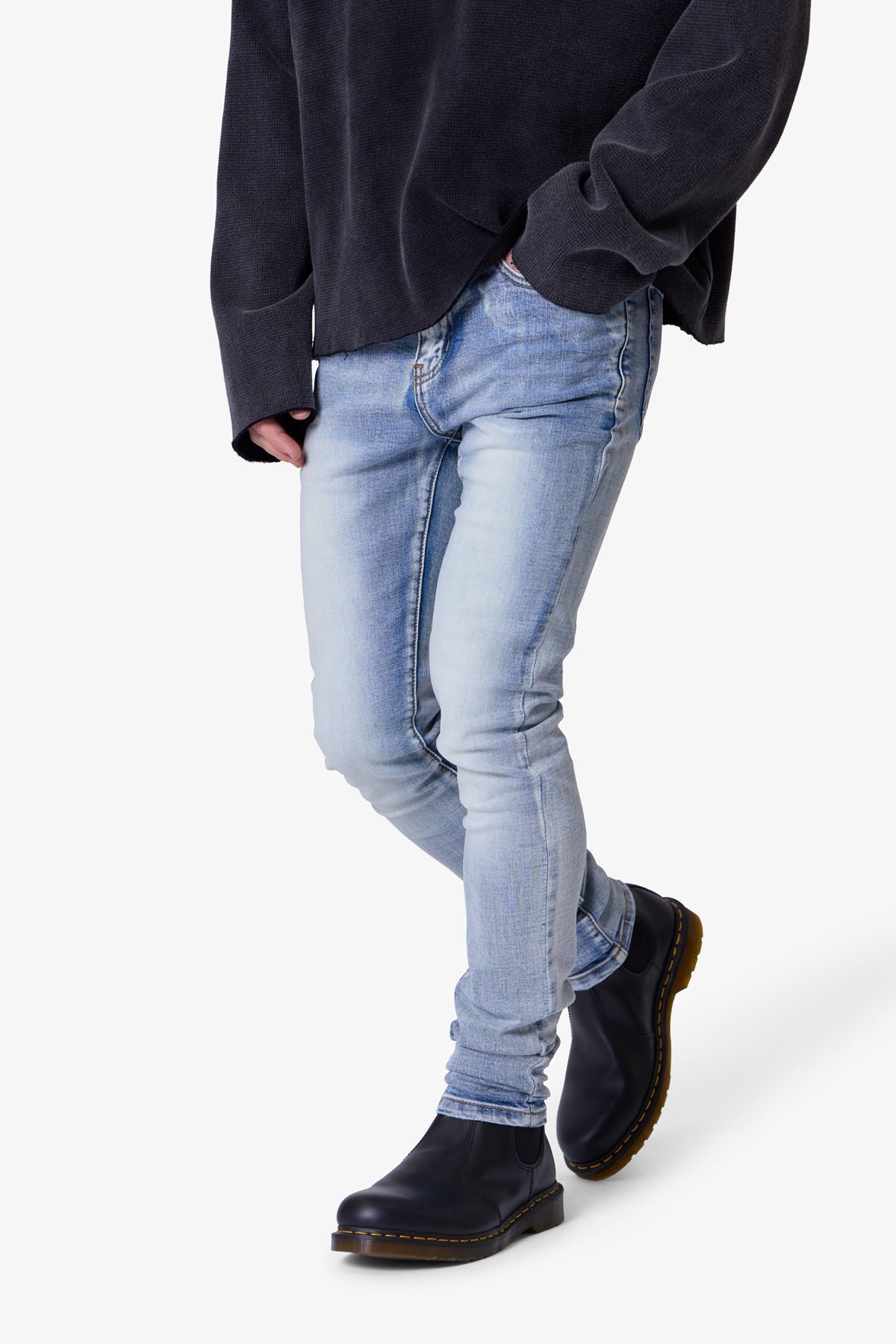the new Skinny Denim are designed with our new and updated skinny fit. which is skinny throughout for increased comfort and updated look. and is constructed from stretch 13 oz indigo cotton denim with a light vintage wash. and finished with traditional five pocket denim details.