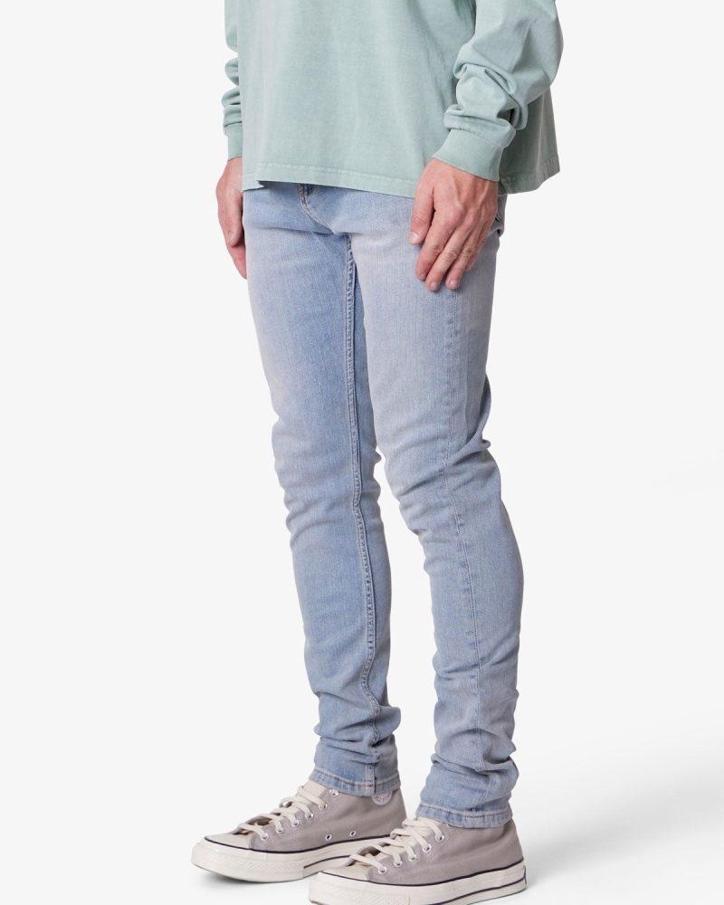 Constructed from a cotton-spandex blend. the Skinny Denim features a light blue vintage wash with subtle sanding and whiskering. Designed with a form-fitting skinny silhouette. it’s finished with five-pocket styling. belt loops. and a button fly closure.