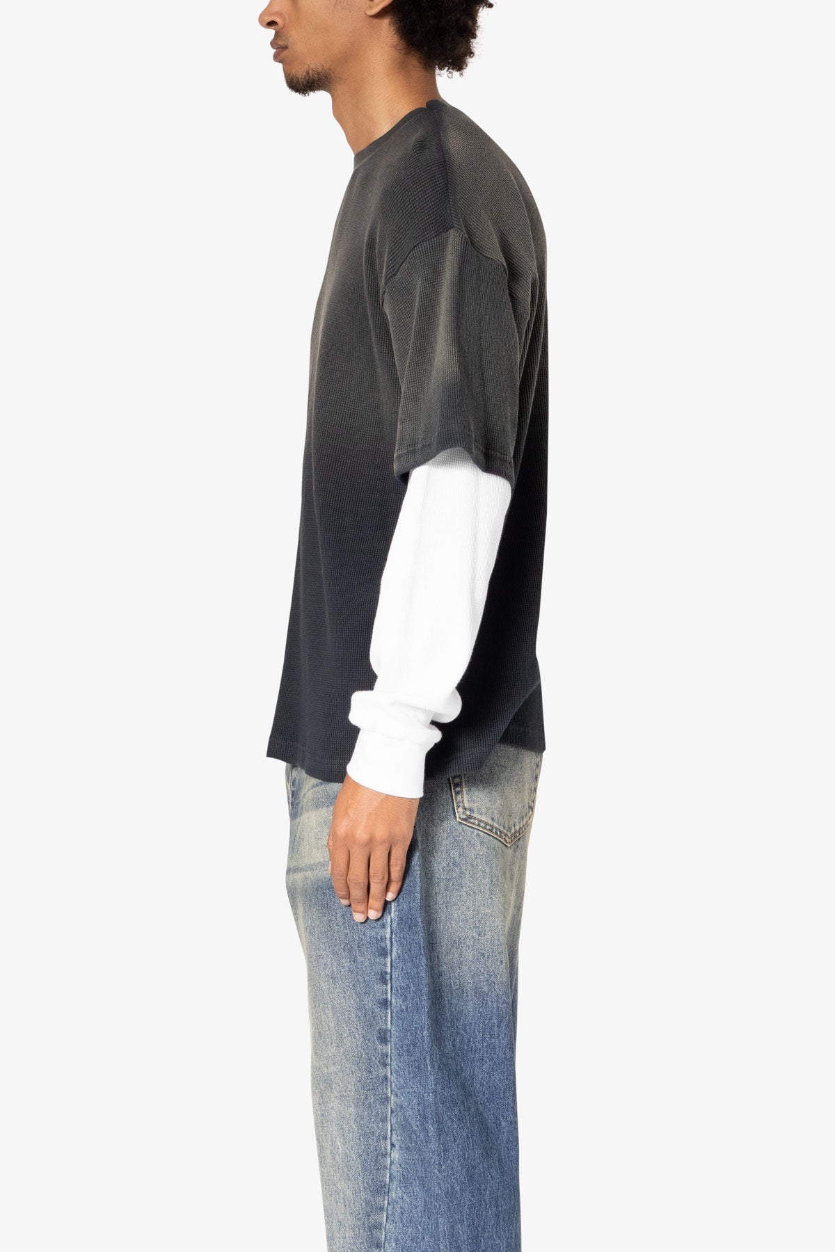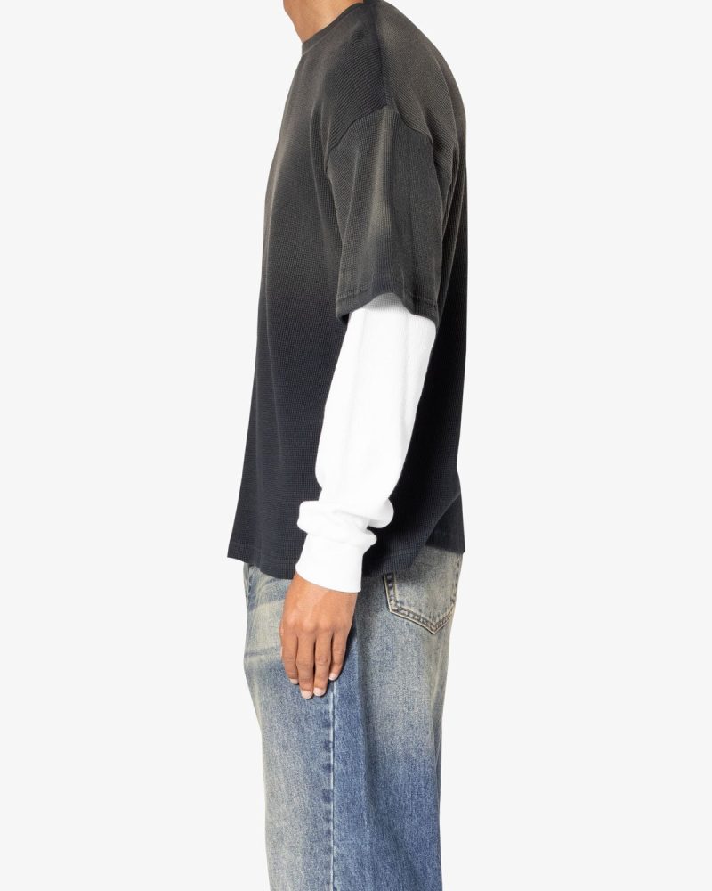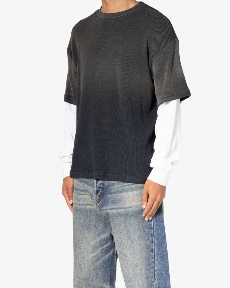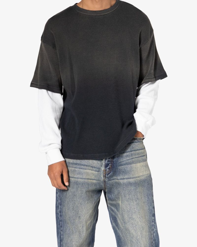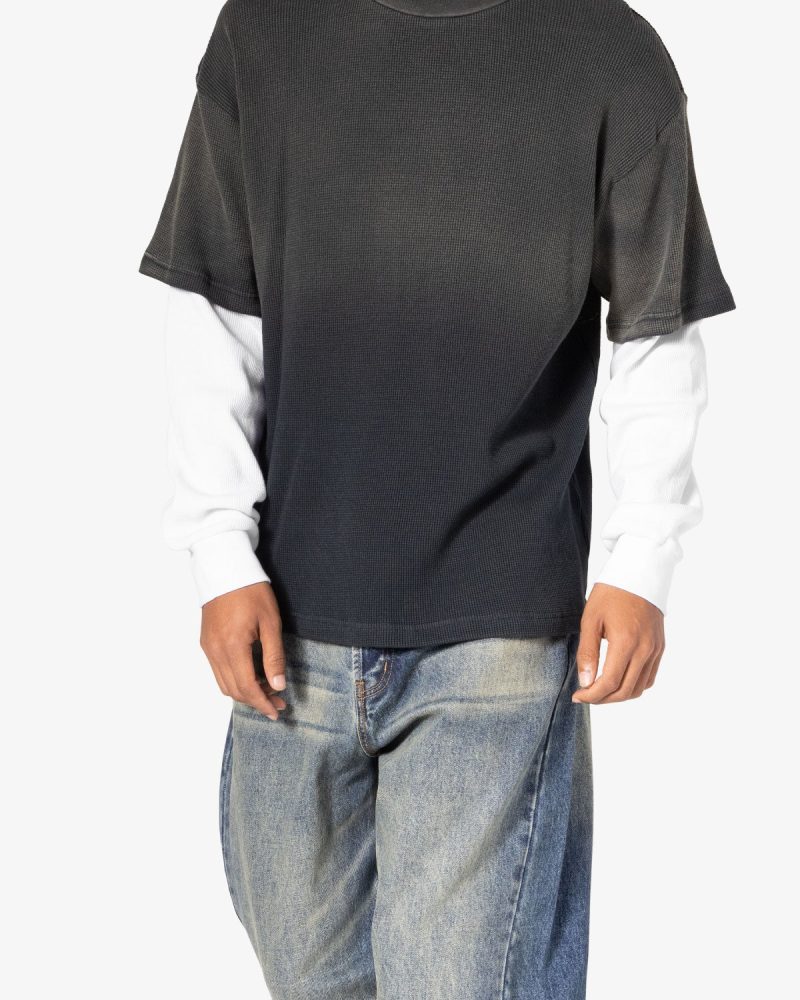 the Sprayed Thermal L/S Tee is constructed from a custom developed cotton jersey and features a relaxed tee layered over thermal l/s tee sleeves. and finished with sspray wash on the top layer.