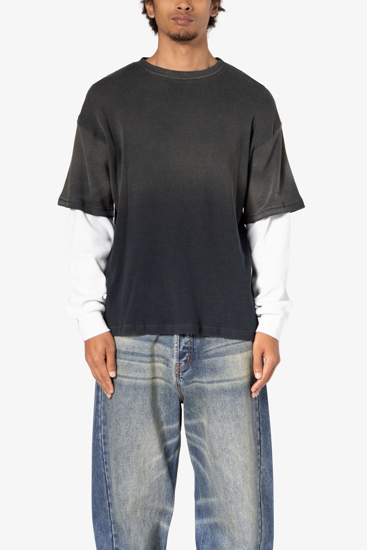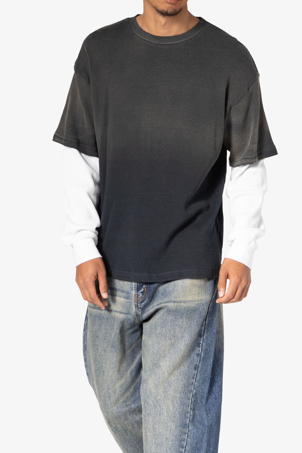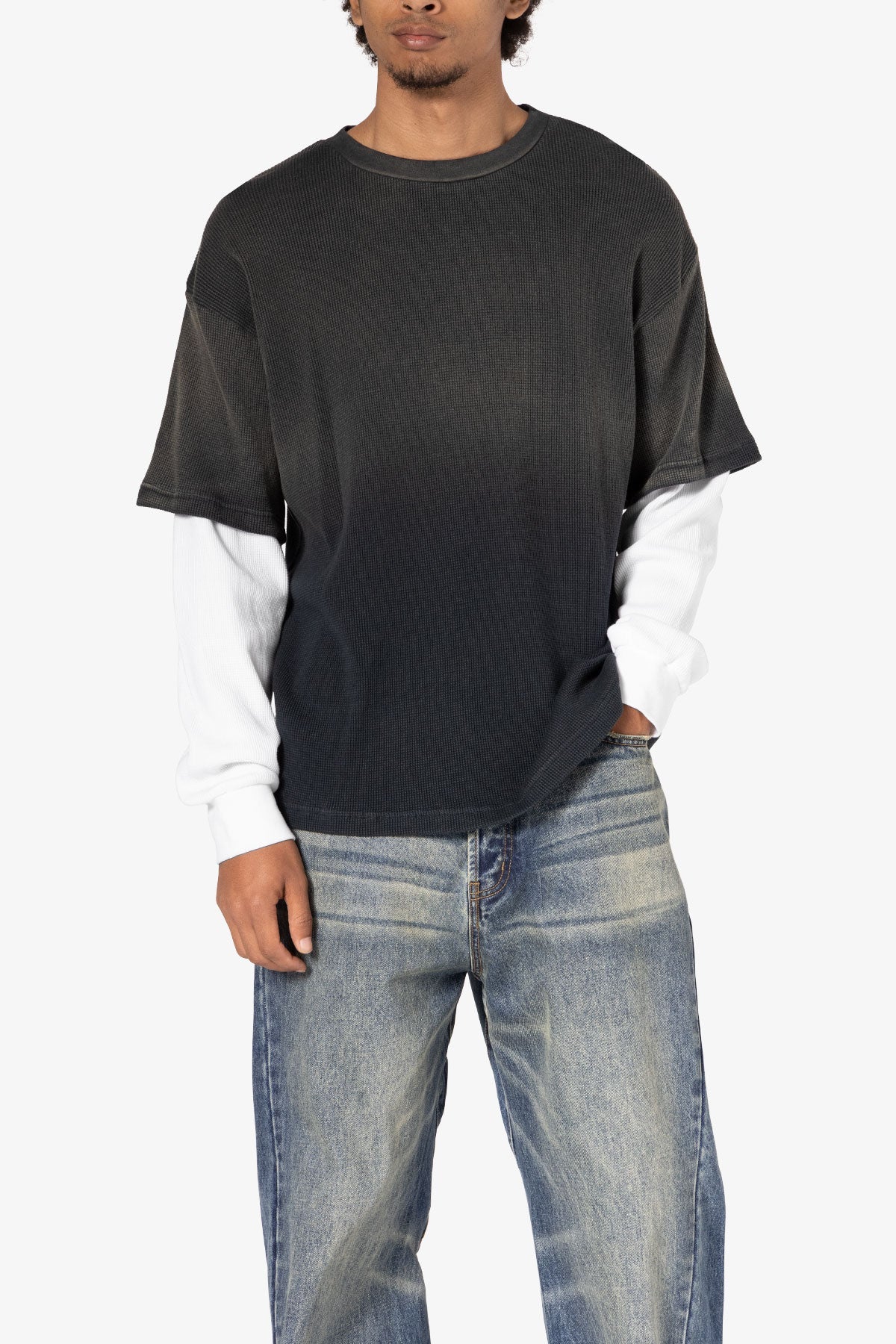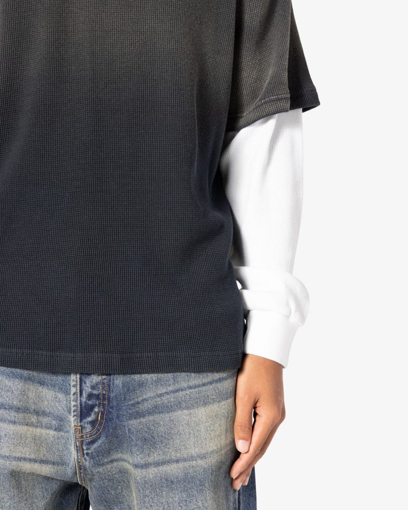 the Sprayed Thermal L/S Tee is constructed from a custom developed cotton jersey and features a relaxed tee layered over thermal l/s tee sleeves. and finished with sspray wash on the top layer.