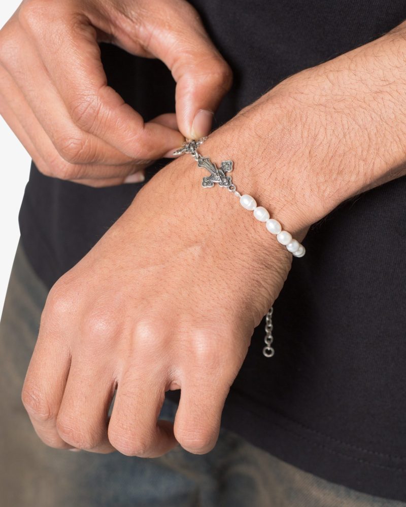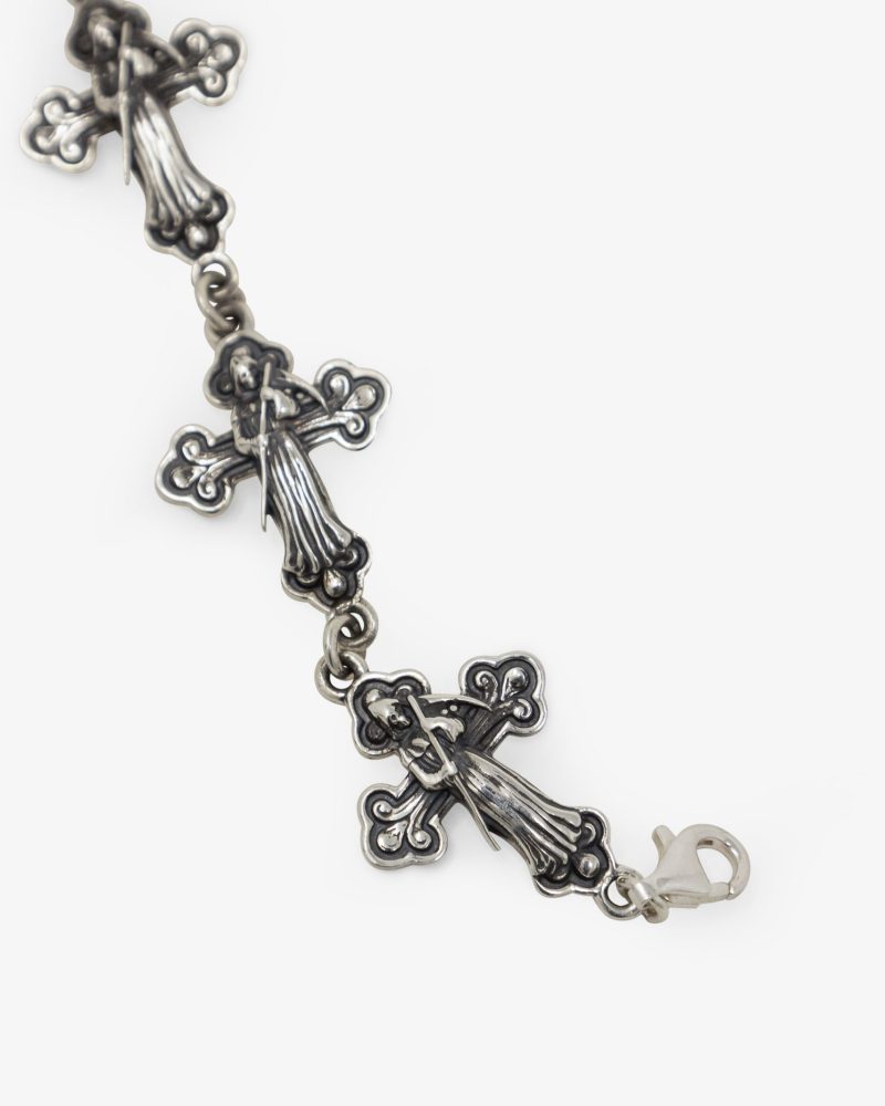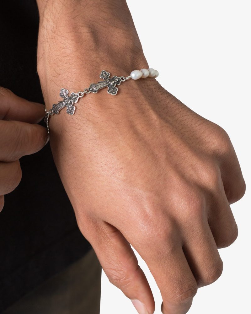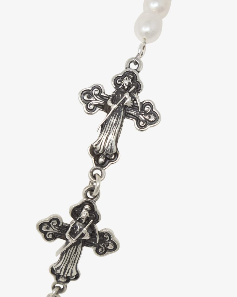 the Sterling Reaper and Pearl Bracelet is a blend of sterling silver crosses adorned with a grim reaper motif and vintage patina that is paired with natural freshwater pearls. Finished with a sterling silver lobster clasp that has an adjustable length with a sterling silver chain. and presented in an embossed box and velvet bag.