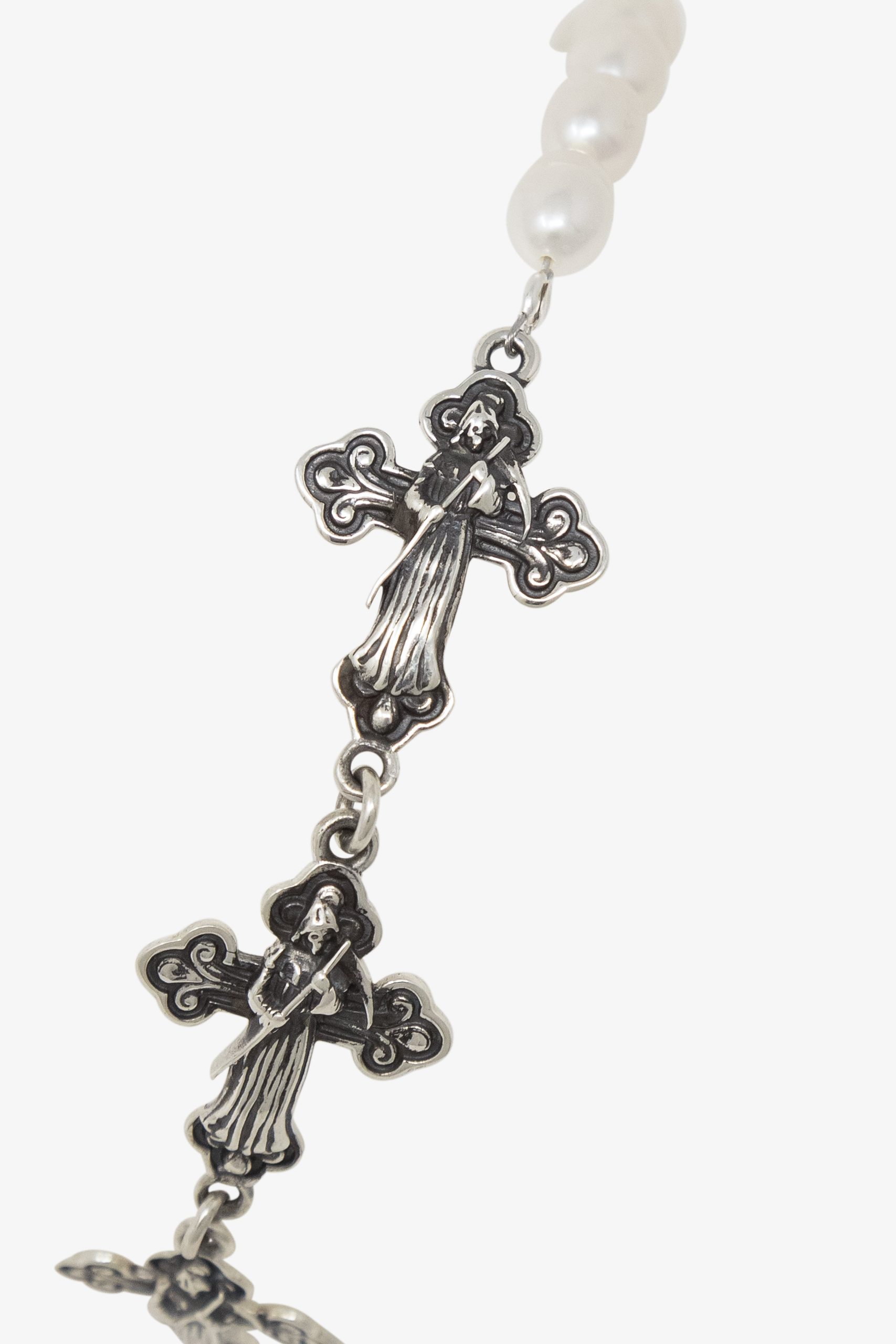 the Sterling Reaper and Pearl Bracelet is a blend of sterling silver crosses adorned with a grim reaper motif and vintage patina that is paired with natural freshwater pearls. Finished with a sterling silver lobster clasp that has an adjustable length with a sterling silver chain. and presented in an embossed box and velvet bag.