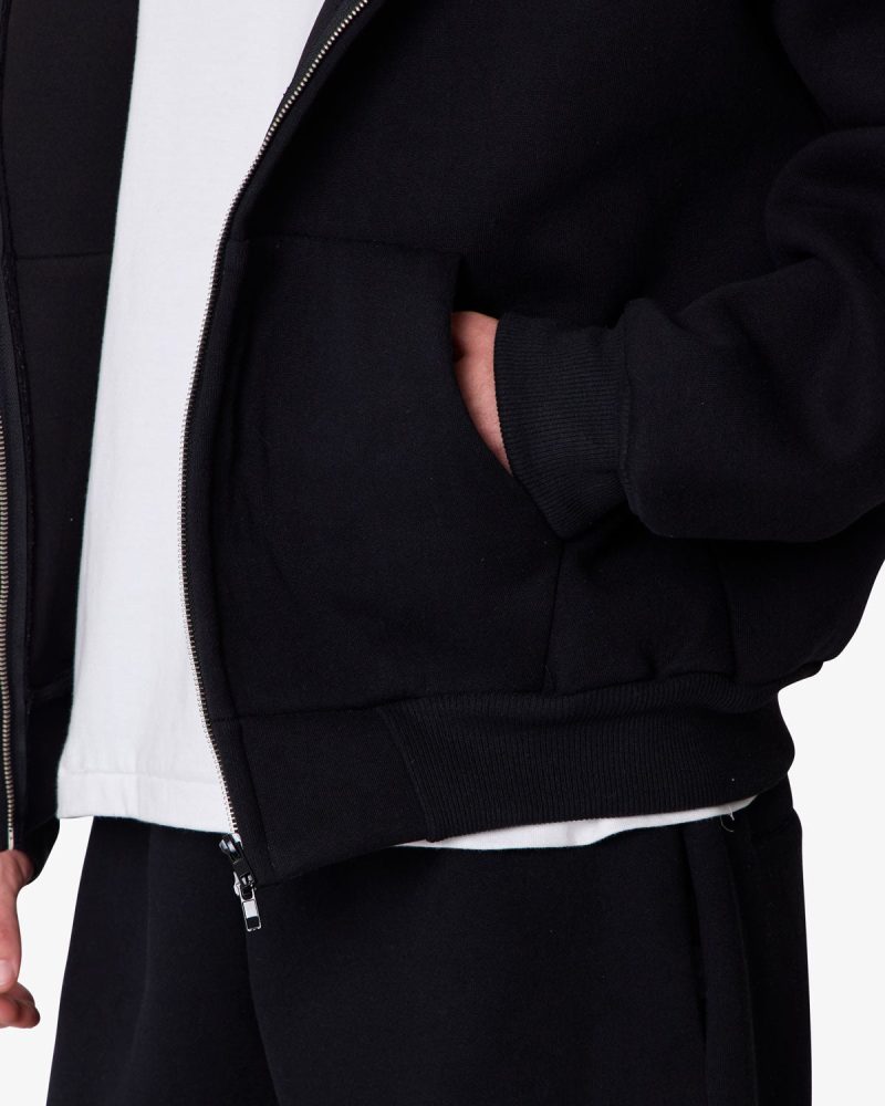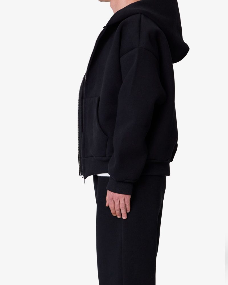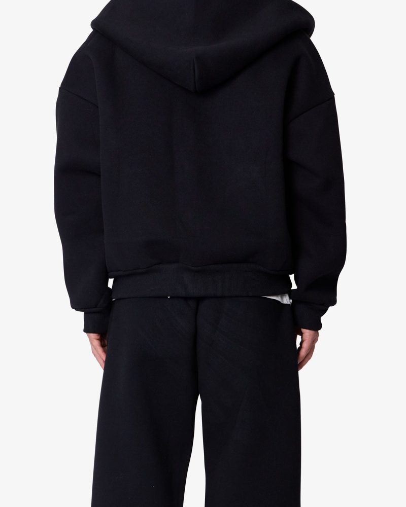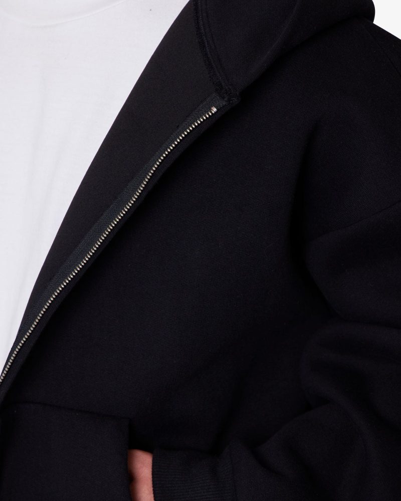 Constructed from a poly-cotton blend fused with polymide for a neoprene-like handfeel. the Stiff Lounge Zip Up Hoodie features a relaxed silhouette with dropped shoulders. Designed with a stitchless front kangaroo pocket. zip closure. and heavy ribbing at the cuffs and hem.