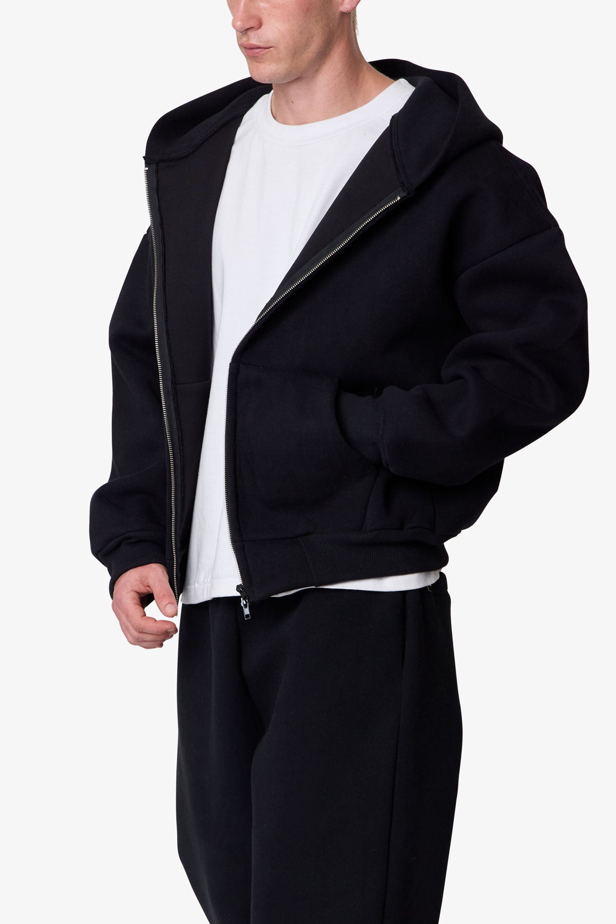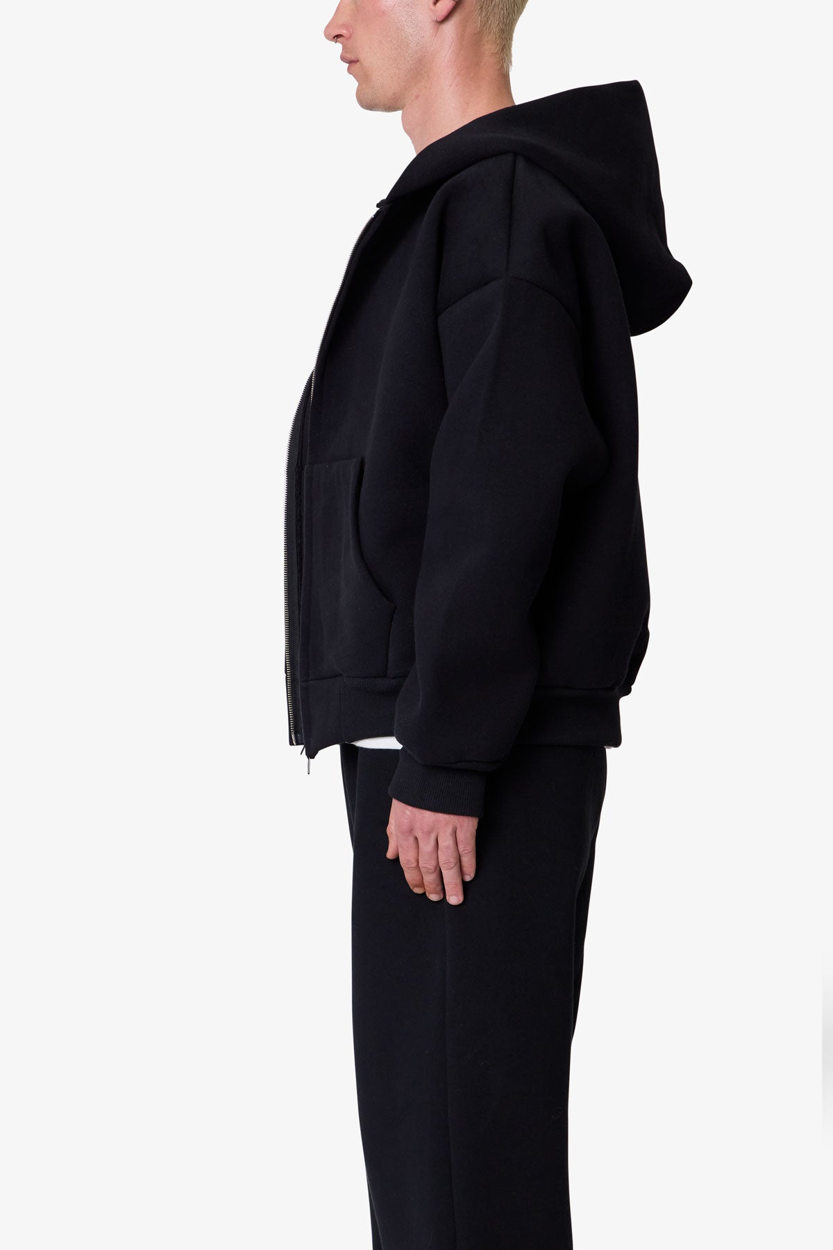 Constructed from a poly-cotton blend fused with polymide for a neoprene-like handfeel. the Stiff Lounge Zip Up Hoodie features a relaxed silhouette with dropped shoulders. Designed with a stitchless front kangaroo pocket. zip closure. and heavy ribbing at the cuffs and hem.