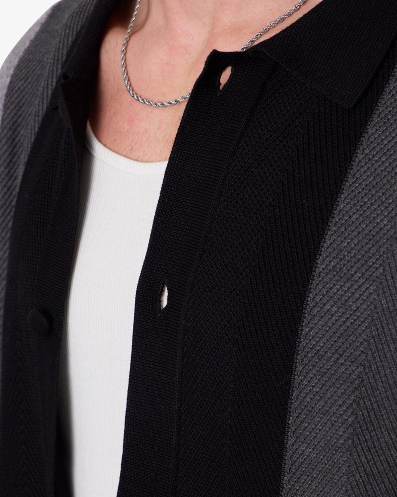 The Striped Collared Cardigan is a relaxed fit knit outerwear piece constructed with a soft yarn blend and a subtle herringbone texture. Designed with vertical color-blocked stripes. it features a collared neckline. front button placket with fabric-covered buttons. and ribbed finishes at the hem and cuffs.