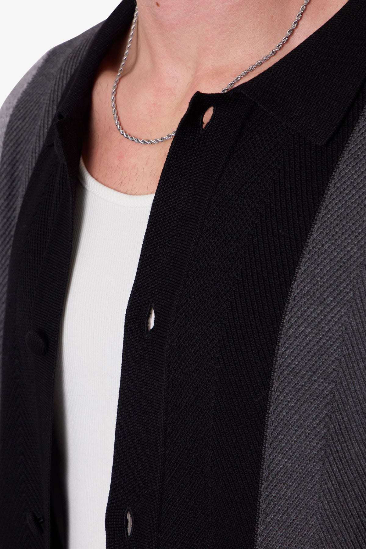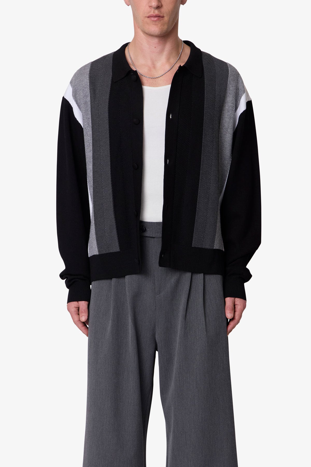 The Striped Collared Cardigan is a relaxed fit knit outerwear piece constructed with a soft yarn blend and a subtle herringbone texture. Designed with vertical color-blocked stripes. it features a collared neckline. front button placket with fabric-covered buttons. and ribbed finishes at the hem and cuffs.
