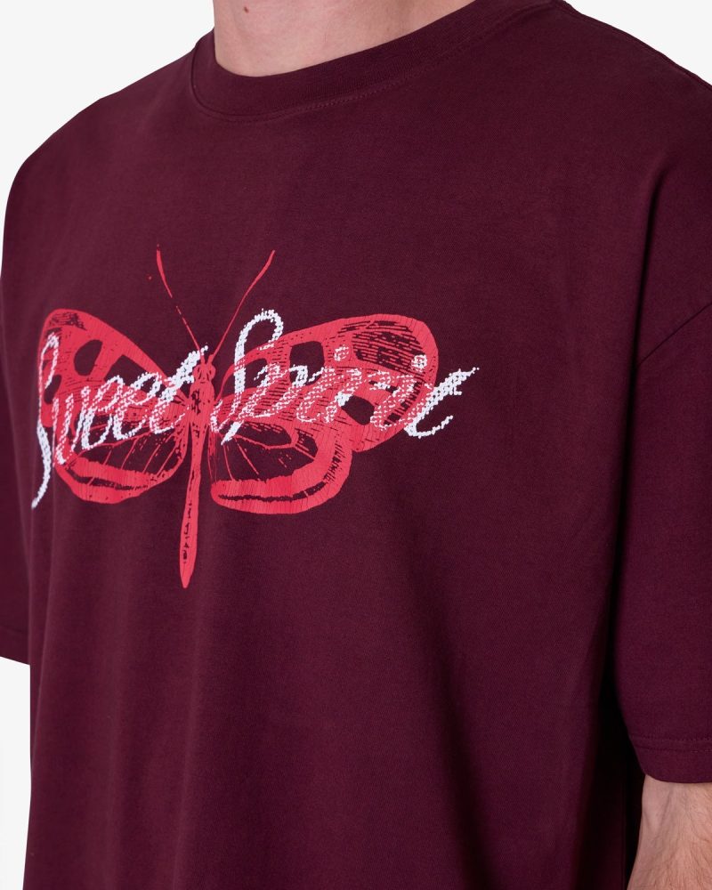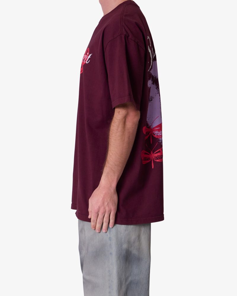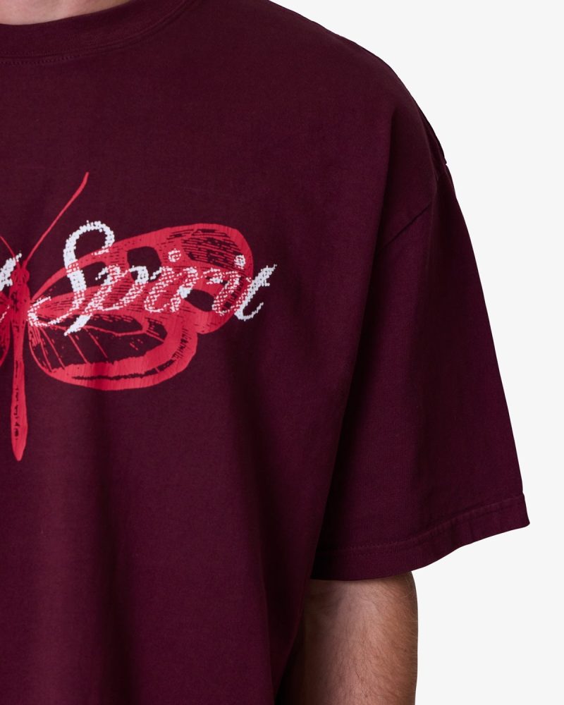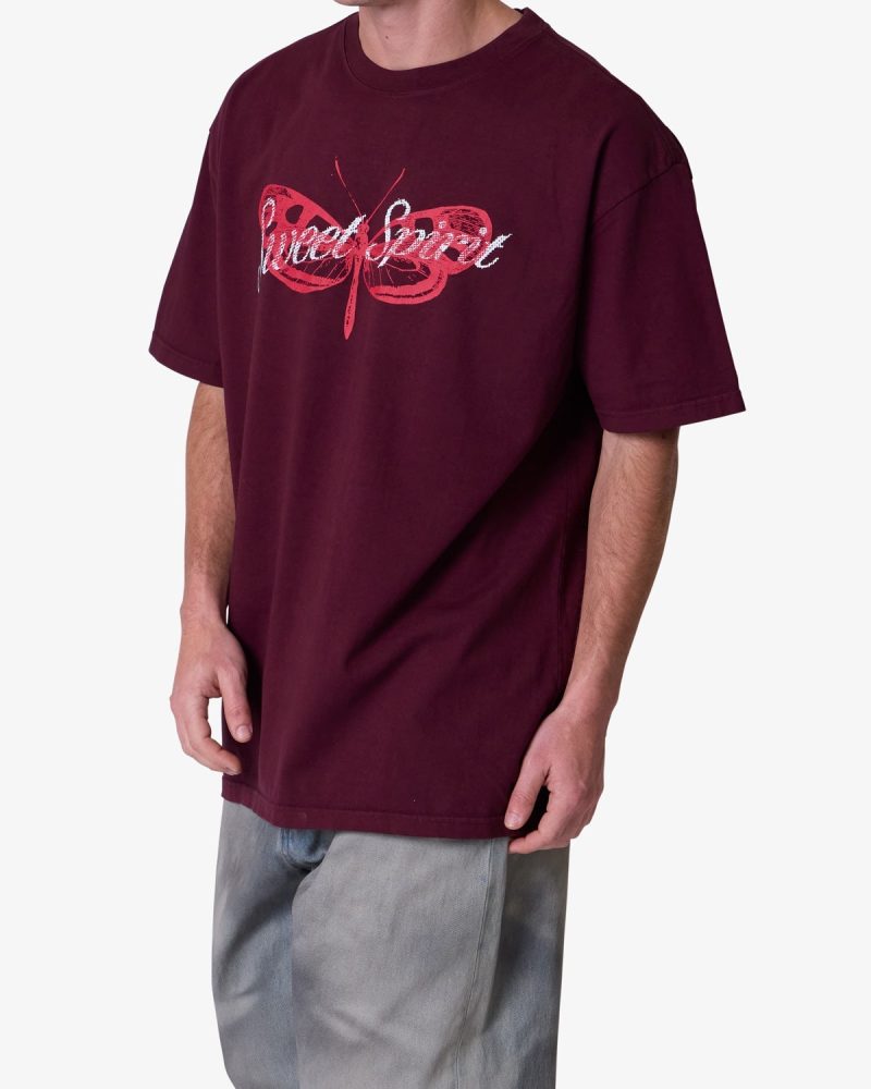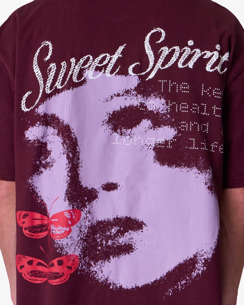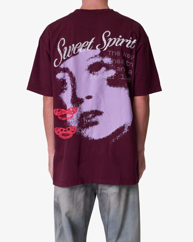 The Sweet Spirit Tee features a relaxed and boxy fit. ribbing at the neck. a standard hem. printed graphics on the front and back. and finished with a garment dye for a vintage feel.