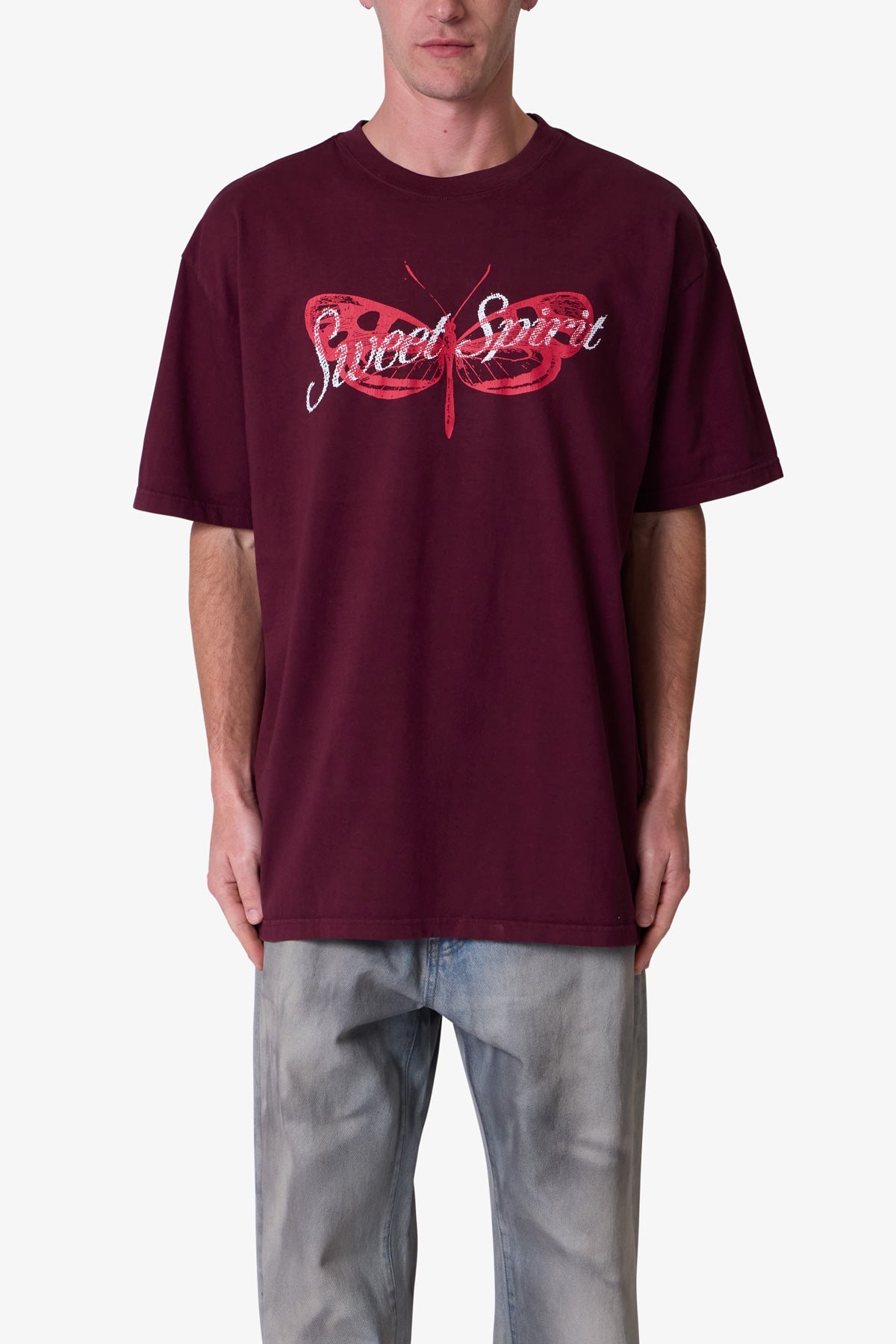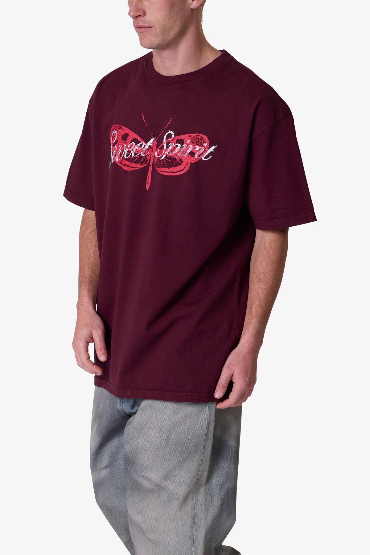 The Sweet Spirit Tee features a relaxed and boxy fit. ribbing at the neck. a standard hem. printed graphics on the front and back. and finished with a garment dye for a vintage feel.