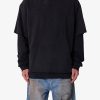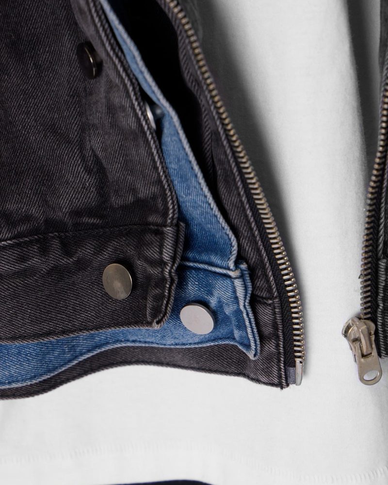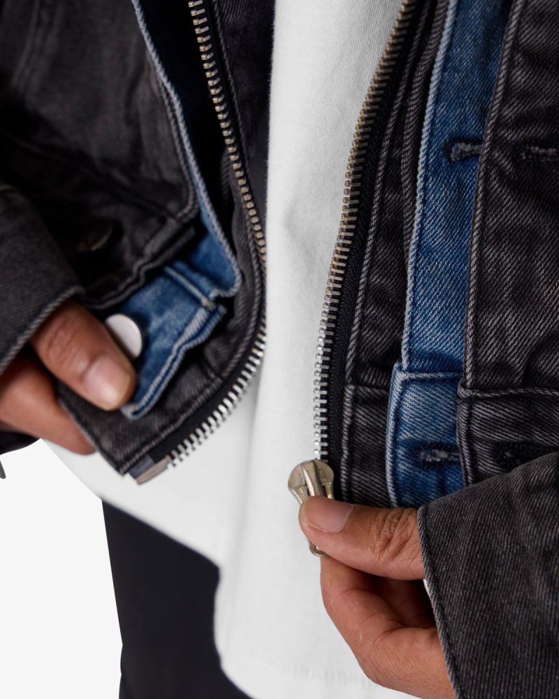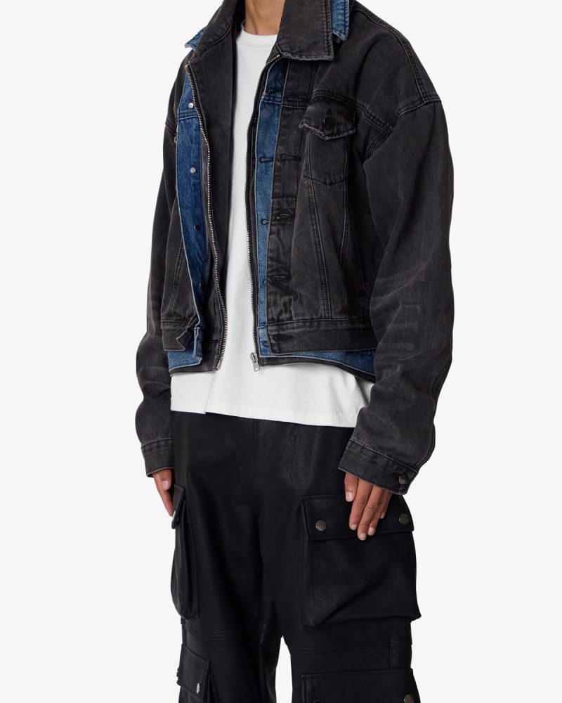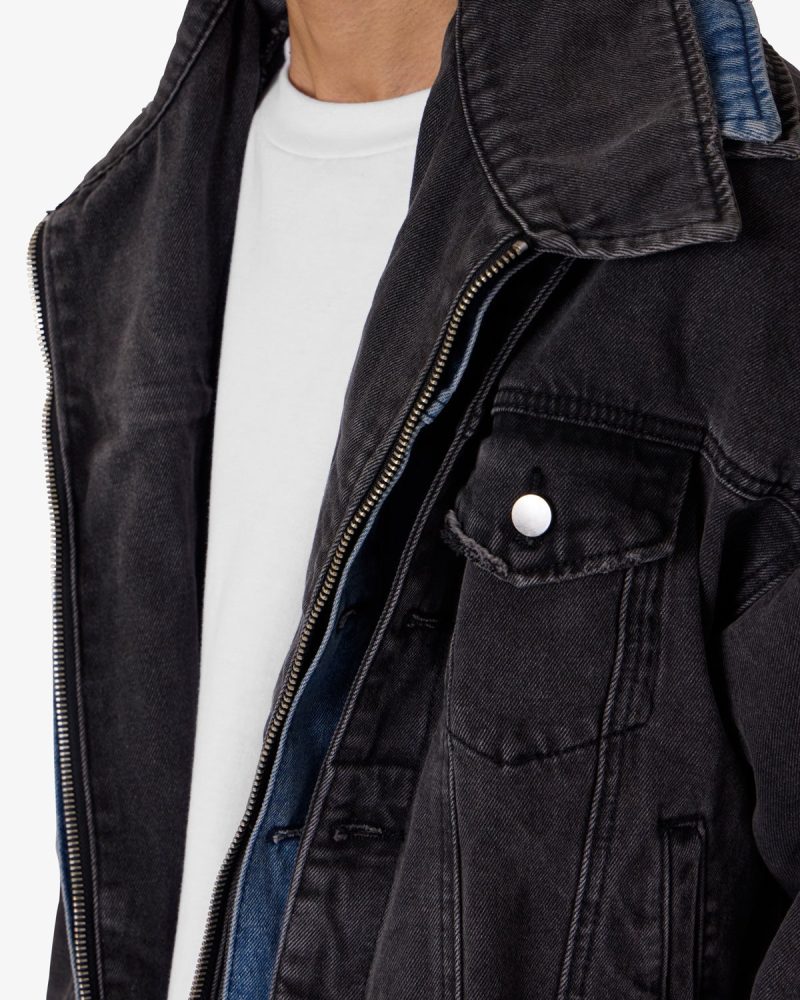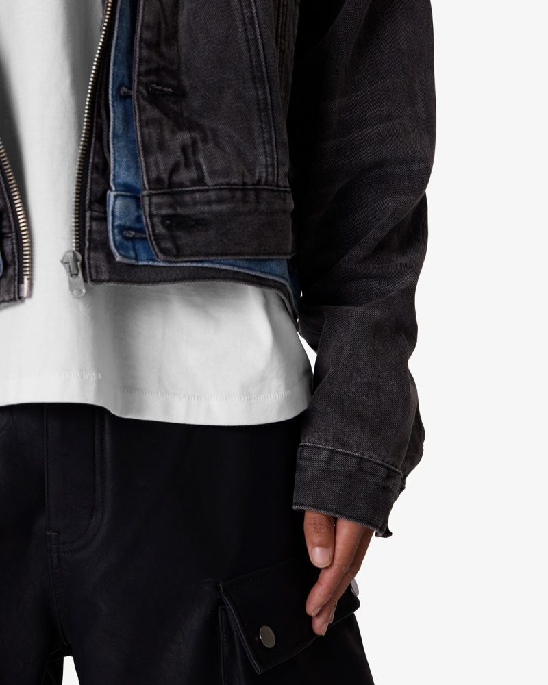 developed in Los Angeles. the Triple Threat Trucker Jacket is designed from 100% cotton denim in an oversized fit and features a classic cut and details on a triple layered jacket. The black denim base and top layer undergoes a vintage wash. with a contrasting blue denim layer.