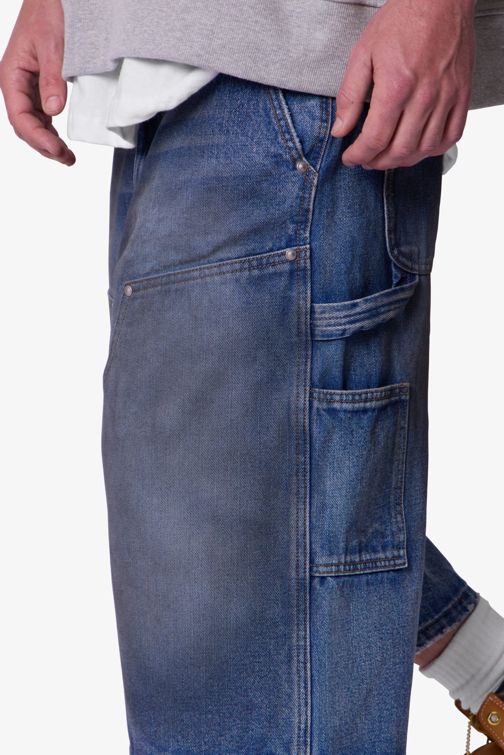 Constructed from a cotton-poly blend denim with a medium blue wash. these shorts feature a heavily treated surface with black PP spray for a vintage patina. Designed with a wide leg and exaggerated baggy fit. they include reinforced double knee panels and multiple functional pockets. Carpenter loop and workwear detailing emphasize utility. while riveted slant pockets and standard belt loops provide durability and structure. Finished with a front button fly.