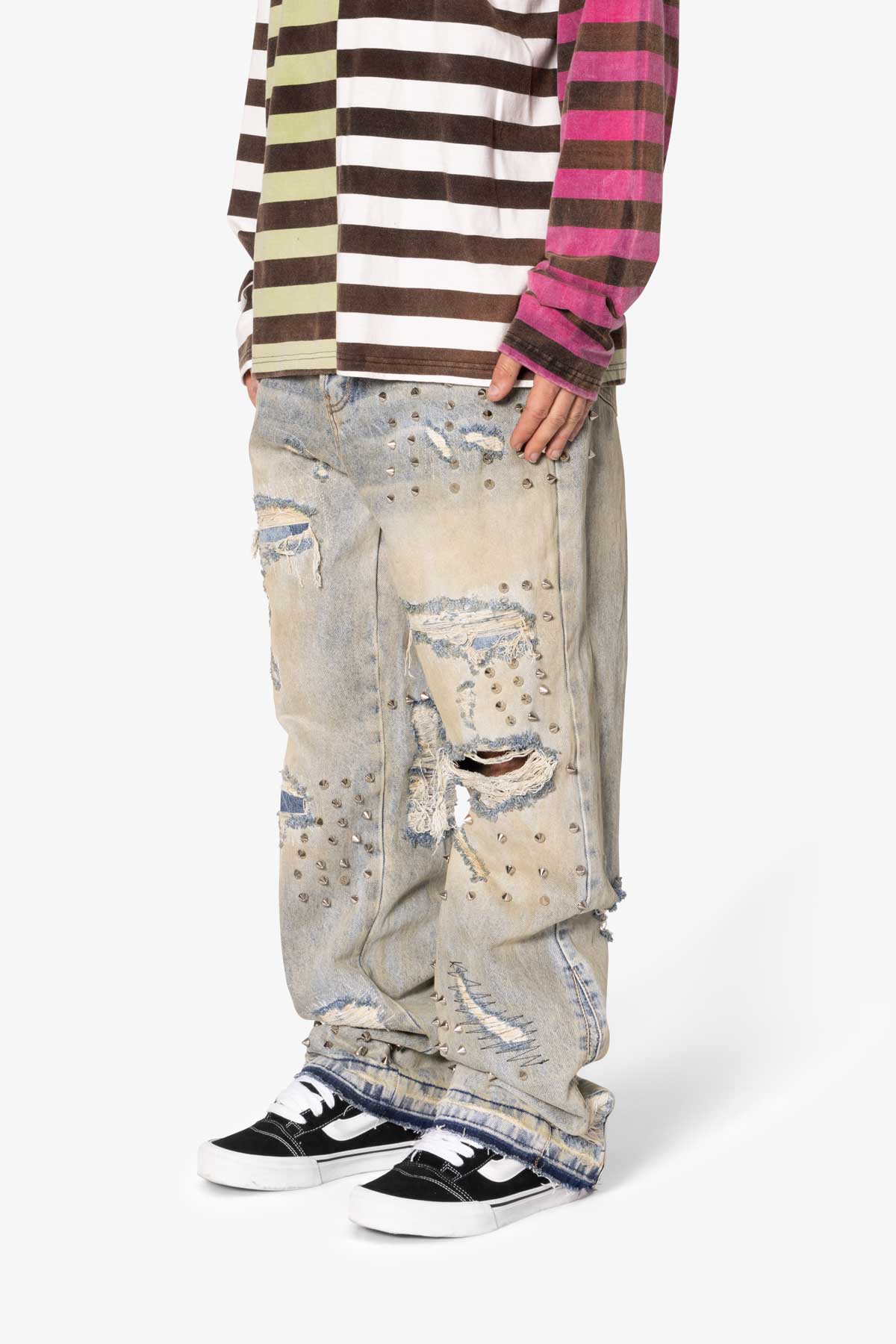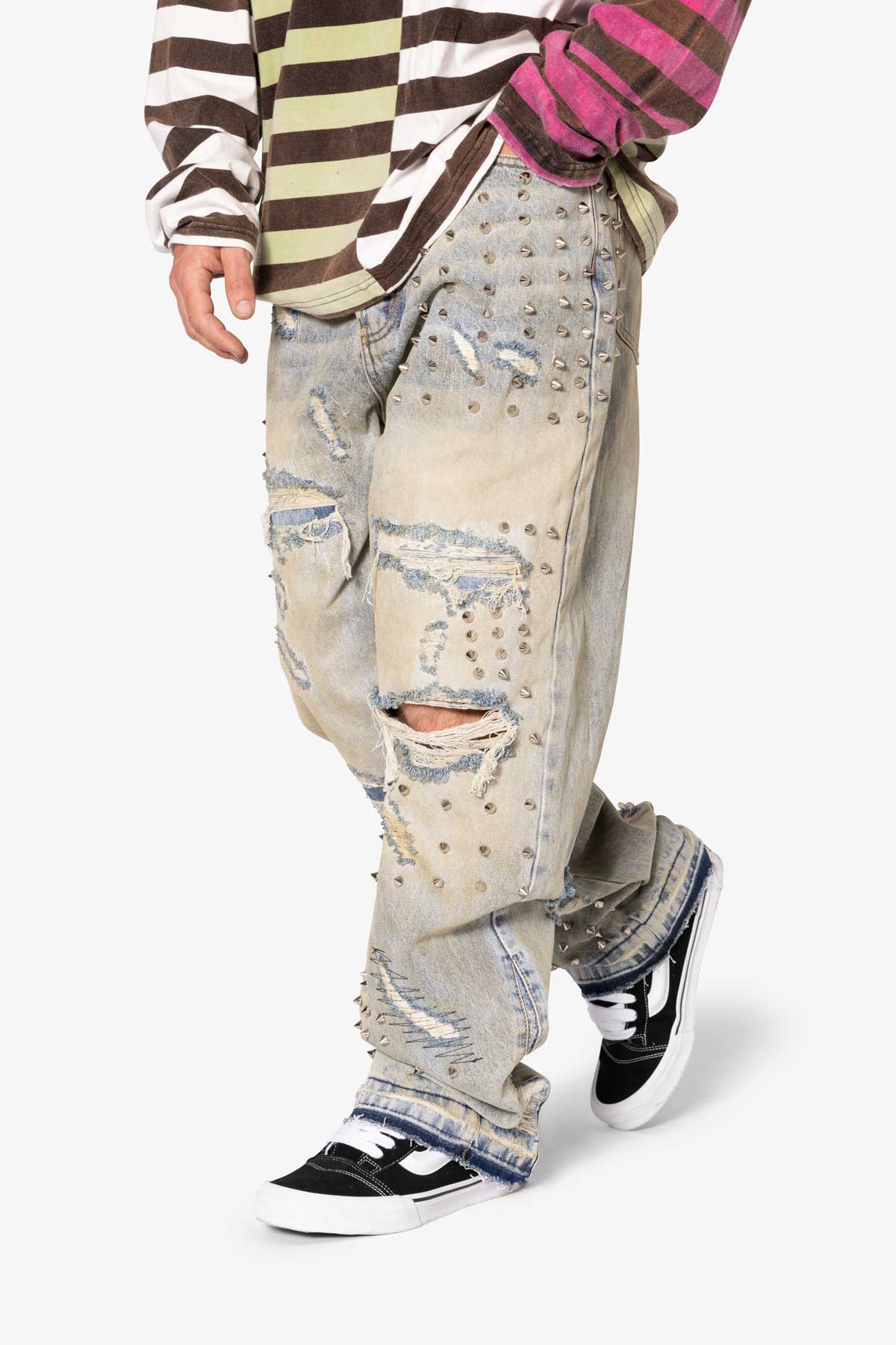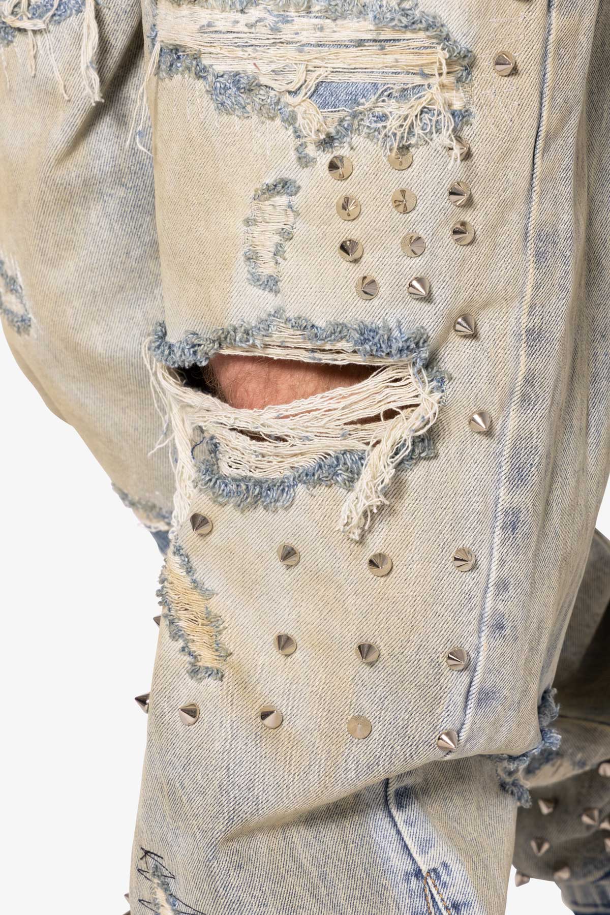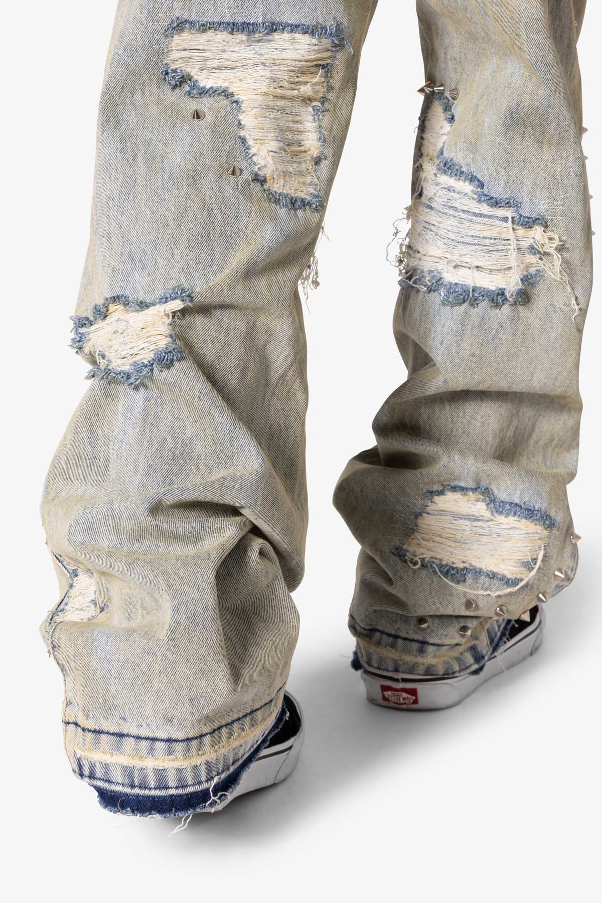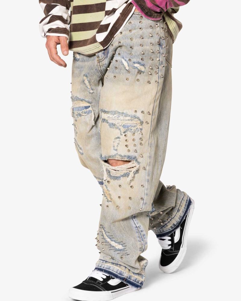 the Ultra Baggy Emo Denim are designed with a new oversized ultra baggy fit. constructed from 100% cotton denim faded blue vintage wash. featuring sporadic spike studding and distressing throughout.
