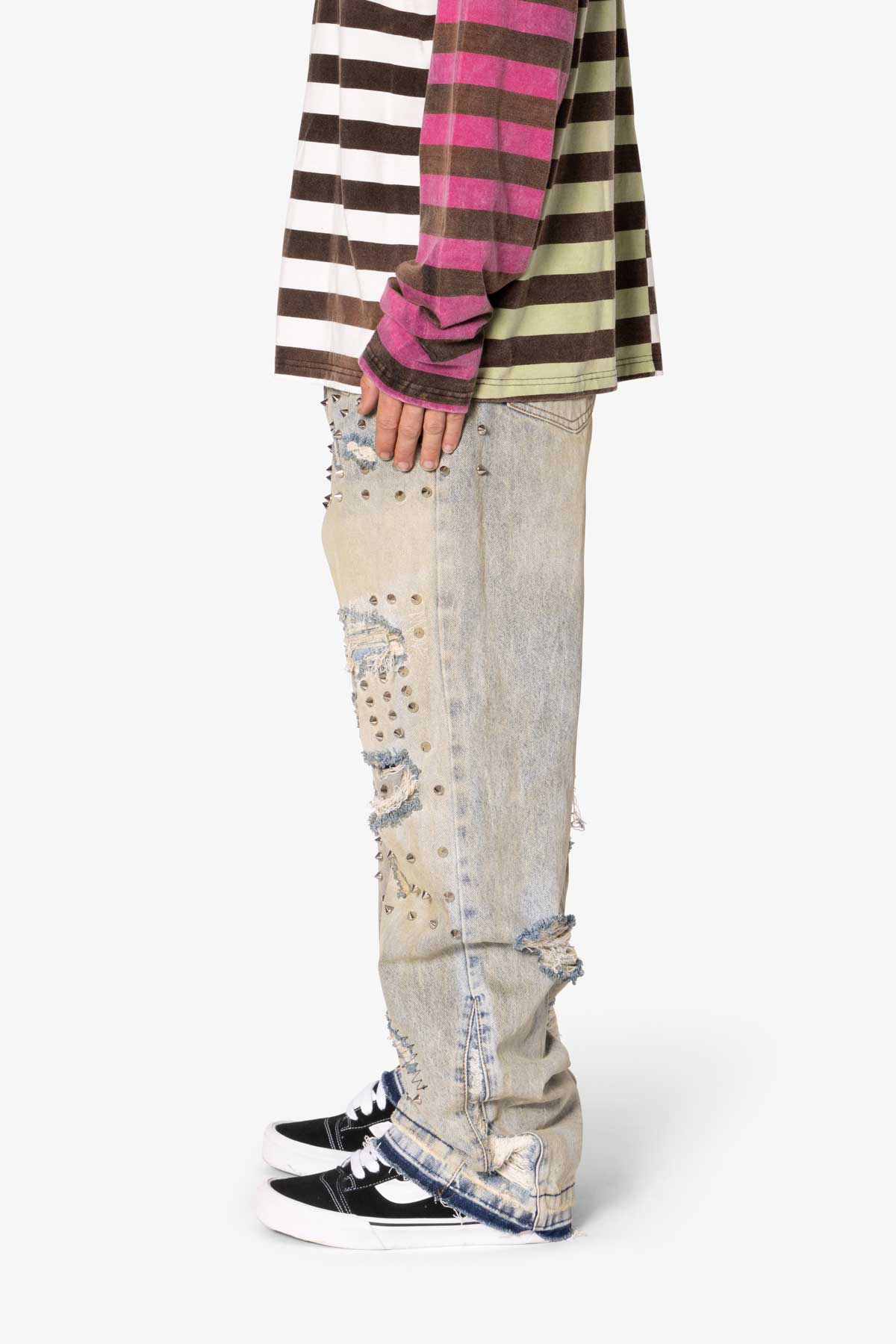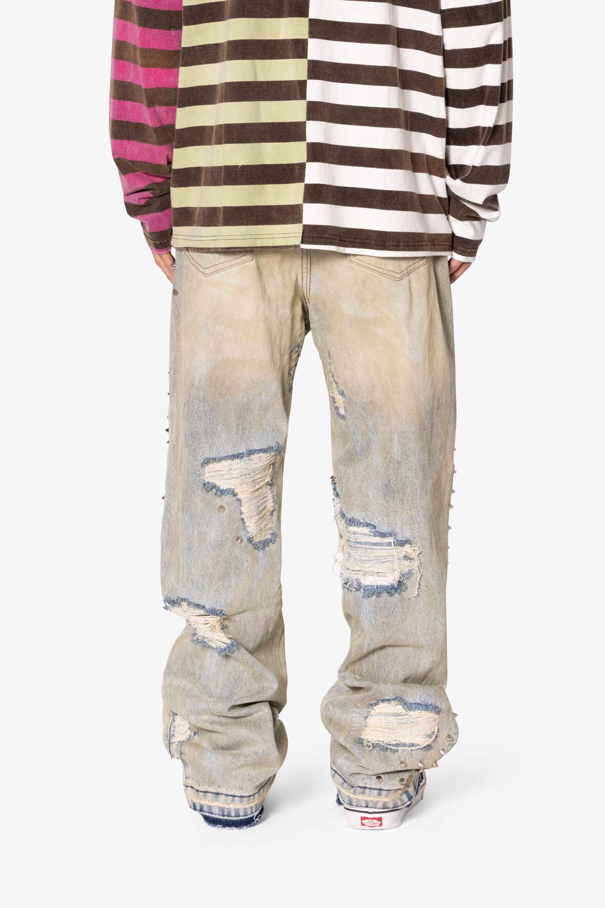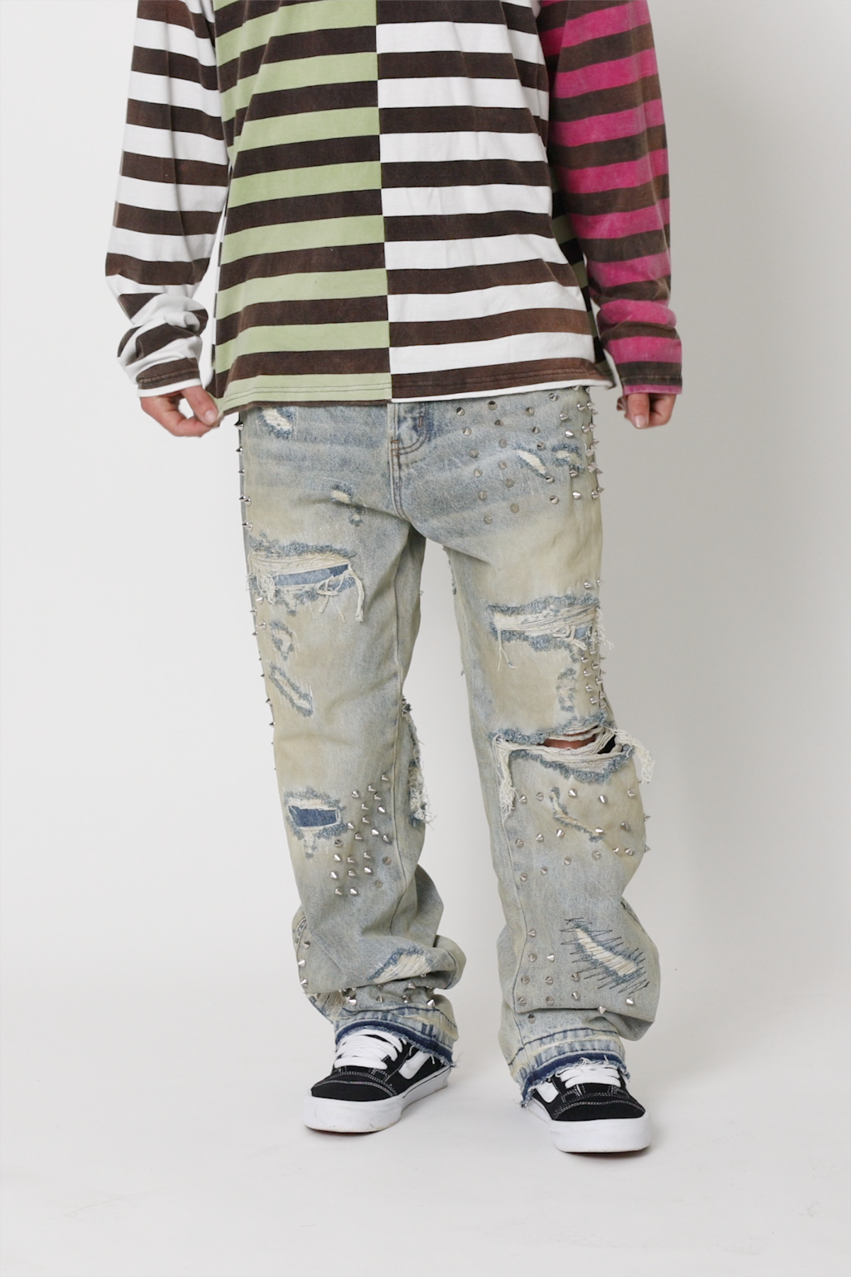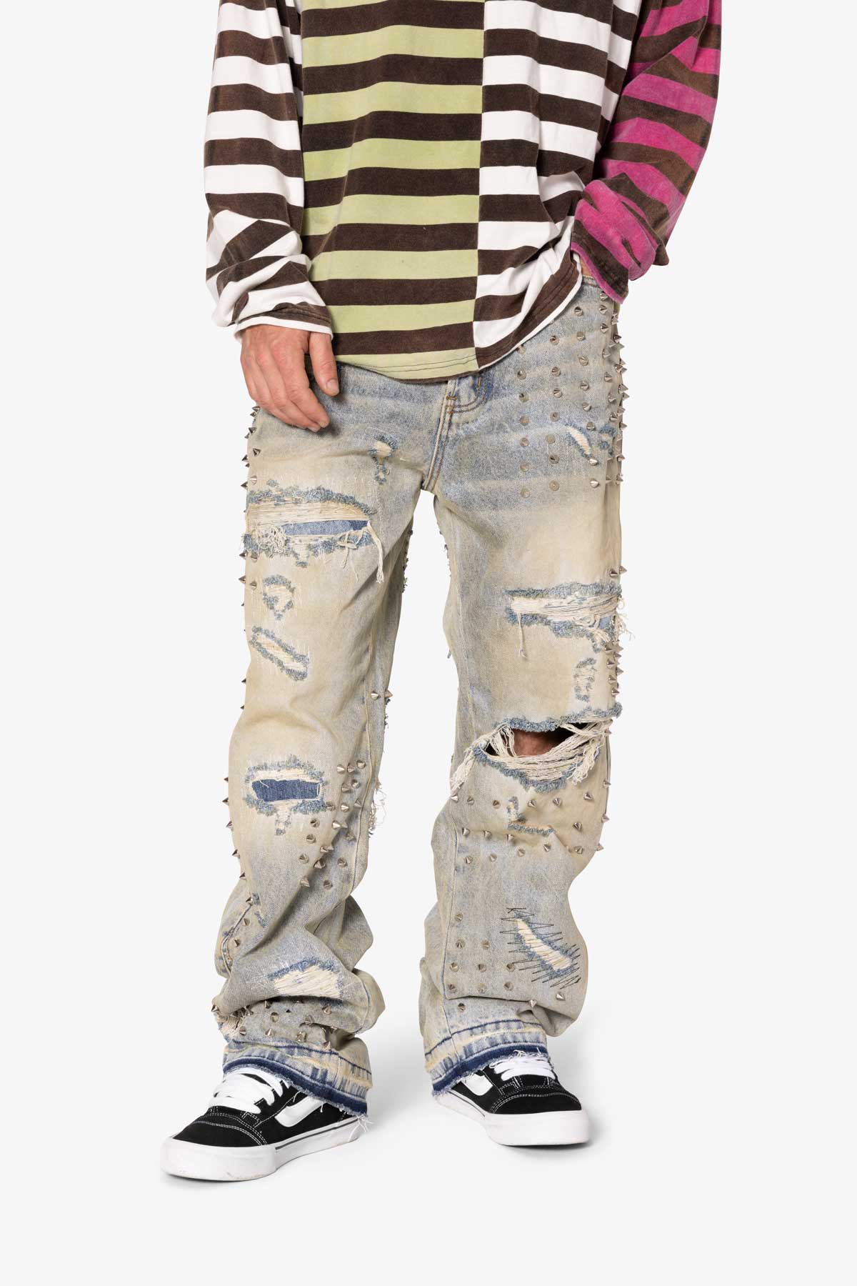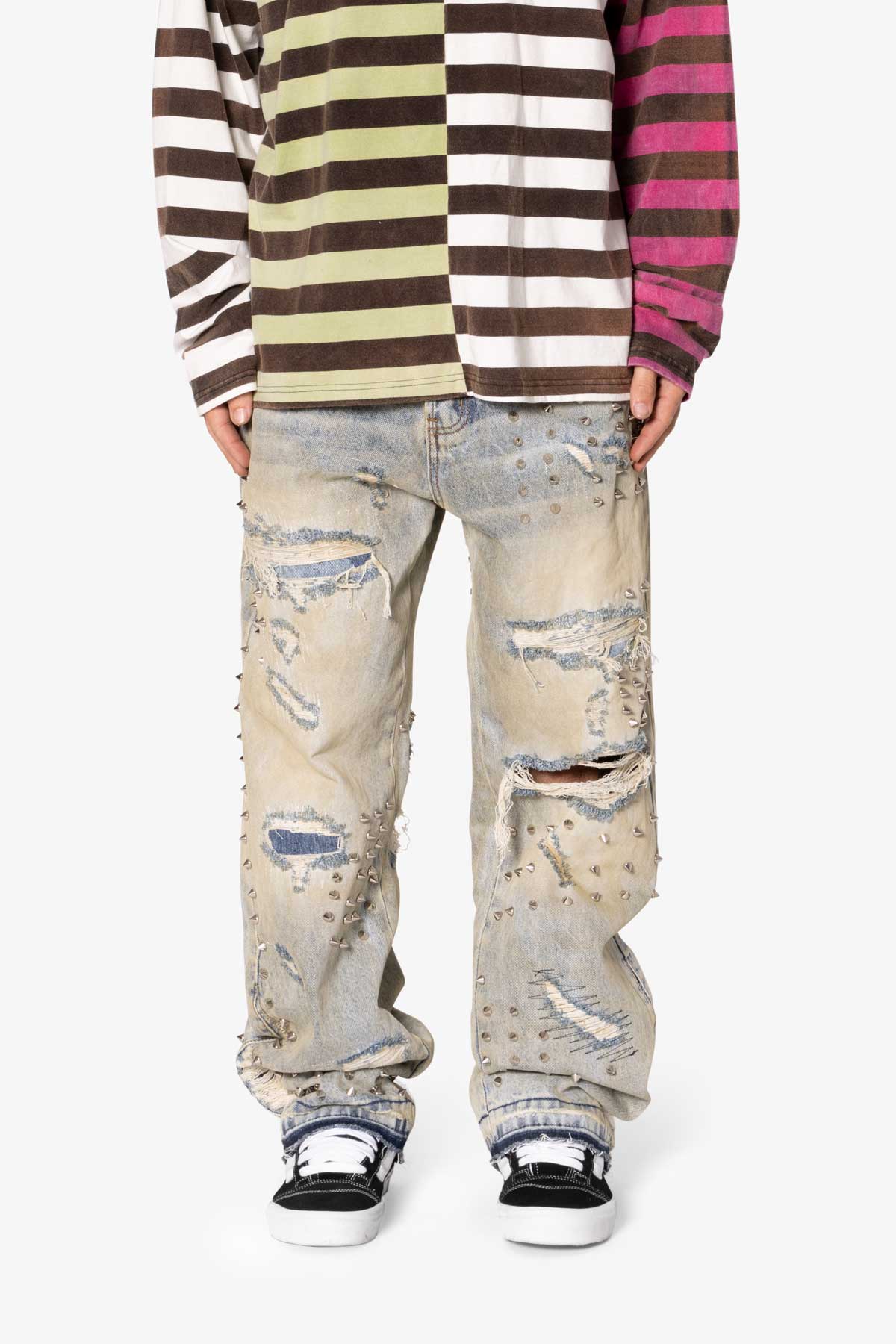 the Ultra Baggy Emo Denim are designed with a new oversized ultra baggy fit. constructed from 100% cotton denim faded blue vintage wash. featuring sporadic spike studding and distressing throughout.