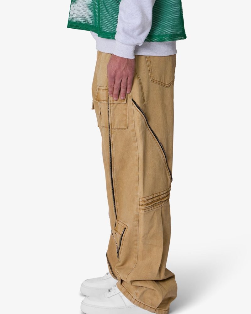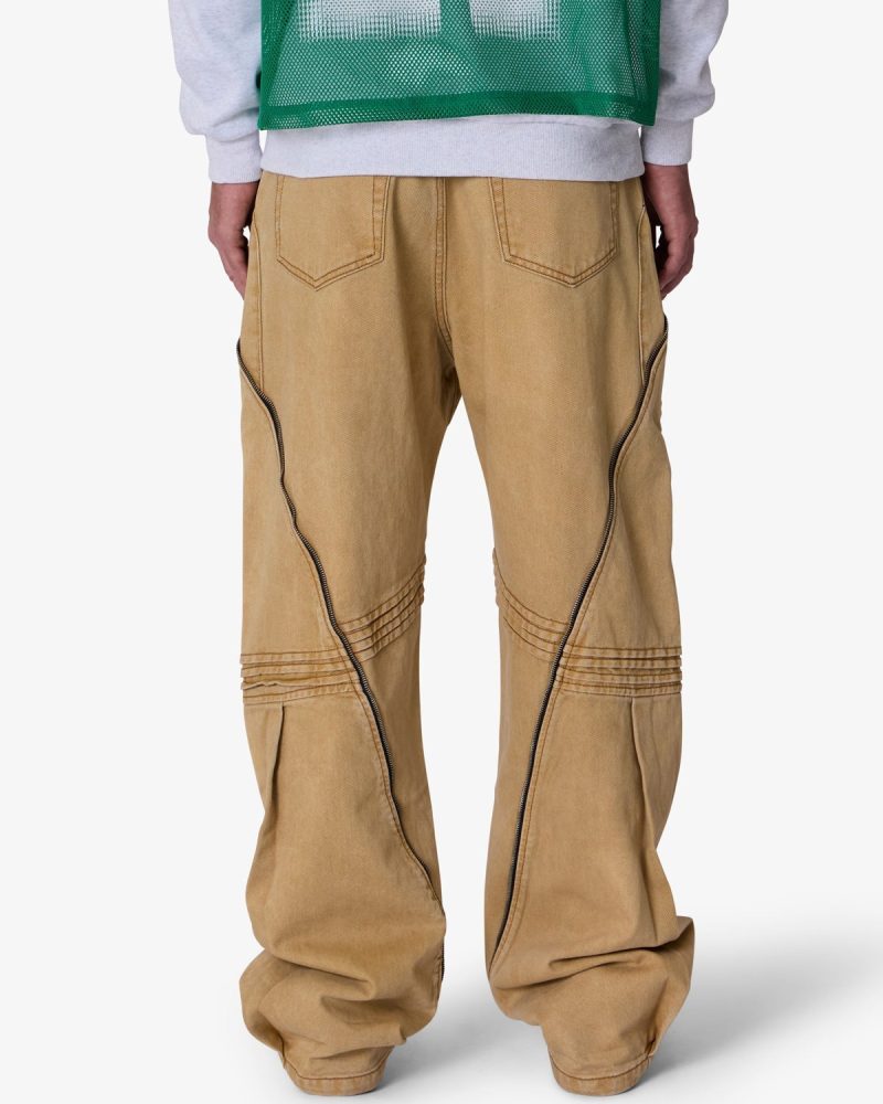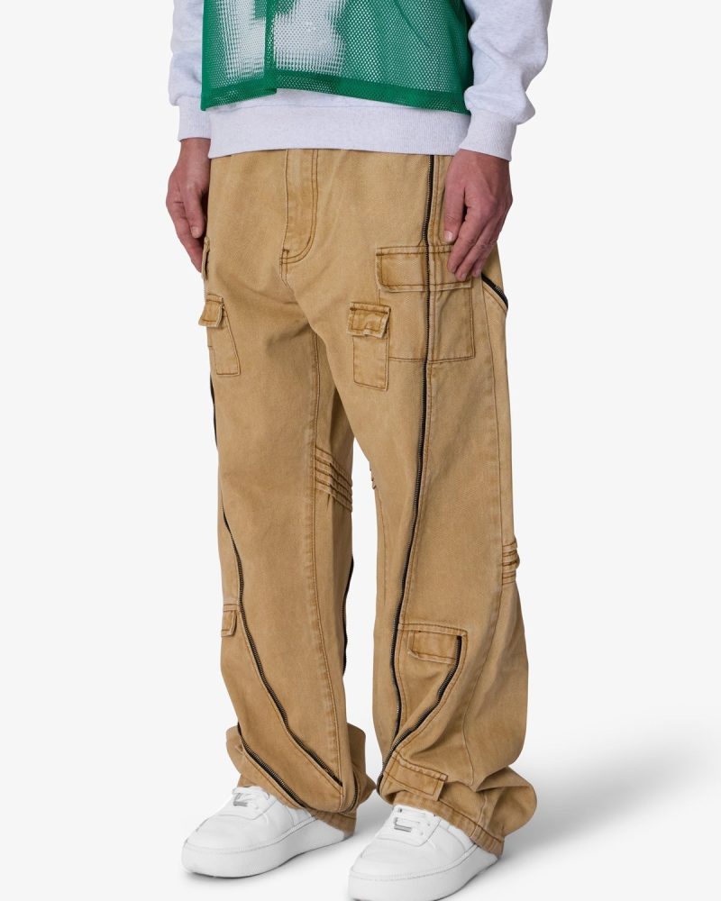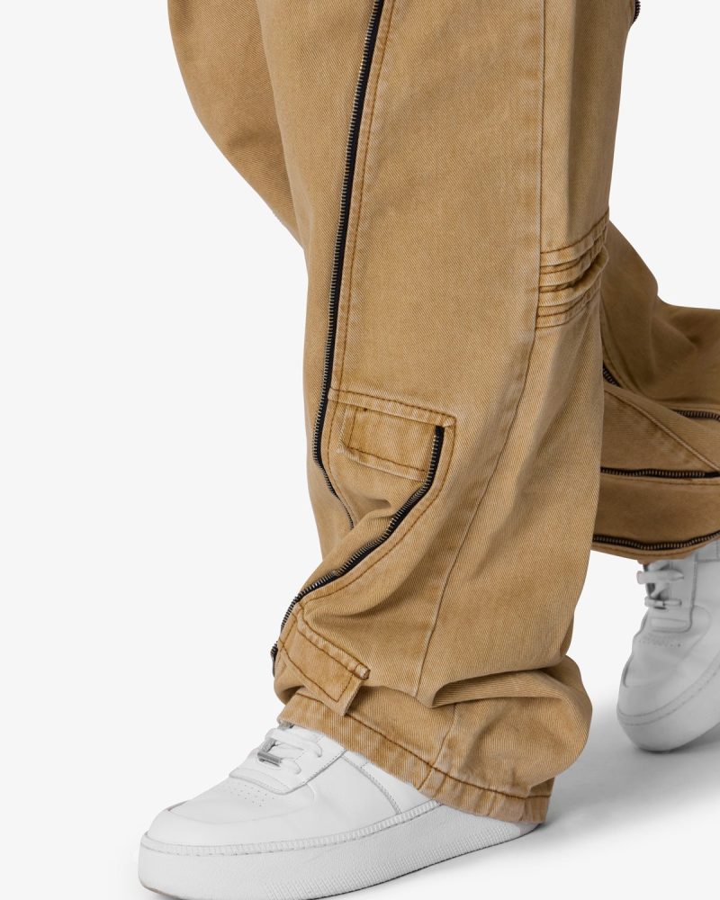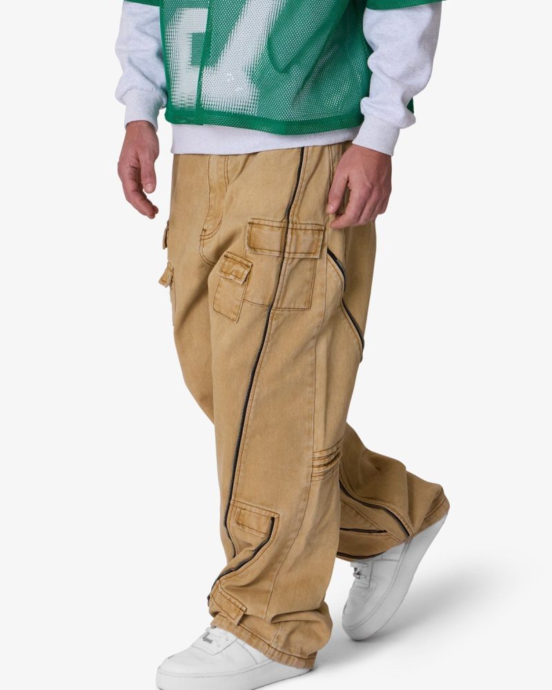 the Ultra Baggy Grid Lock Denim are designed with a new oversized ultra baggy fit. constructed from a tan denim with a vintage wash. featuring cargo pocket details throughout and finished with exposed zipper details down the legs.