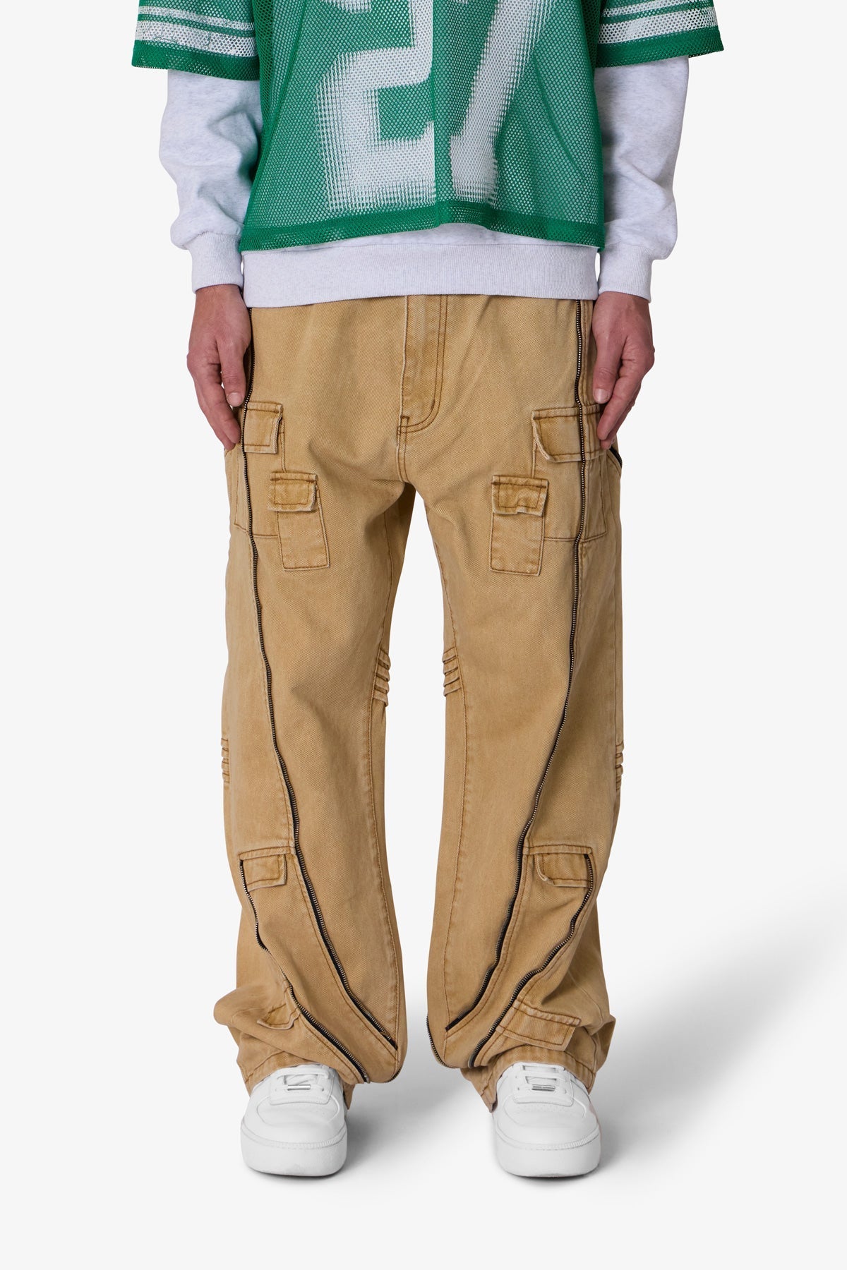 the Ultra Baggy Grid Lock Denim are designed with a new oversized ultra baggy fit. constructed from a tan denim with a vintage wash. featuring cargo pocket details throughout and finished with exposed zipper details down the legs.