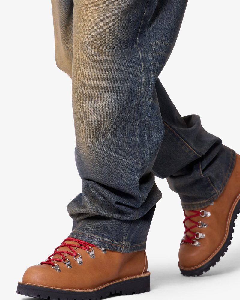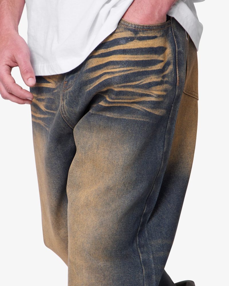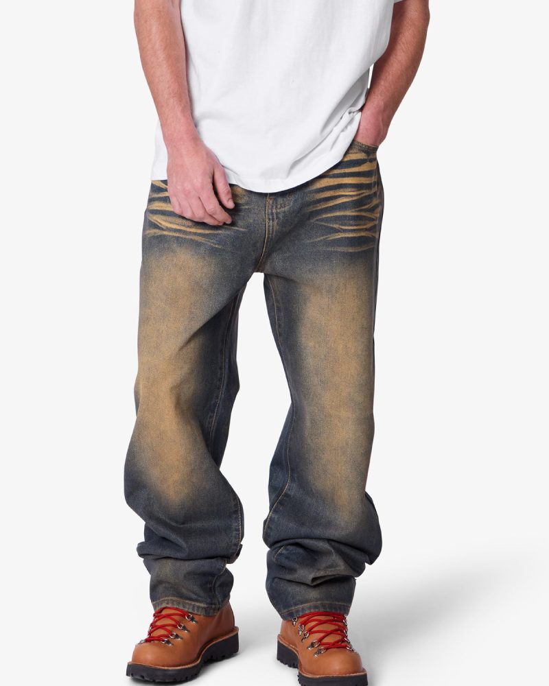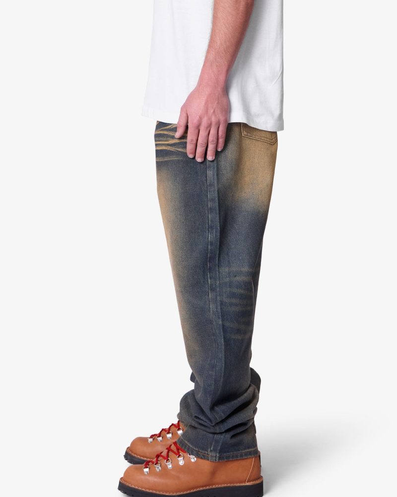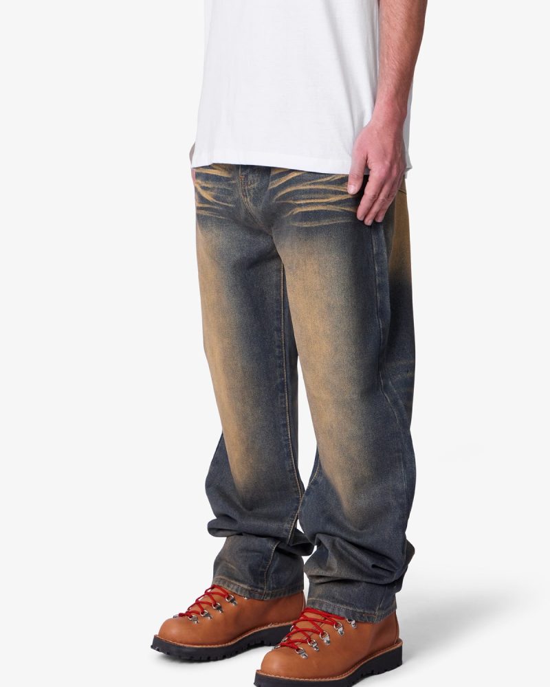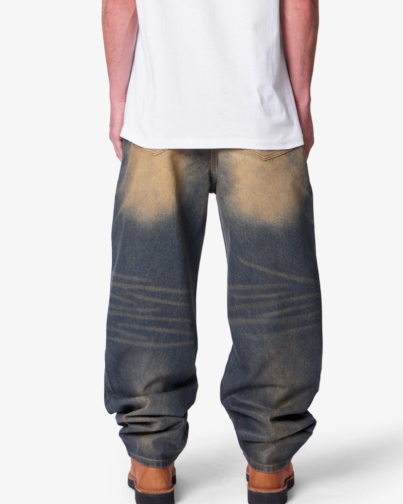 Constructed from 13 oz 100% cotton denim with a dark vintage blue wash. the Ultra Baggy High Low Denim features an ultra baggy fit with a longer-than-standard rise. Designed with high contrast whiskering and a yellow acid pp spray effect. this style delivers a pronounced tonal variation throughout. Finished with a classic five-pocket layout.
