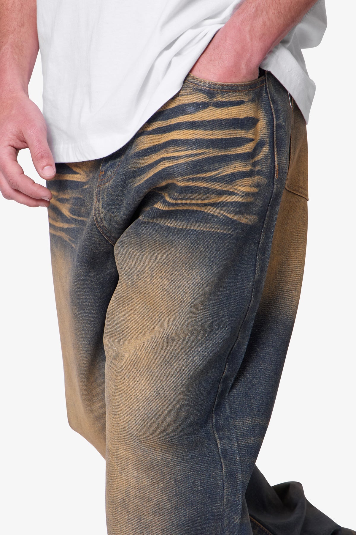 Constructed from 13 oz 100% cotton denim with a dark vintage blue wash. the Ultra Baggy High Low Denim features an ultra baggy fit with a longer-than-standard rise. Designed with high contrast whiskering and a yellow acid pp spray effect. this style delivers a pronounced tonal variation throughout. Finished with a classic five-pocket layout.