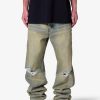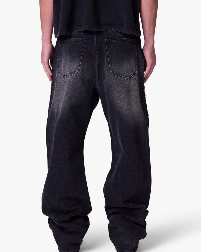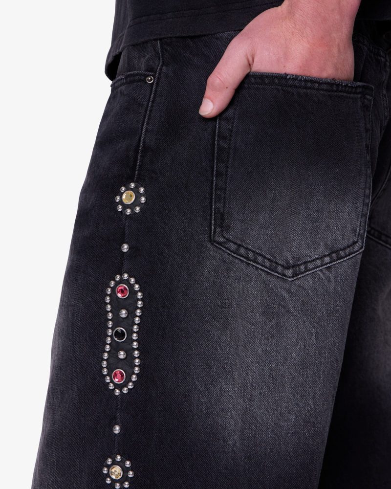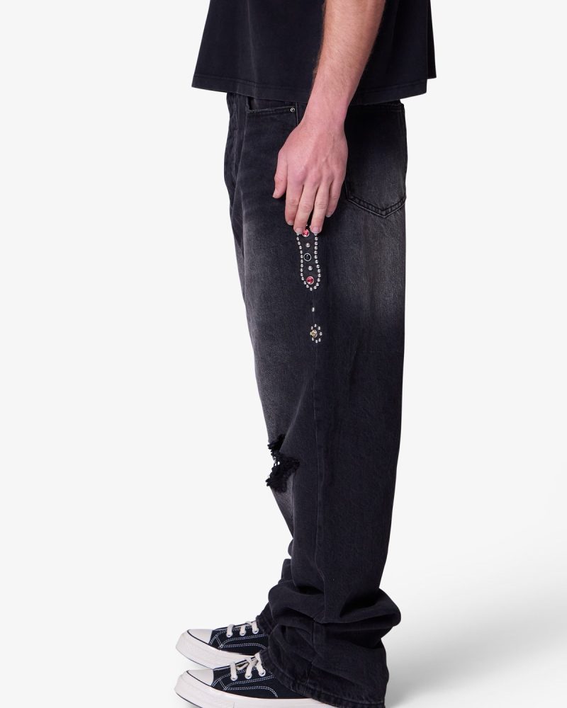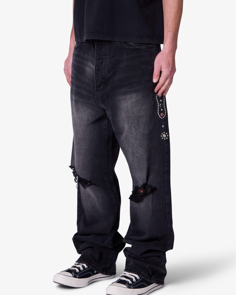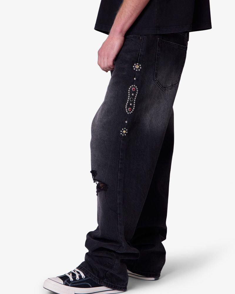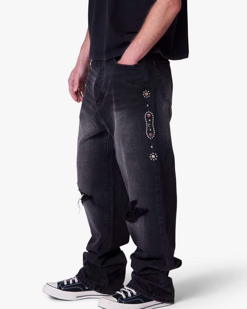 Part of our . the Ultra Baggy Mojave Denim are designed with a new oversized ultra baggy fit. constructed from denim with a vintage wash. featuring standard five pocket denim details. distressing at the knees. a button placket. and finished with stud and jewel details along the outseam.