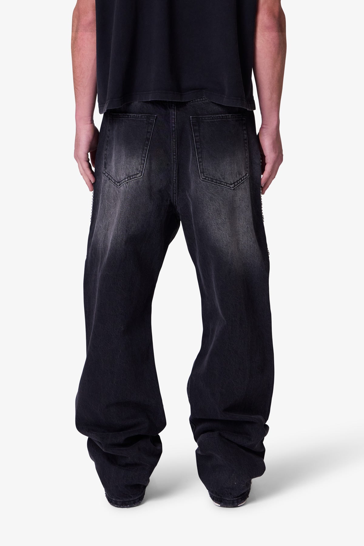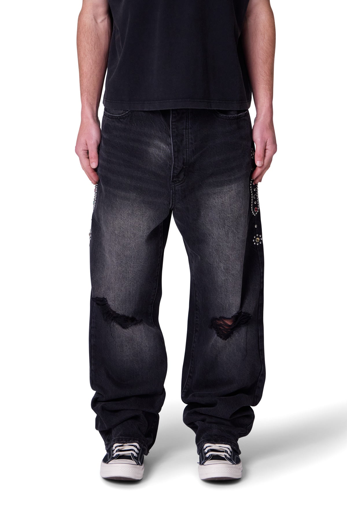 Part of our . the Ultra Baggy Mojave Denim are designed with a new oversized ultra baggy fit. constructed from denim with a vintage wash. featuring standard five pocket denim details. distressing at the knees. a button placket. and finished with stud and jewel details along the outseam.