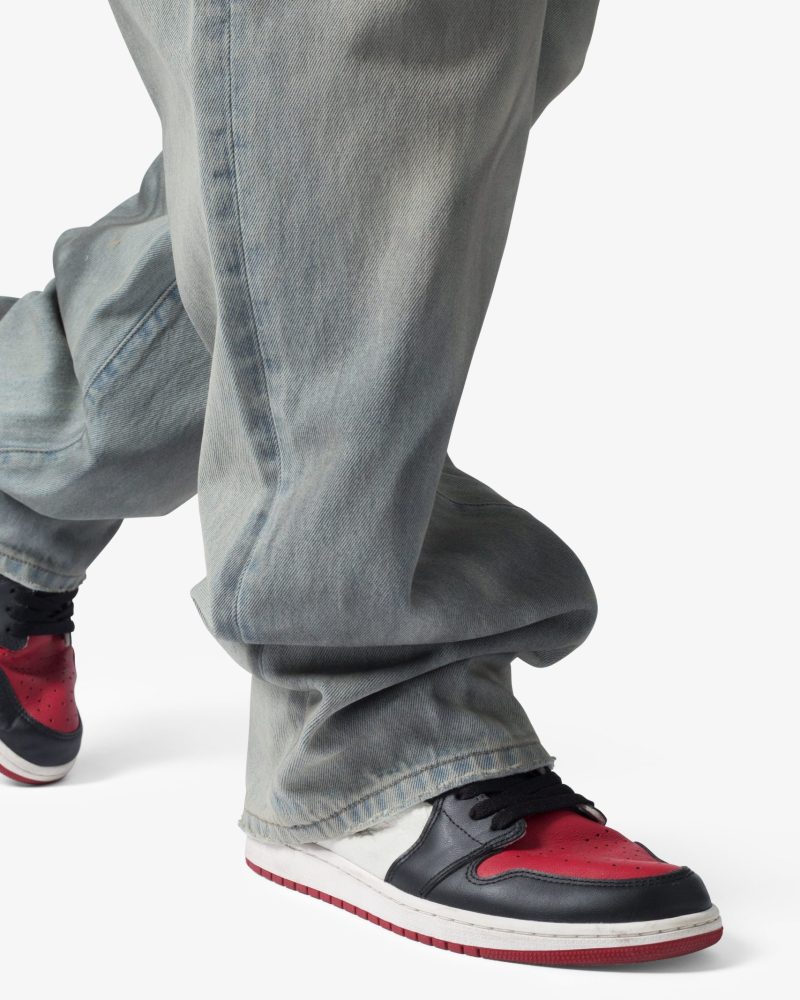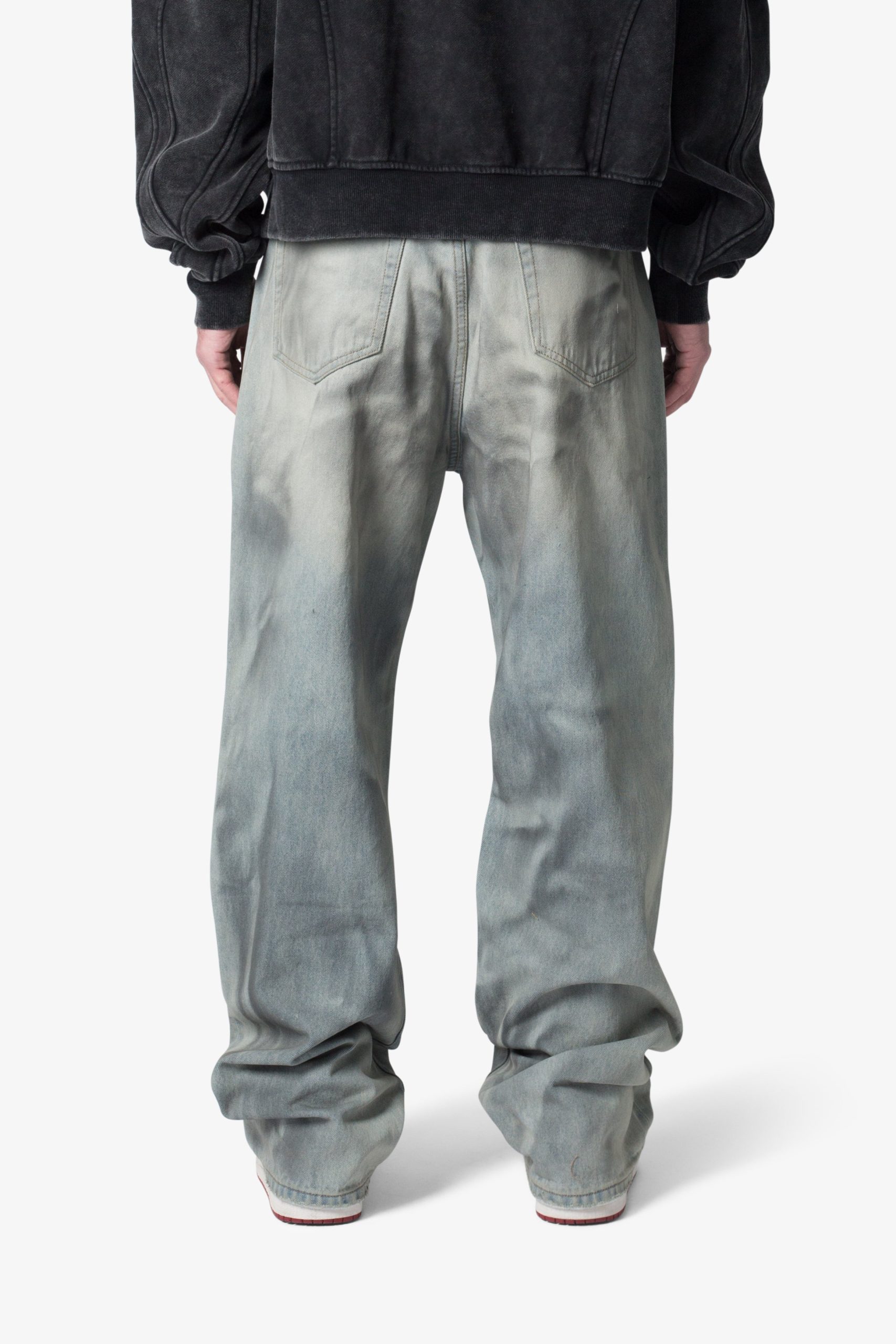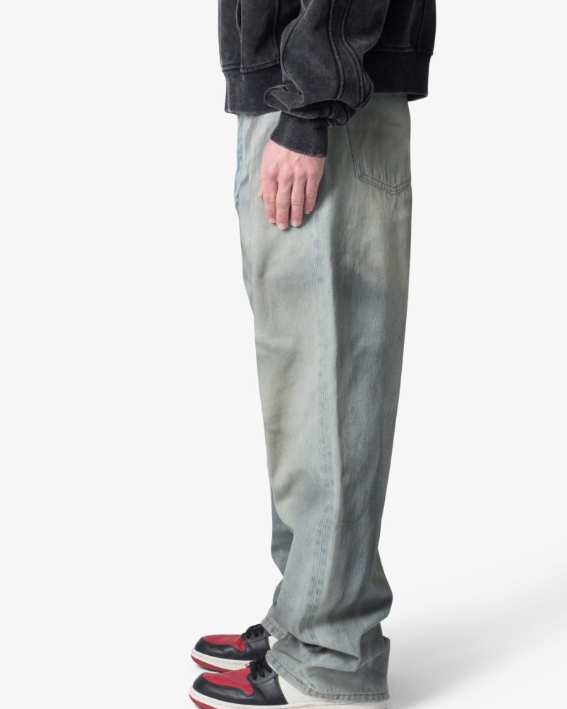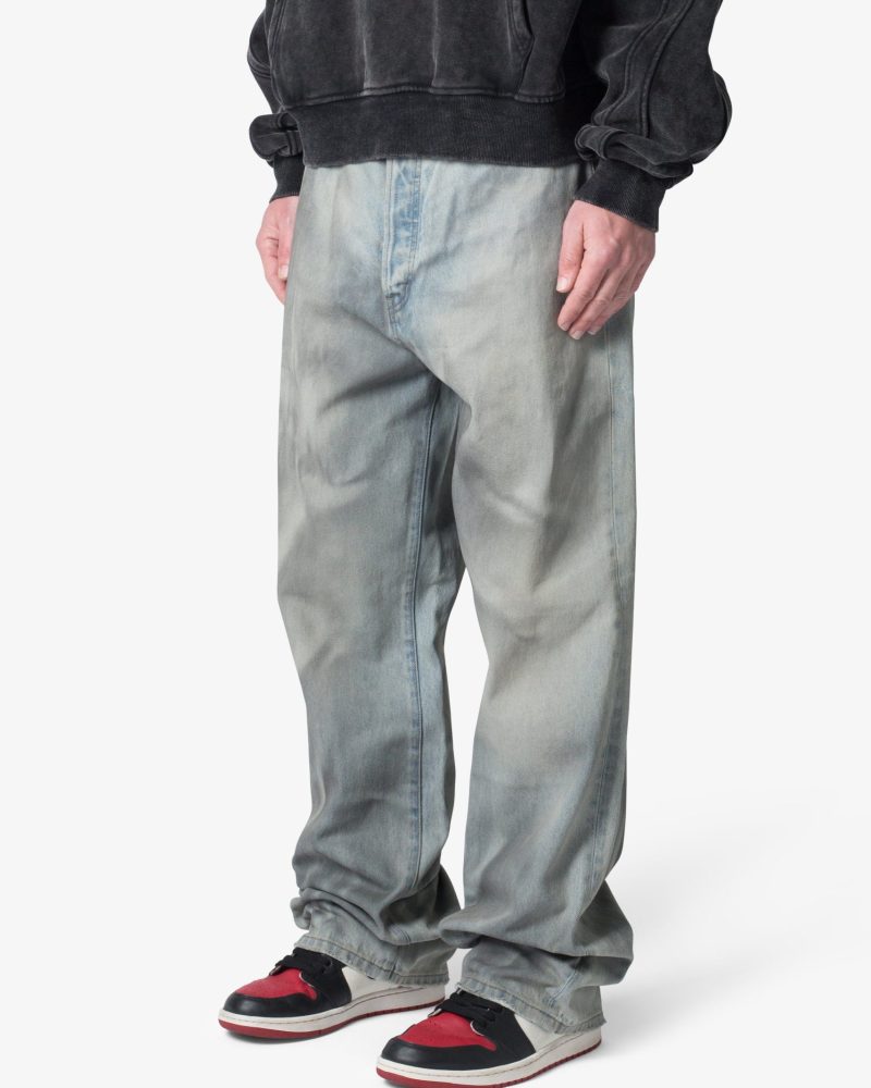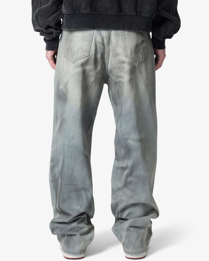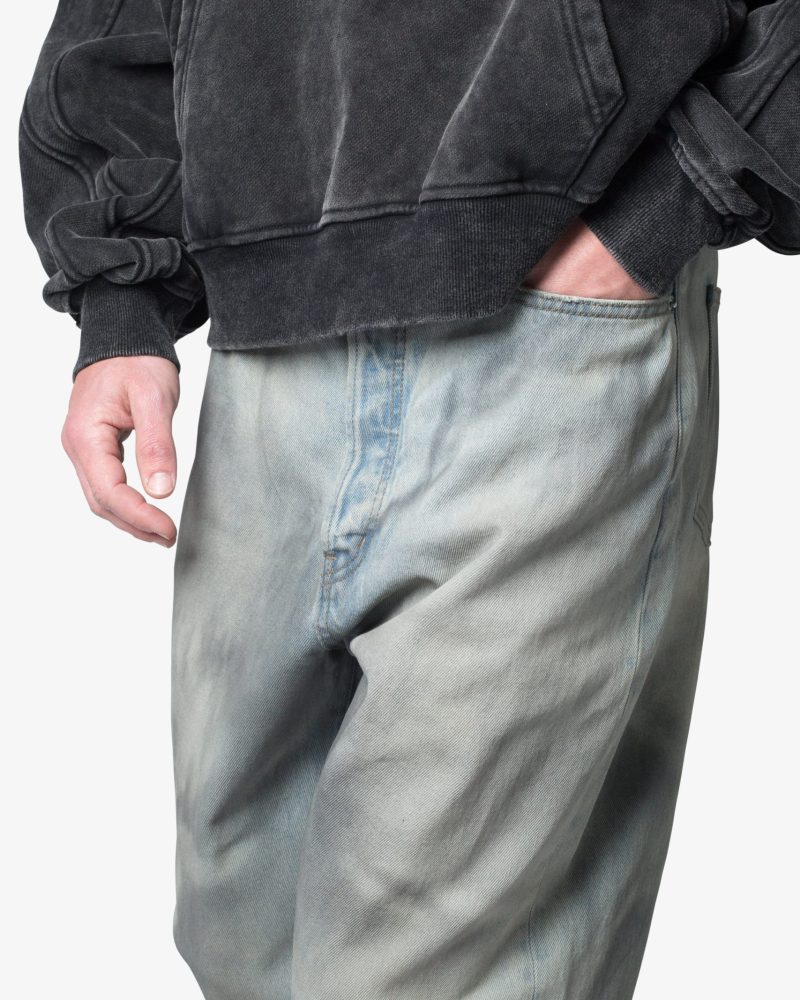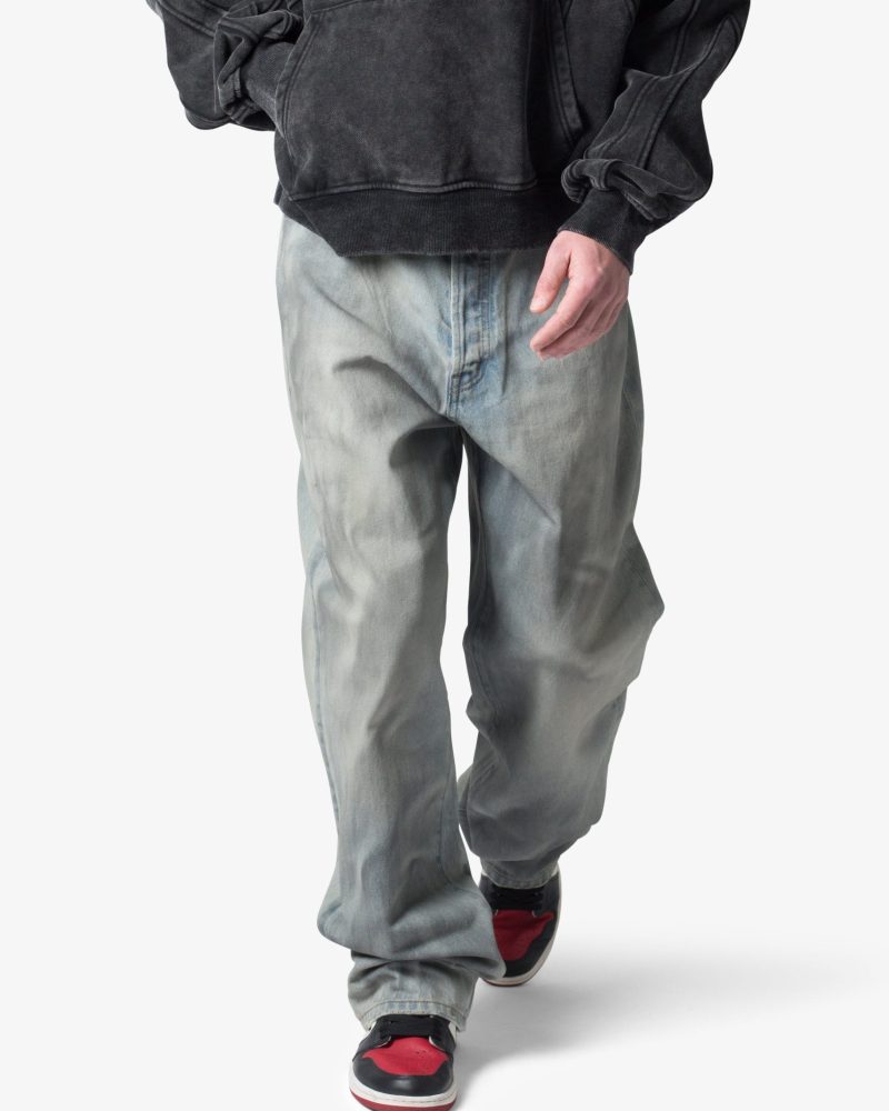 the Ultra Baggy Oil Stain Denim are designed with a new oversized ultra baggy fit. constructed from denim with a light wash with an dark natural tint. featuring standard five pocket denim details. and finished with a button placket.