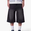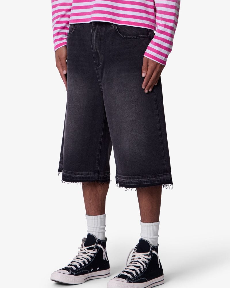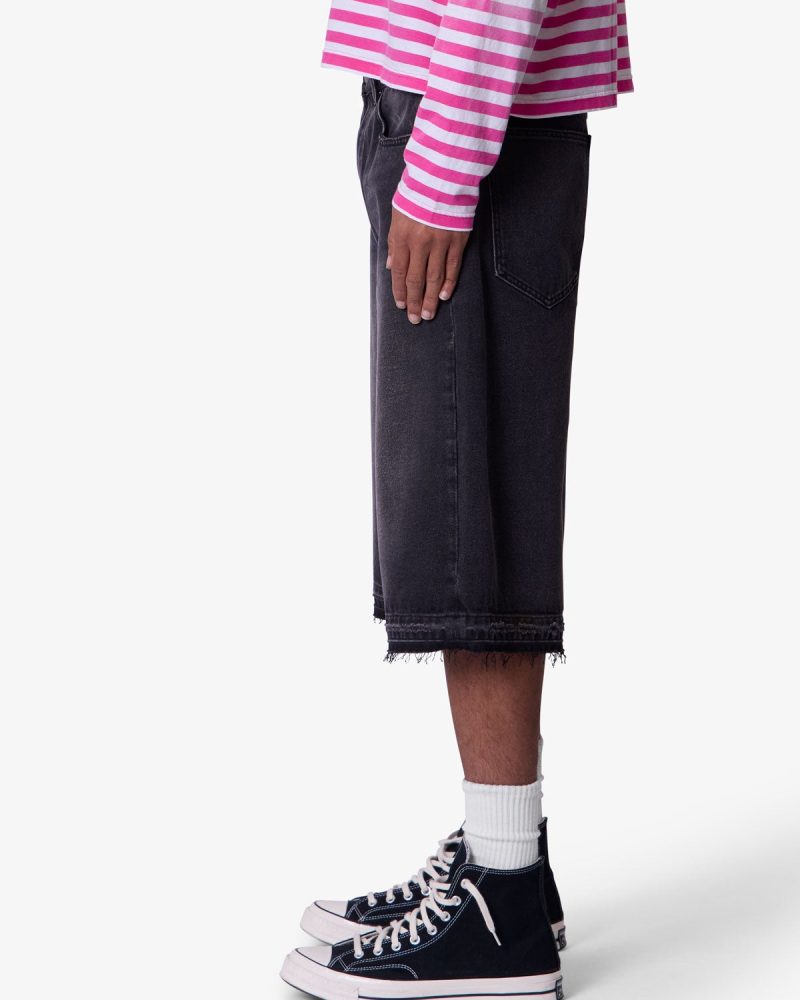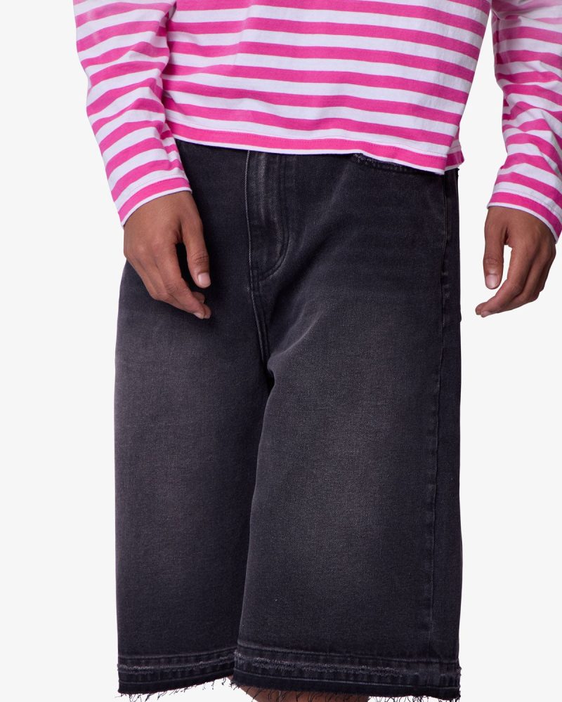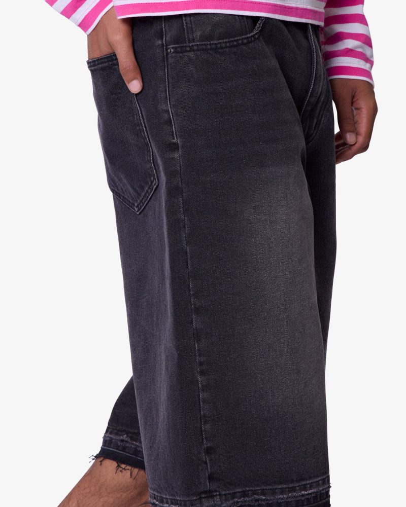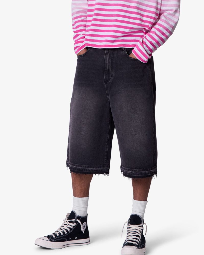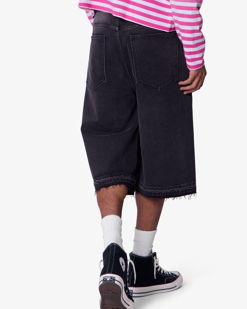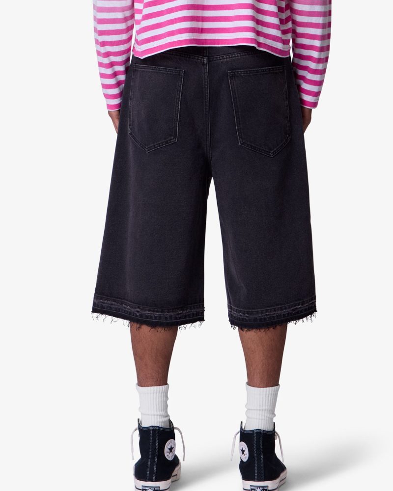 Constructed from a cotton-poly blend with a vintage black wash. these longline denim shorts feature a baggy Y2K-inspired silhouette with an extended inseam. Finished with subtle whiskering and faded detailing at the thighs for a worn-in look. The raw-cut released hem adds fraying detail at the edge.